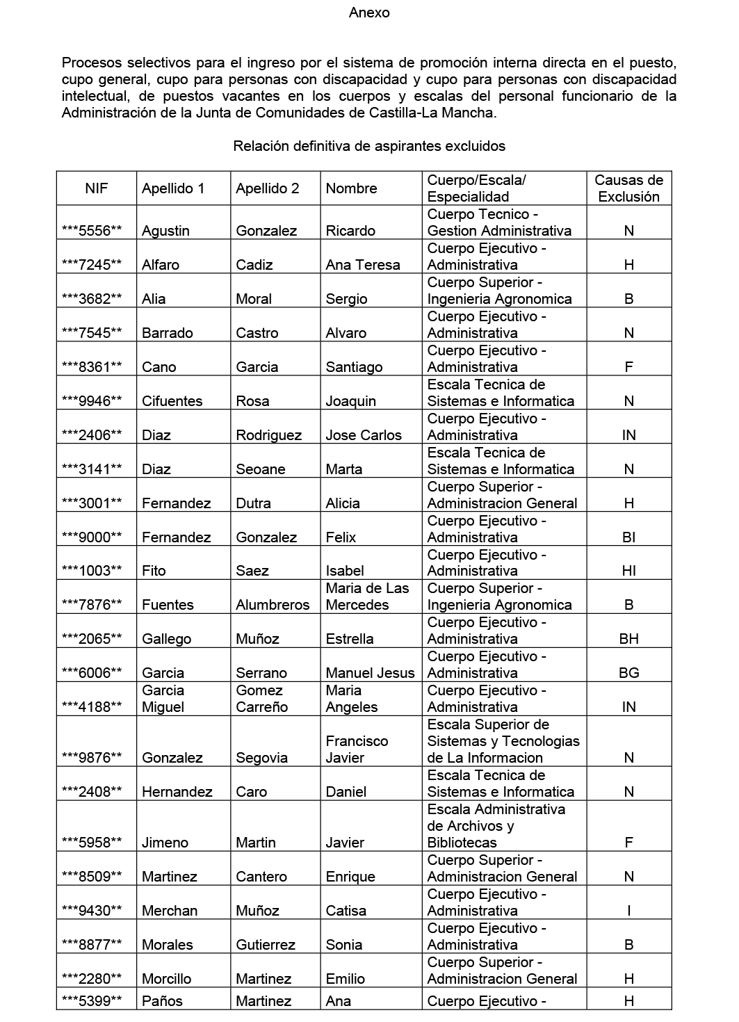 Resolución de 17/05/2023, de la Dirección General de la Función Pública, por la que se aprueba la relación definitiva de aspirantes admitidos y excluidos de su participación en los procesos selectivos para el ingreso por el sistema de promoción interna directa en el puesto, cupo general, cupo para personas con discapacidad y cupo para personas con discapacidad intelectual, de puestos vacantes en los cuerpos y escalas del personal funcionario de la Administración de la Junta de Comunidades de Castilla-La Mancha. [2023/4680]