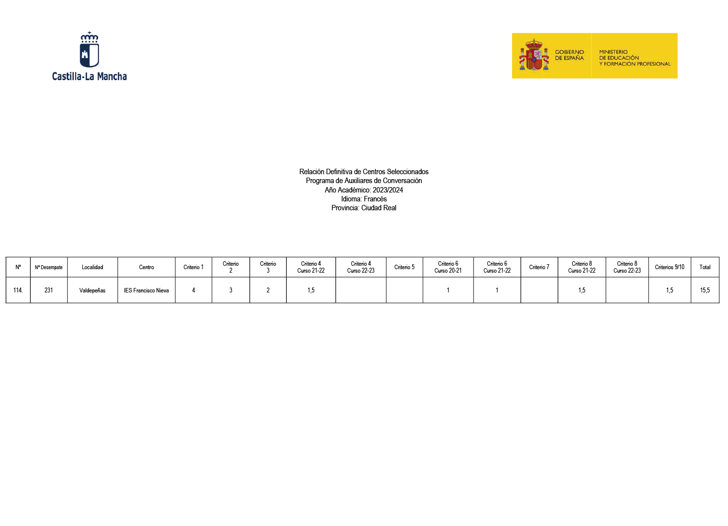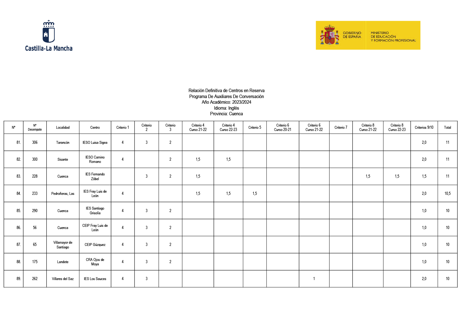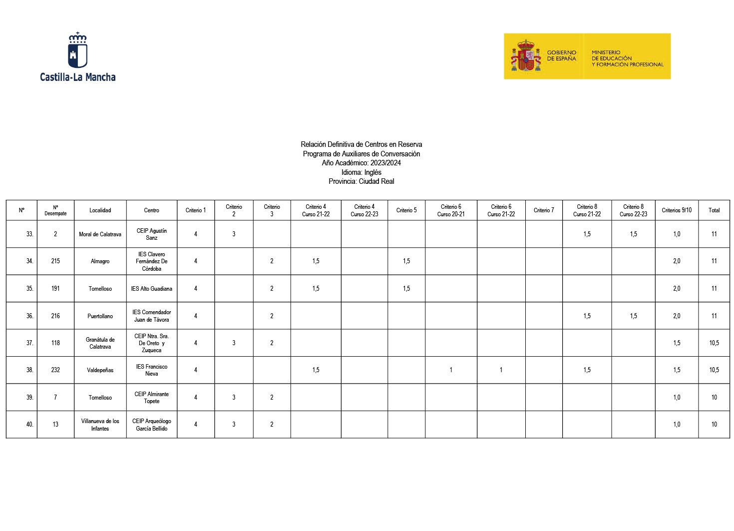 Resolución de 14/06/2023, de la Dirección General de Inclusión Educativa y Programas, por la que se publica la relación definitiva de centros seleccionados, centros en situación de reserva y centros que han presentado renuncia, en el procedimiento de adjudicación de auxiliares de conversación a centros educativos públicos de niveles no universitarios de la comunidad autónoma de Castilla-La Mancha para el curso académico 2023/2024. [2023/5483]