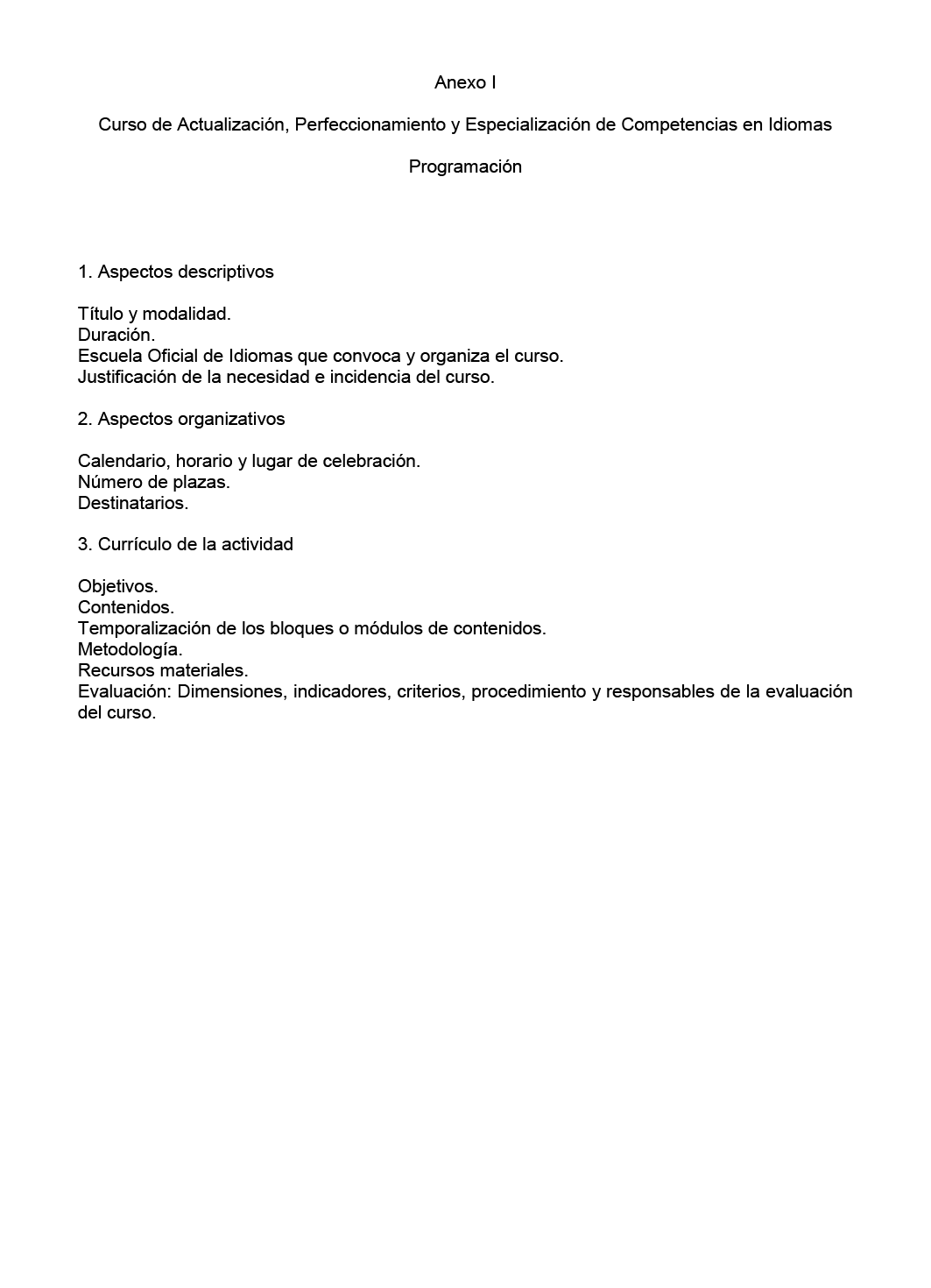 1. Las escuelas oficiales de idiomas que deseen impartir estos cursos monográficos deberán remitir una propuesta al Servicio de Inspección de Educación de la correspondiente Delegación Provincial de Educación, Cultura y Deportes, así como enviar copia al servicio con competencias en materia de enseñanzas de idiomas de régimen especial de la Consejería de Educación, Cultura y Deportes para su conocimiento. Junto con la propuesta, deberán presentar la programación del curso conforme al esquema establecido en el anexo I.