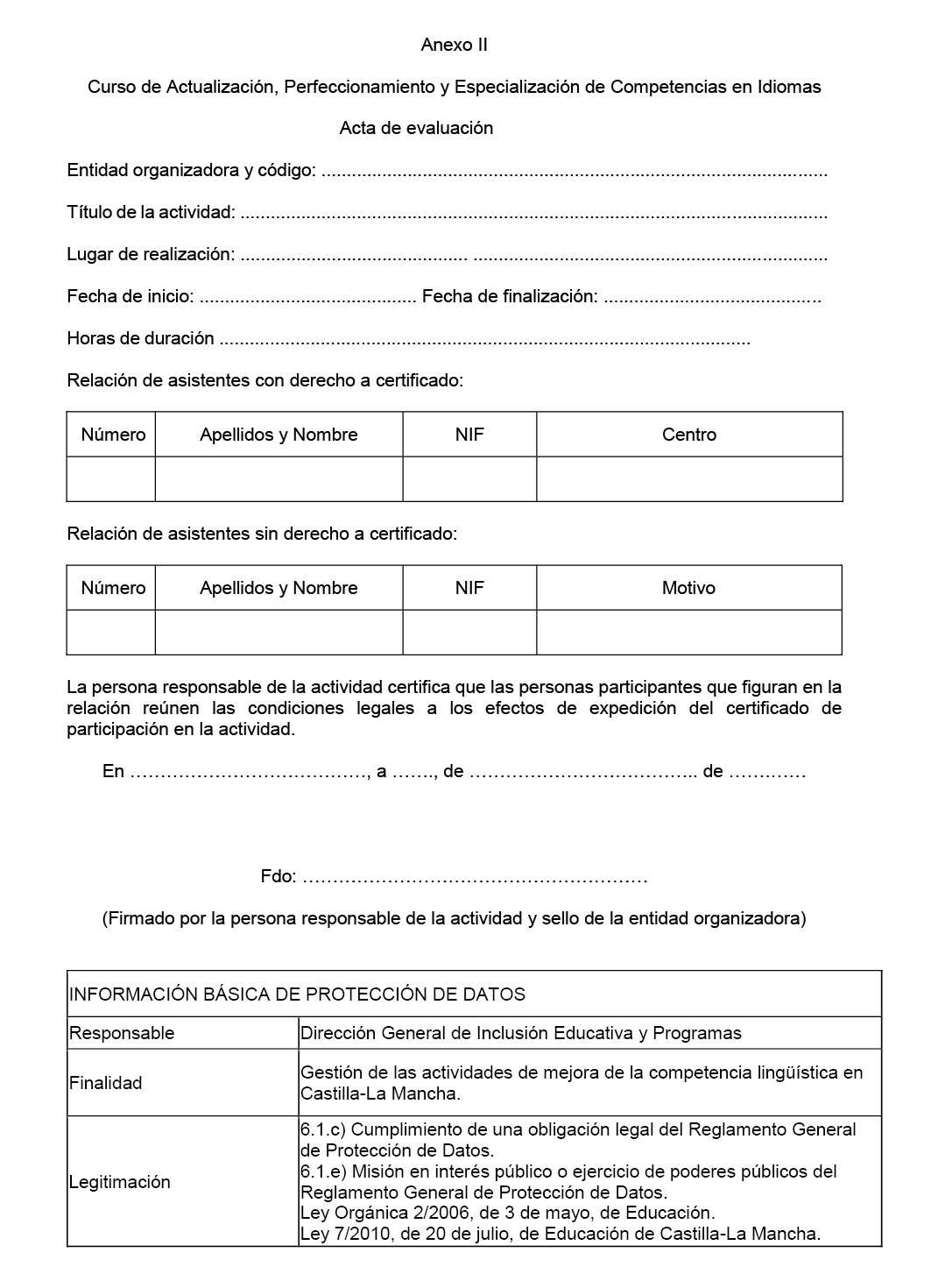 4. Para poder obtener la certificación, las escuelas oficiales de idiomas deberán remitir al servicio con competencias en materia de enseñanzas de idiomas de régimen especial, hasta el 30 de junio de 2024, una memoria final del curso que incluirá el acta de evaluación según el anexo II con la relación nominal de las personas asistentes con derecho a certificación y de las personas que no hayan superado la actividad especificando el motivo, y/o, en su caso, certificado de asistencia y participación a distancia, informe de evaluación y cuantos anexos con documentos elaborados se crean convenientes según lo establecido en el artículo 8 de la mencionada Orden de 8 de octubre de 2008.