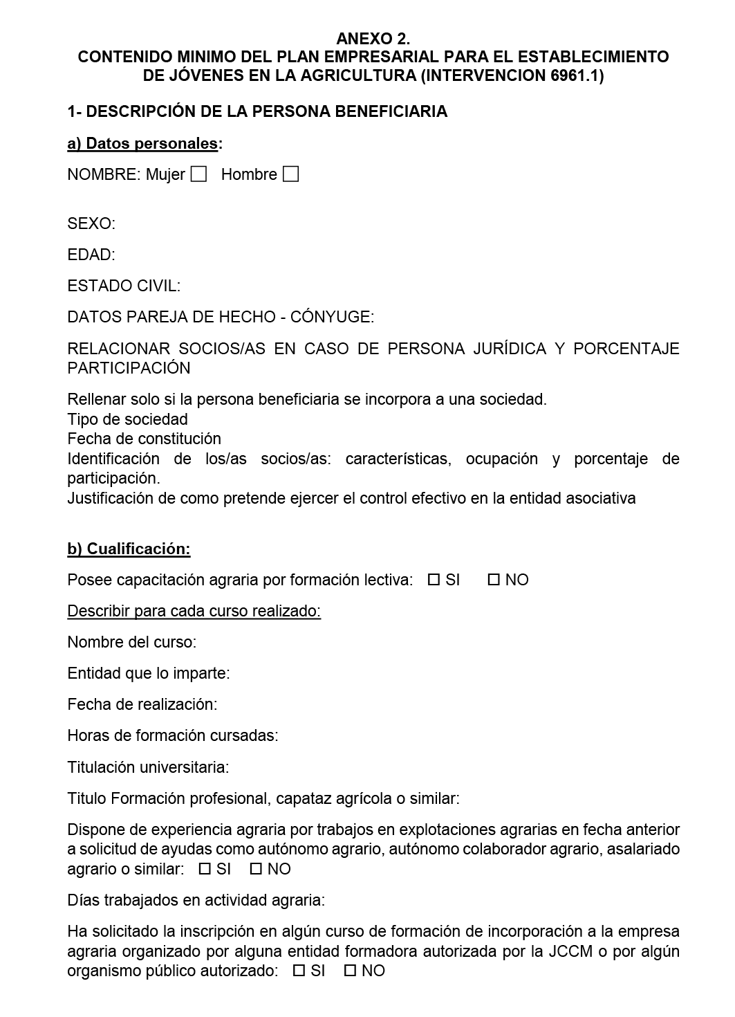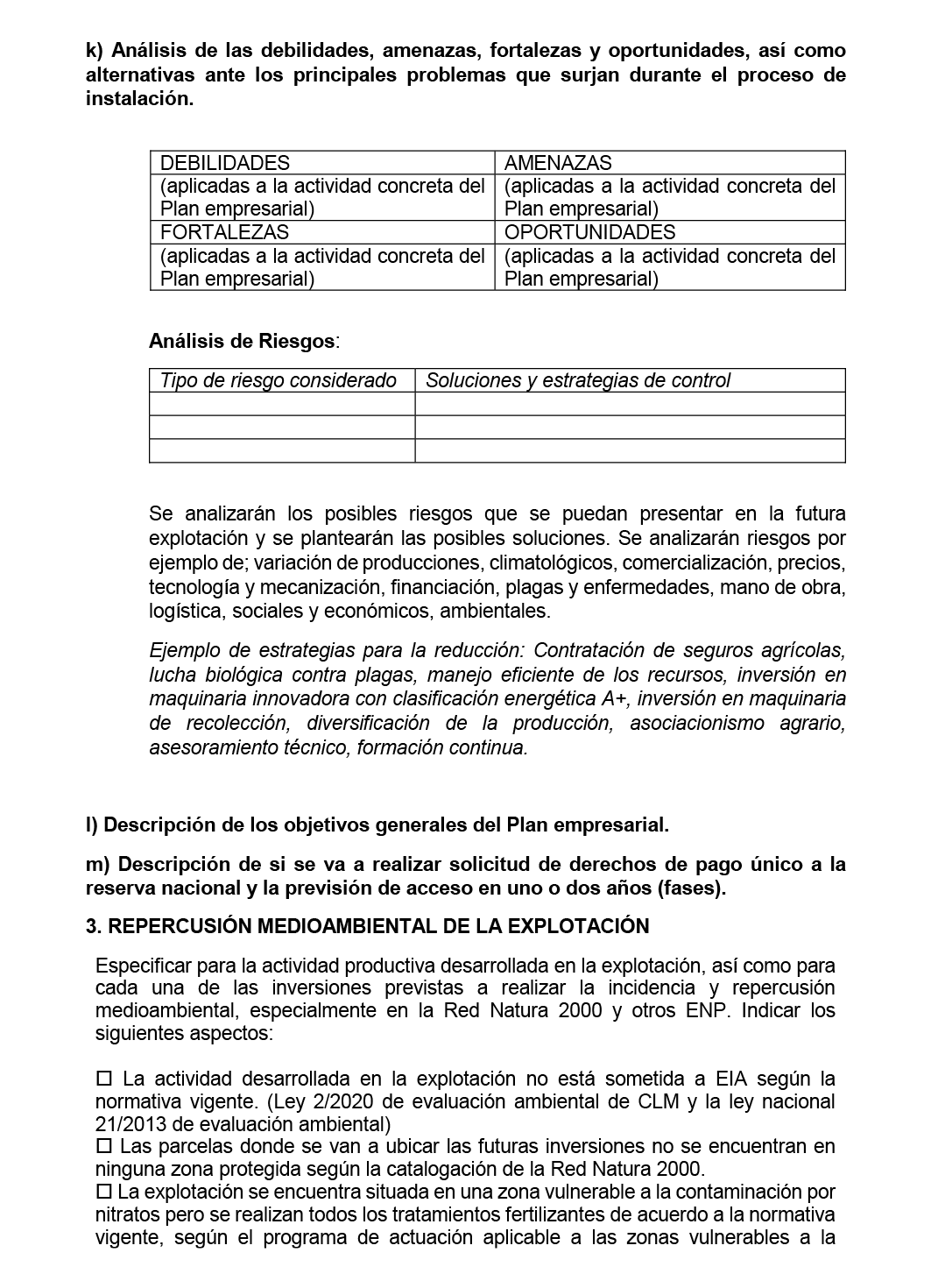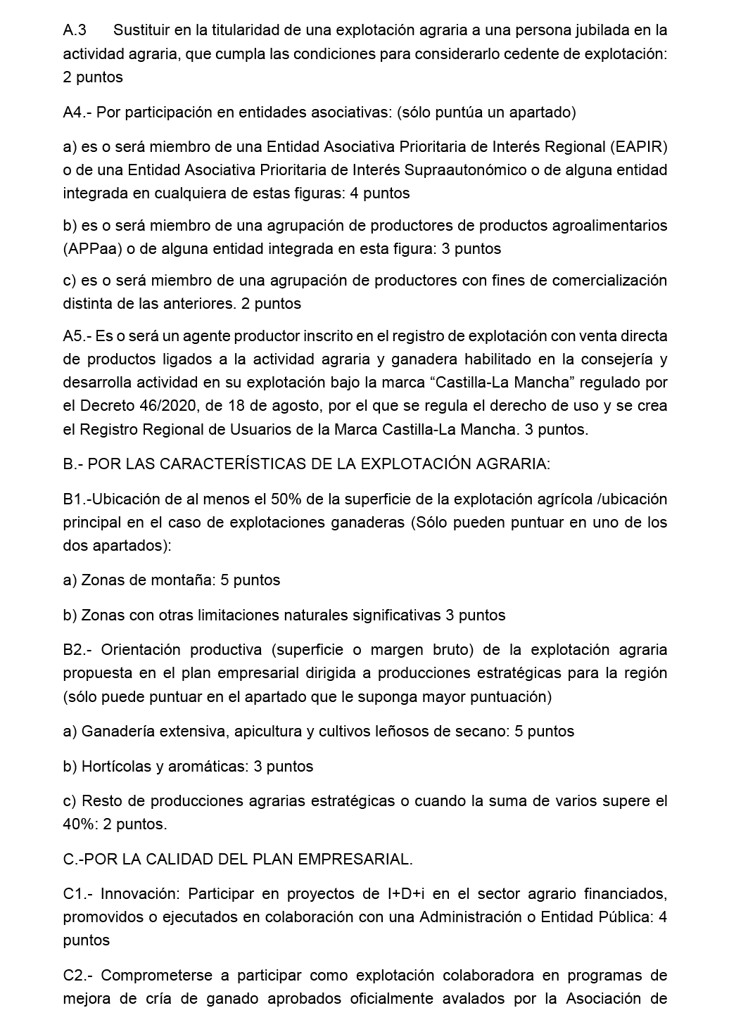 El medio rural de Castilla-La Mancha tiene entre sus características socioeconómicas principales el envejecimiento de la población activa agraria y la emigración de la población joven de las zonas rurales, lo que determina la necesidad de promover medidas que incentiven la incorporación de personas jóvenes cualificadas a la actividad agraria que aseguren el relevo generacional en el sector. Es preciso facilitar las inversiones de las nuevas explotaciones agrarias en las que se ha instalado una persona joven para garantizar su competitividad y fomentar su continuidad en el sector agrario apoyando su iniciativa y la innovación que supone la incorporación de nuevas técnicas de producción, con especial relevancia de la digitalización de las explotaciones.