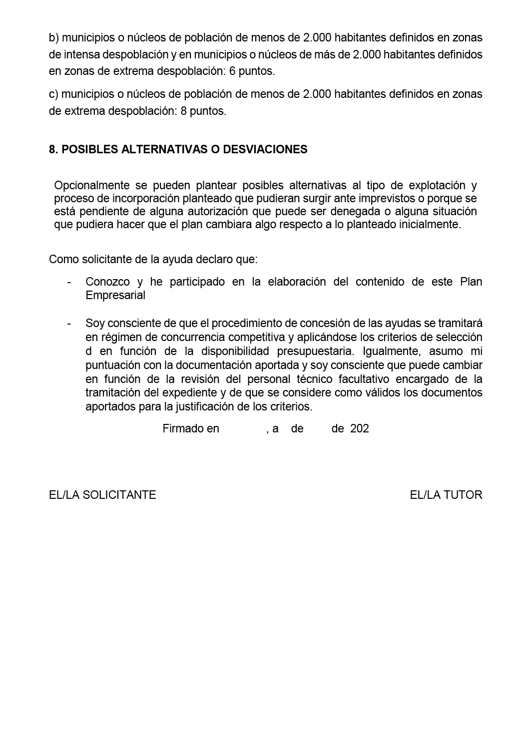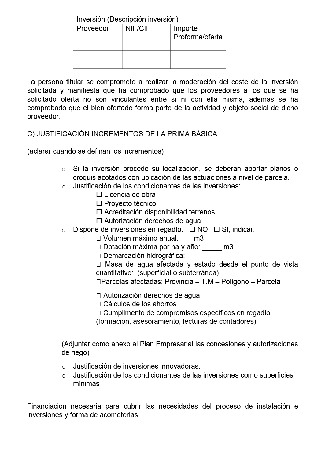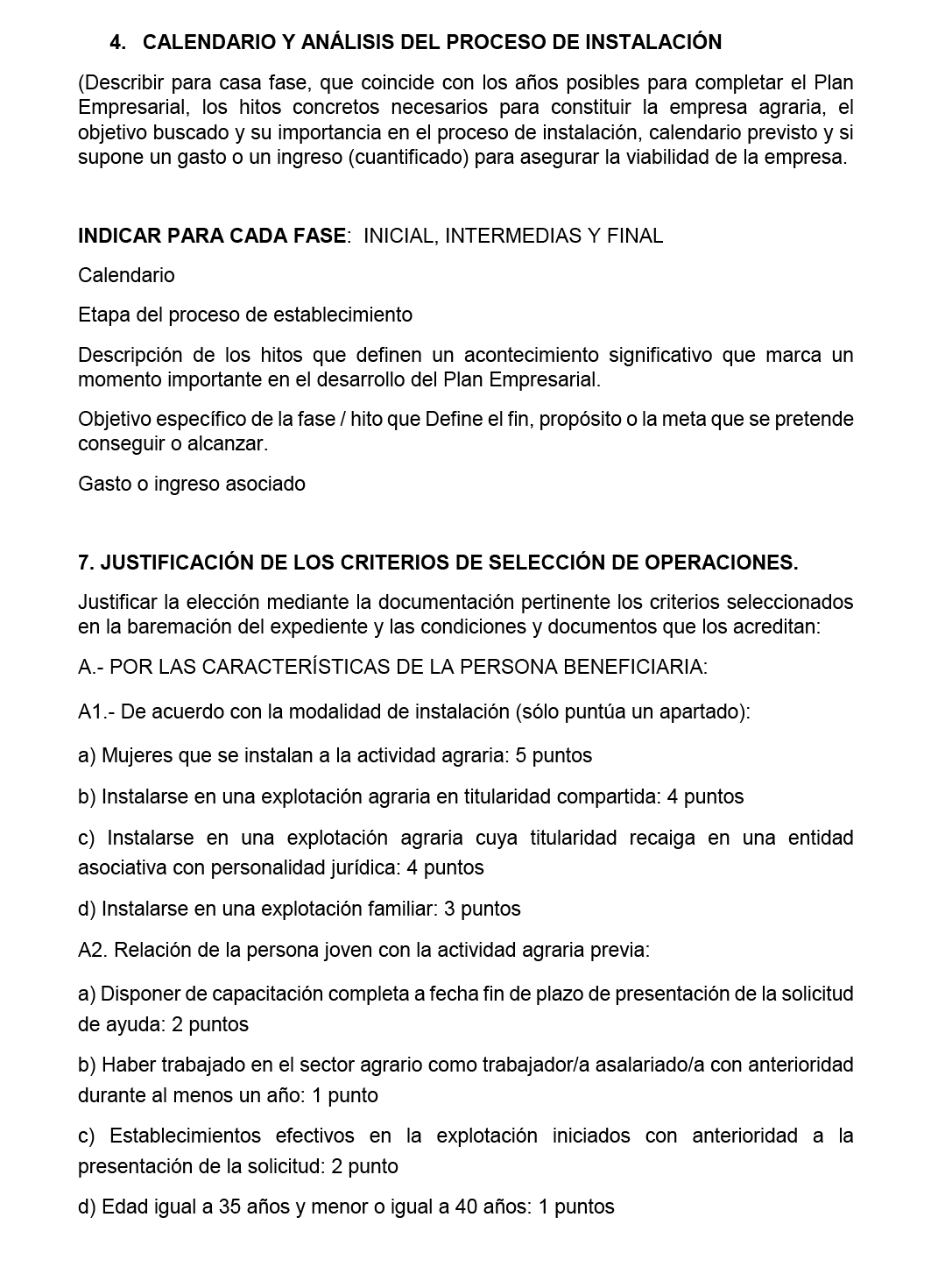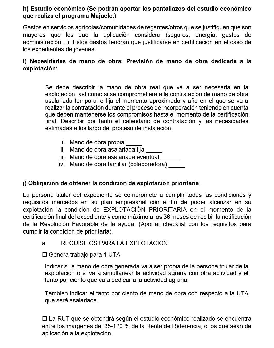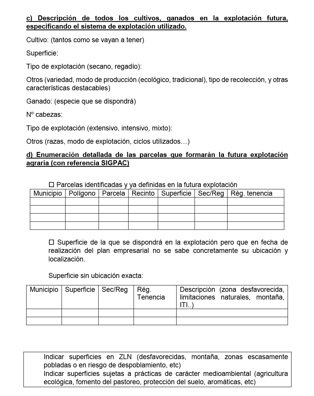 22. Plan empresarial: Documento que describe la situación inicial de la explotación agraria, las fases y objetivos para el desarrollo de las actividades de la explotación, así como los detalles de las actuaciones, incluidos los relacionados con la sostenibilidad medioambiental y la eficiencia de los recursos, necesarios para el desarrollo de las actividades de la explotación agraria, que incluyan inversiones y gastos asociados a la explotación, además de otras tales como: formación y/o capacitación, asesoramiento, condiciones para ejercer el control efectivo de la explotación (jefe/a de explotación) y acreditación de la viabilidad técnica y económica.