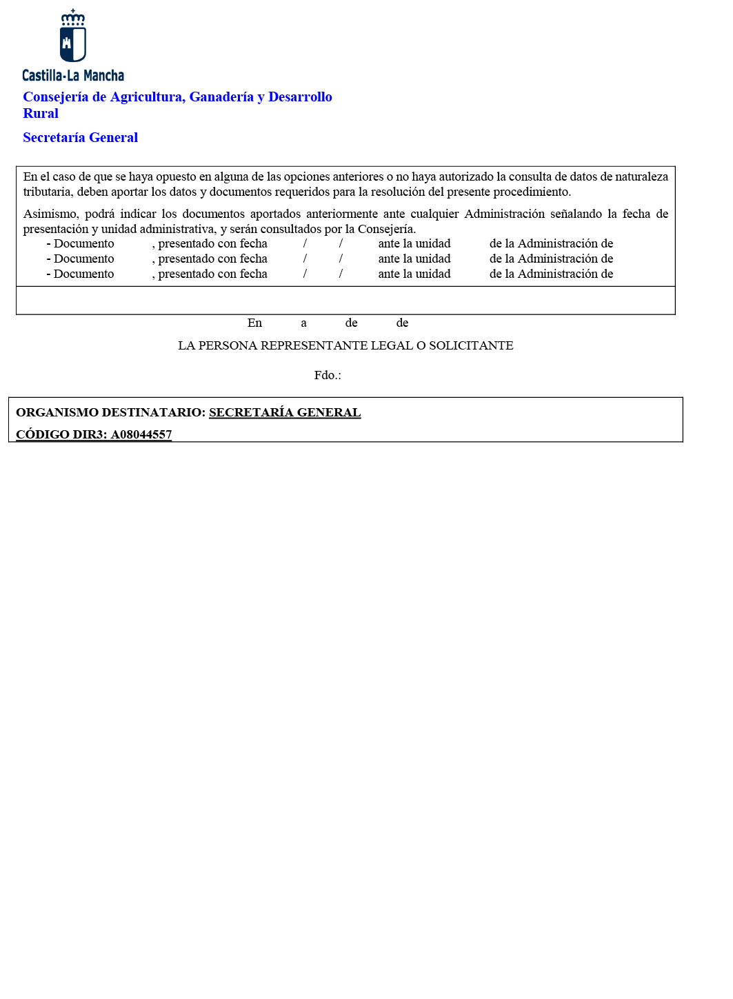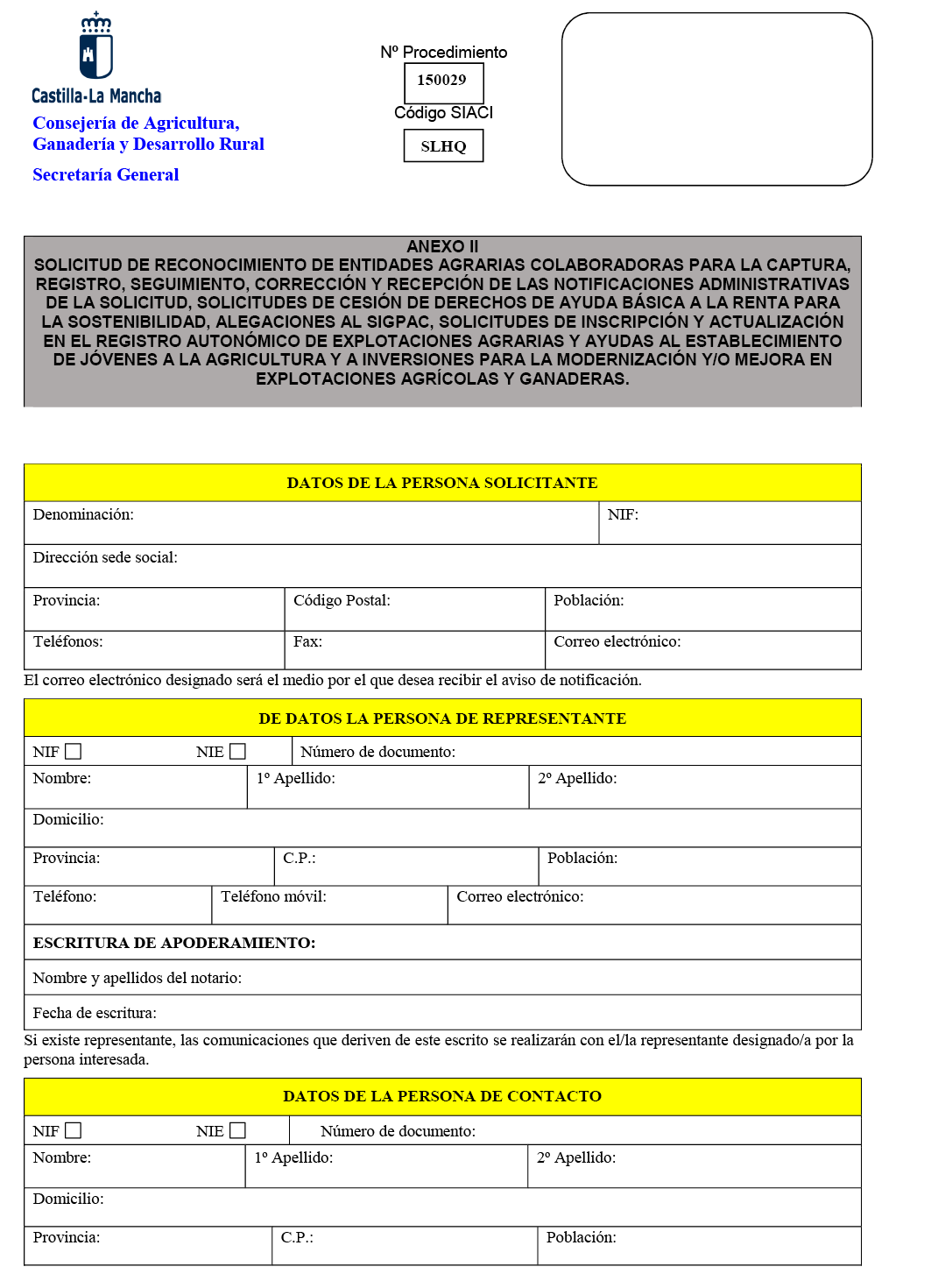 A tal efecto, por Orden de la Consejería de Agricultura, Ganadería y Desarrollo Rural, se establecerá, para cada campaña, el modelo de solicitud única de las ayudas de la Política Agrícola Común en Castilla-La Mancha, su forma y plazo de presentación, entre la que figurará expresamente que se podrá presentar mediante las entidades agrarias reconocidas, estableciéndose de este modo instrumentos de colaboración que permitan poner a disposición del sector agrario los mecanismos y puntos de captura, registro, seguimiento y corrección de las solicitudes de ayuda incluidas en la solicitud única, solicitudes de cesión de derechos de ayuda básica a la renta para la sostenibilidad, alegaciones al Sigpac, tramitación de ayudas al establecimiento de jóvenes a la agricultura y a inversiones para la modernización y/o mejora en explotaciones agrícolas y ganaderas, así como el lugar de notificación de las personas agricultoras y ganaderas que les hayan autorizado expresamente en tal sentido, de acuerdo con lo previsto en el artículo 41 de la Ley 39/2015, de 1 de octubre, del Procedimiento Administrativo Común de las Administraciones Públicas.