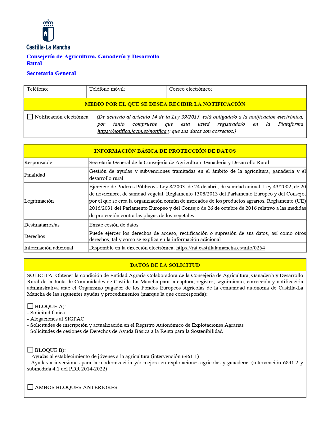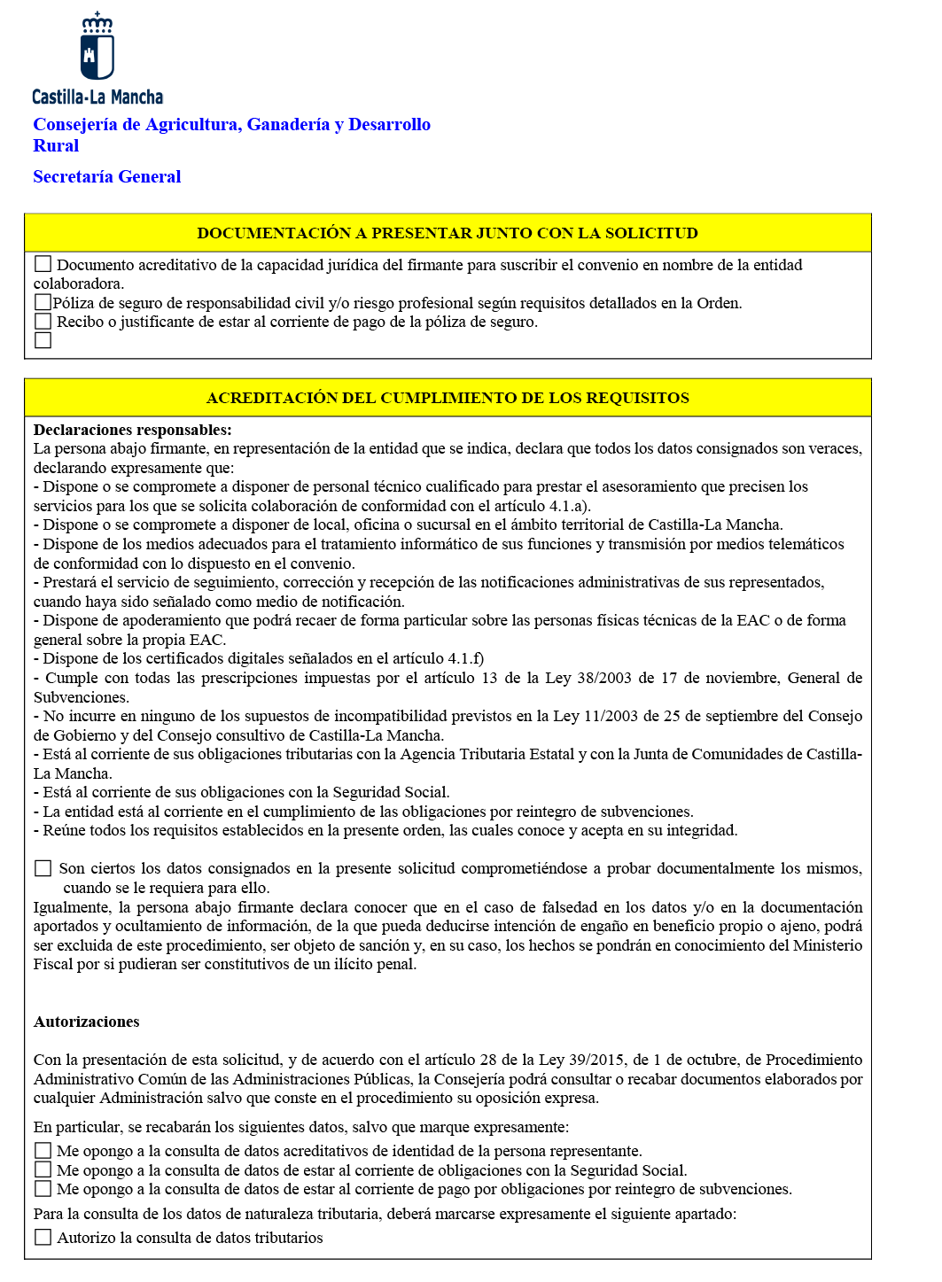 La orden tiene como objeto establecer los requisitos y procedimiento para seleccionar las entidades que podrán acceder a la condición de Entidad Agraria Colaboradora (EAC) reconocida por la Consejería de Agricultura, Ganadería y Desarrollo Rural para que actúen por cuenta y nombre de las personas que ejerzan la actividad agraria, obtengan el apoderamiento de estas para la captura, registro, seguimiento, corrección y notificación administrativa ante el Organismo pagador de los Fondos Europeos Agrícolas de Castilla-La Mancha de las siguientes ayudas y procedimientos: