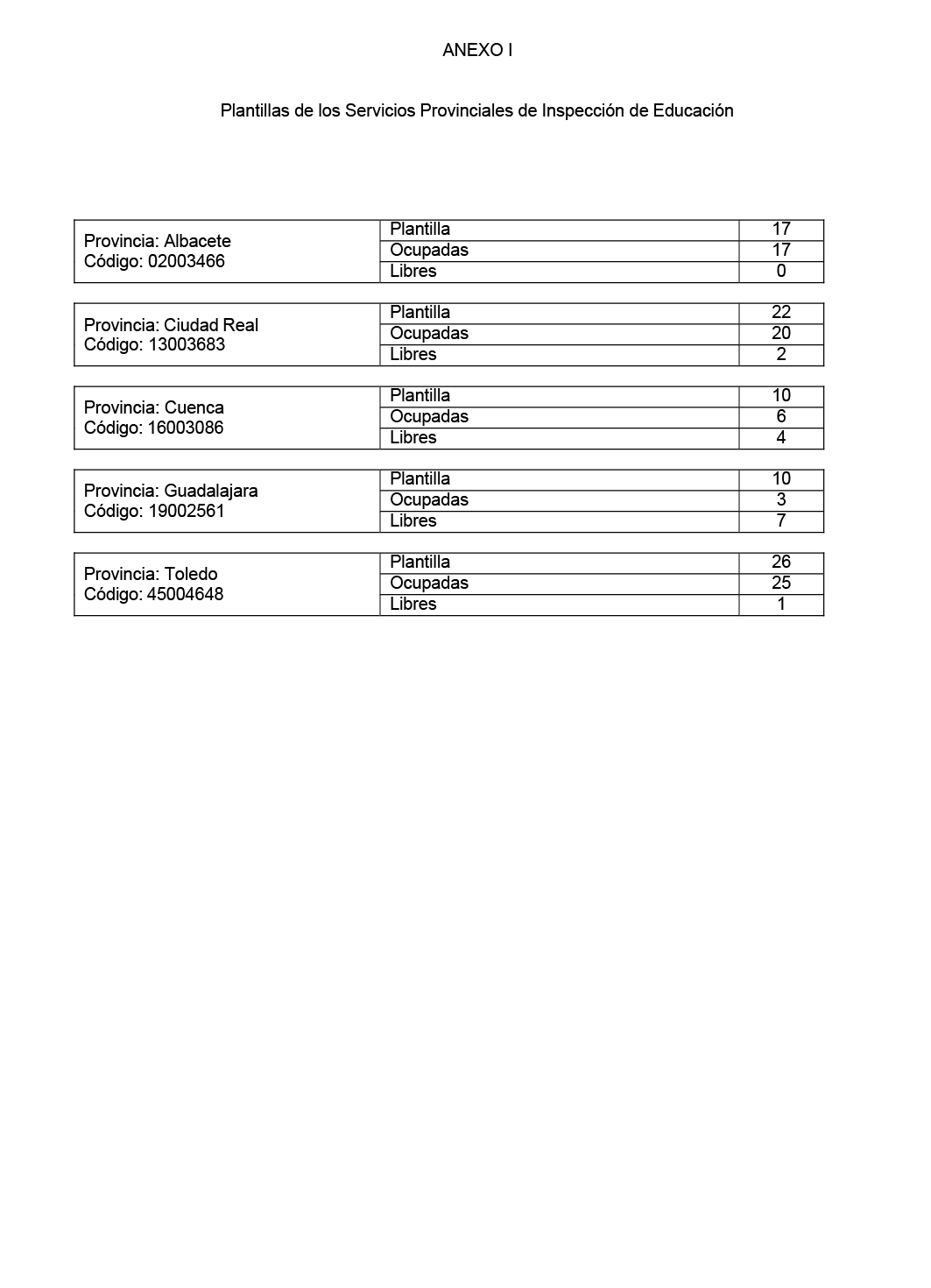 Hacer públicas las plantillas orgánicas de los Servicios Provinciales de Inspección de Educación de la Consejería de Educación, Cultura y Deportes que se indican en el anexo I de la presente orden.