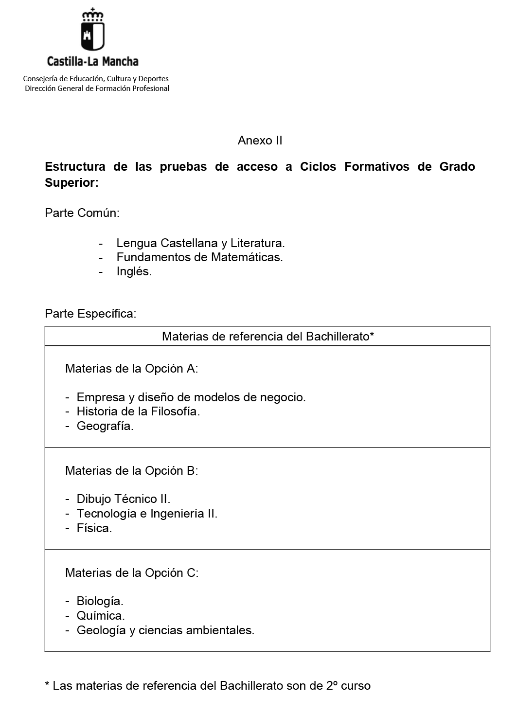 2. Los contenidos de las materias de las que consta la prueba de acceso a ciclos formativos de grado superior, tendrán como referencia lo establecido en el Decreto 83/2022, de 12 de julio, por el que se establece la ordenación y el currículo de Bachillerato en la comunidad autónoma de Castilla-La Mancha, para las asignaturas de segundo curso de Bachillerato.