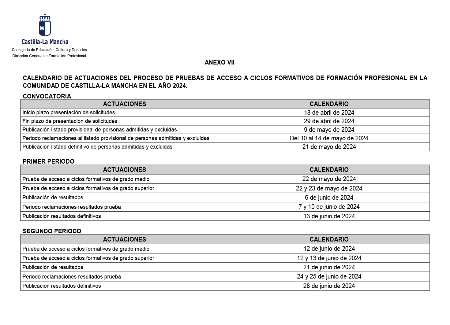 Resolución de 04/04/2024, de la Viceconsejería de Educación, Universidades e Investigación, por la que se convoca la realización de pruebas de acceso a ciclos formativos de Formación Profesional en la comunidad autónoma de Castilla-La Mancha en el año 2024. [2024/2719]