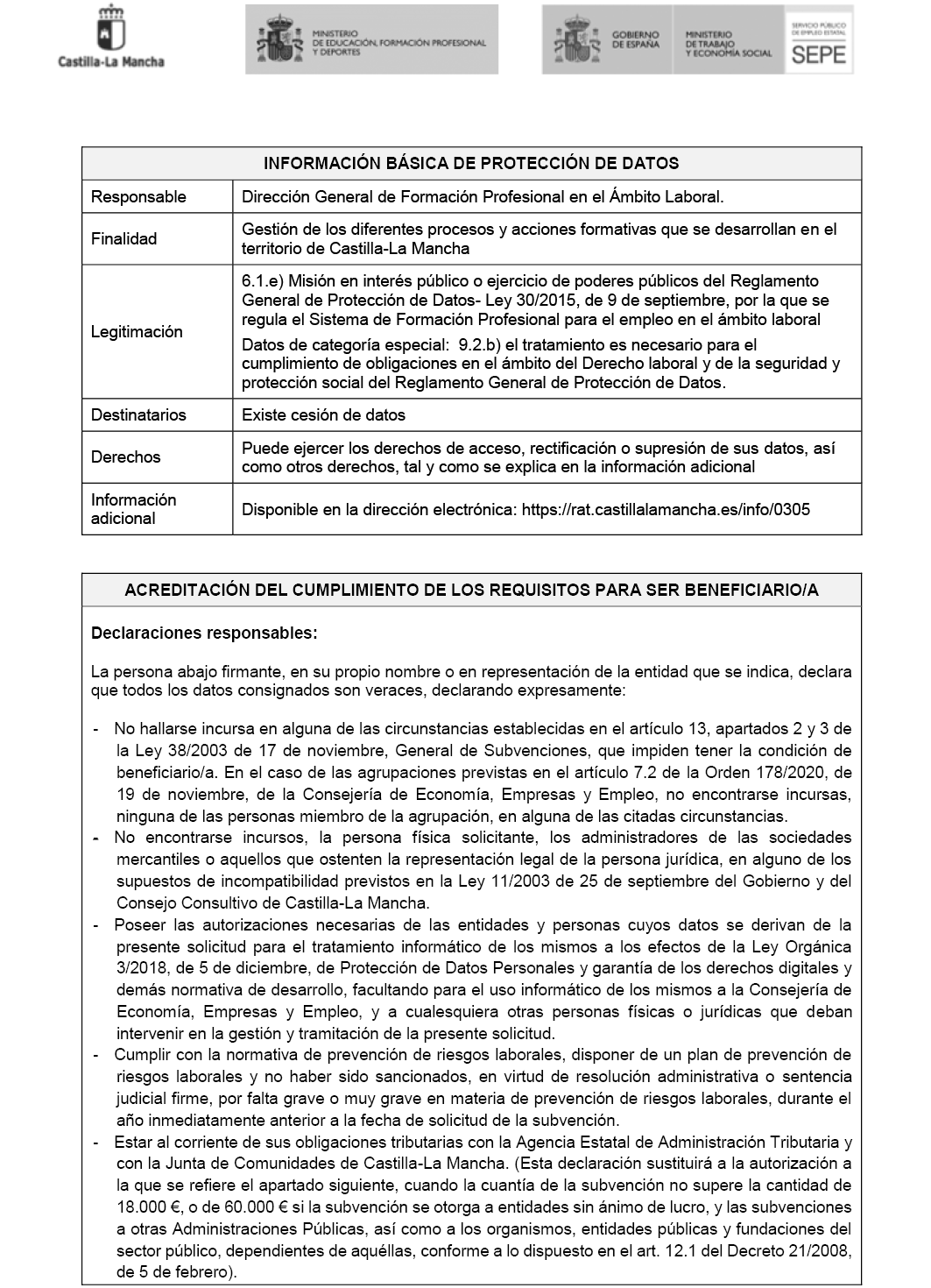Mediante Orden 178/2020, de 19 de noviembre, de la Consejería de Economía, Empresas y Empleo, publicada en el Diario Oficial de Castilla-La Mancha núm. 235 de 20 de noviembre, se establecieron las bases reguladoras en materia de programación, gestión y evaluación de la formación profesional para el empleo en el ámbito laboral en Castilla-La Mancha y por la que se establecen las bases reguladoras de concesión de subvenciones públicas para su realización.