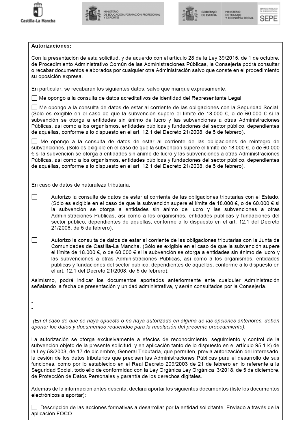 Con independencia de las obligaciones que en materia de publicidad activa se establezcan para las entidades beneficiarias de la subvenciones en la legislación vigente sobre transparencia, acceso de la ciudadanía a la información pública y buen gobierno, las entidades beneficiarias, para dar la adecuada publicidad al carácter público de la financiación de las acciones formativas que constituyen el objeto de la subvención, deberán incluir en las actividades de información de las acciones formativas, publicaciones, contratos, material didáctico y acreditación de la realización de la formación a entregar a las personas participantes, en la documentación utilizada, así como en la señalización exterior de centros y lugares donde se realizan aquellas, la imagen institucional de la Junta de Comunidades de Castilla-La Mancha y la del Ministerio de Trabajo y Economía Social, en este último caso, de conformidad con lo dispuesto en el anexo IV de la Orden TES/630/2023, de 14 de junio, por la que se distribuyen territorialmente para el ejercicio económico de 2023, para su gestión por las comunidades autónomas con competencias asumidas, créditos del ámbito laboral financiados con cargo a los Presupuestos Generales del Estado, no financiados con el Mecanismo de Recuperación y Resiliencia.
