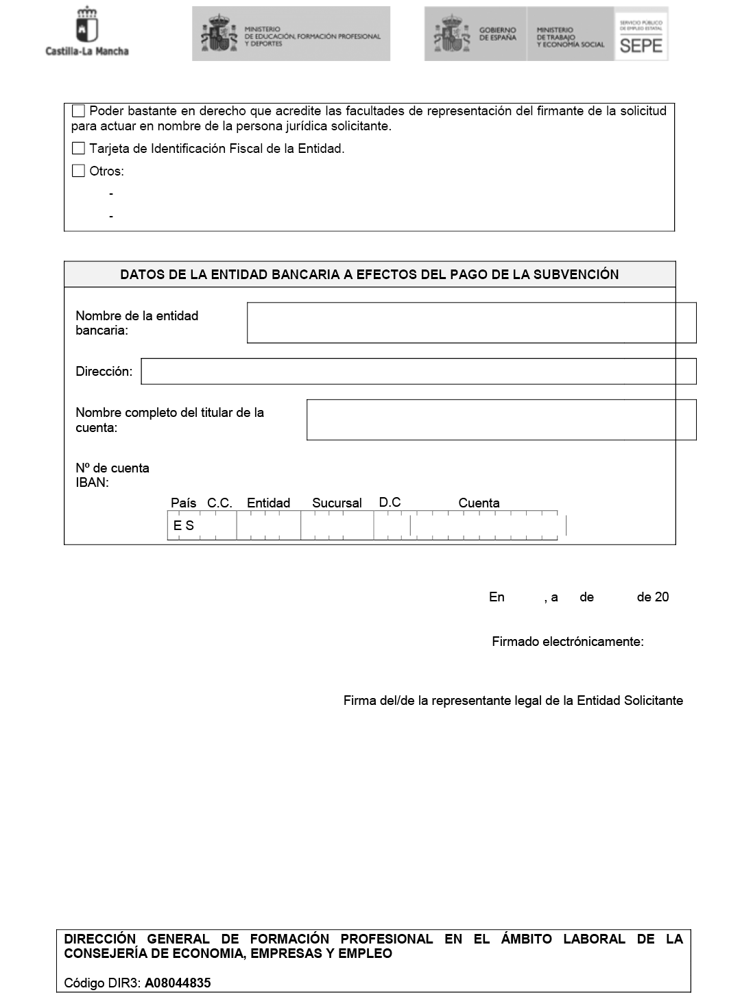 a) Preferentemente de forma telemática con firma electrónica, a través del formulario incluido en la sede electrónica de la Administración de la Junta de Comunidades de Castilla-La Mancha (https://www.jccm.es Código Siaci de búsqueda KM3V). Al presentarse de esta forma, los documentos a aportar podrán ser digitalizados y presentados junto con la solicitud como archivos anexos a la misma.