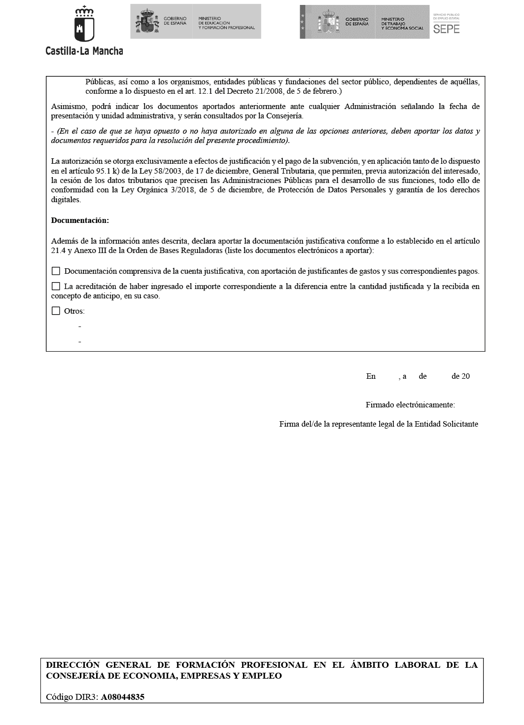 Forma de pago: Las entidades beneficiarias, una vez dictada la resolución de concesión, podrán solicitar un pago con carácter previo al inicio de la actividad formativa por importe del 25 por ciento del importe concedido. Igualmente, podrán solicitar el pago de un 35 por ciento adicional, una vez acreditado el inicio de la actividad formativa. El 40 por ciento restante del importe concedido se hará efectivo, una vez finalizada y justificada la actividad formativa subvencionada.