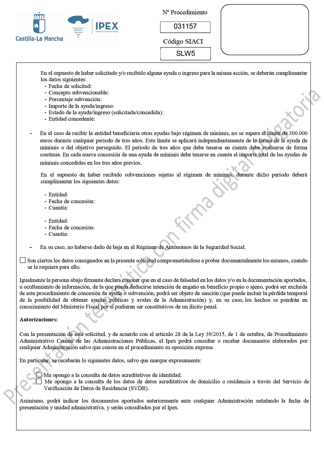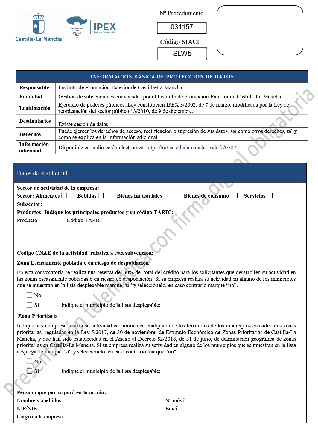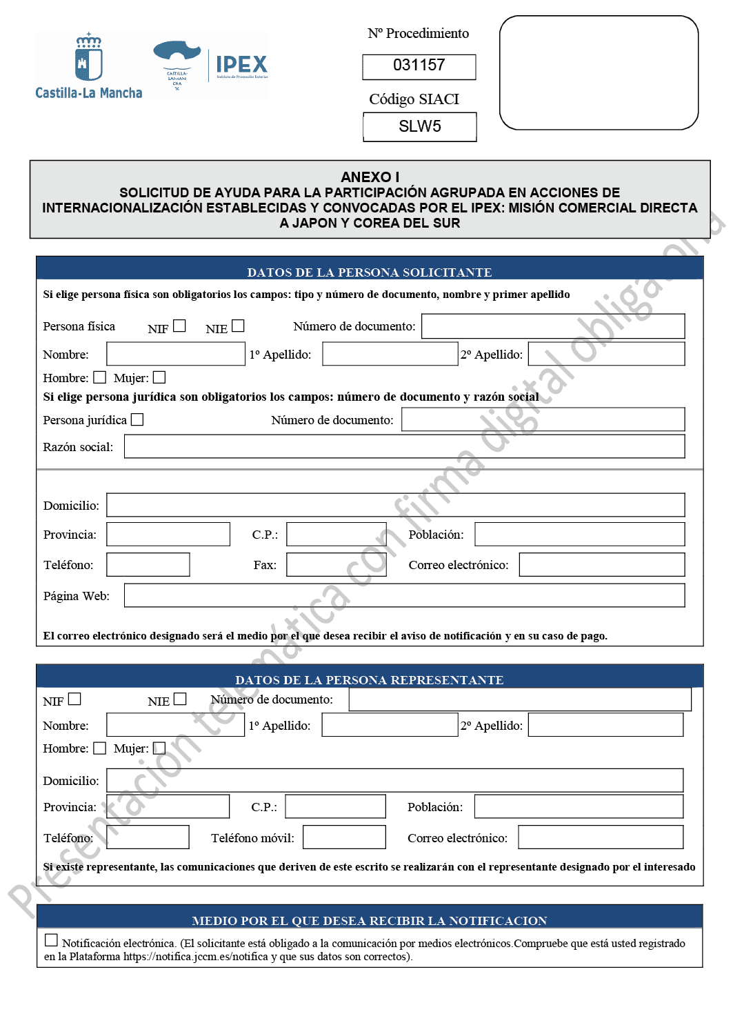 3. Las solicitudes se presentarán de forma telemática con firma electrónica, a través del formulario que se incluye como Anexo I de la presente Resolución, que se encontrará disponible en la sede electrónica de la Administración de la Junta de Comunidades de Castilla-La Mancha (https://www.jccm.es/). Al presentarse de esta forma, la documentación a aportar podrá ser digitalizada y presentada junto a la solicitud como archivos anexos a la misma. No se admitirán a trámite las solicitudes presentadas por medios distintos al anteriormente señalado.