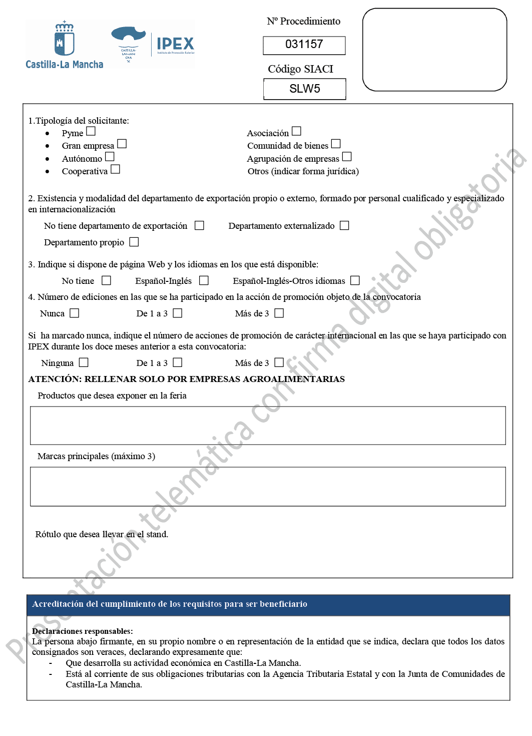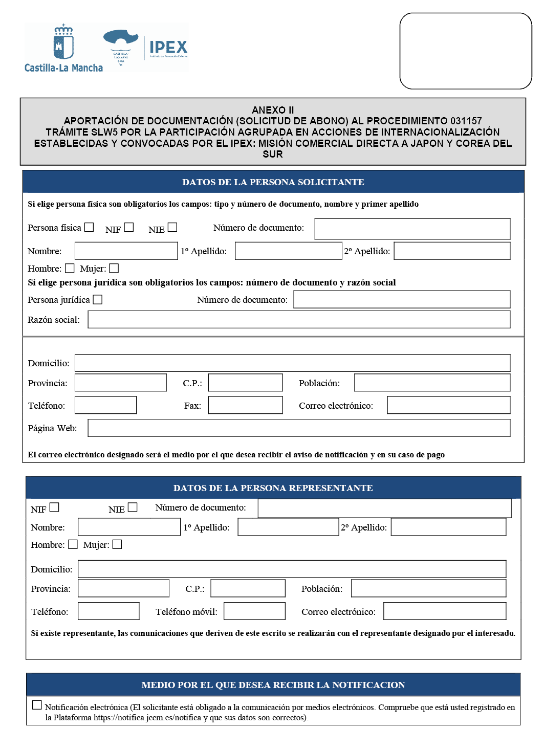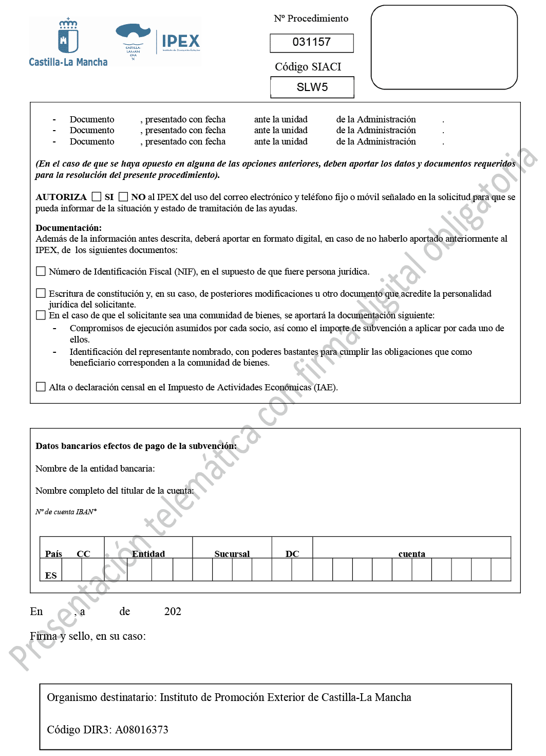 3. Las solicitudes se presentarán de forma telemática con firma electrónica, a través del formulario que se incluye como Anexo I de la presente Resolución, que se encontrará disponible en la sede electrónica de la Administración de la Junta de Comunidades de Castilla-La Mancha (https://www.jccm.es/). Al presentarse de esta forma, la documentación a aportar podrá ser digitalizada y presentada junto a la solicitud como archivos anexos a la misma. No se admitirán a trámite las solicitudes presentadas por medios distintos al anteriormente señalado.