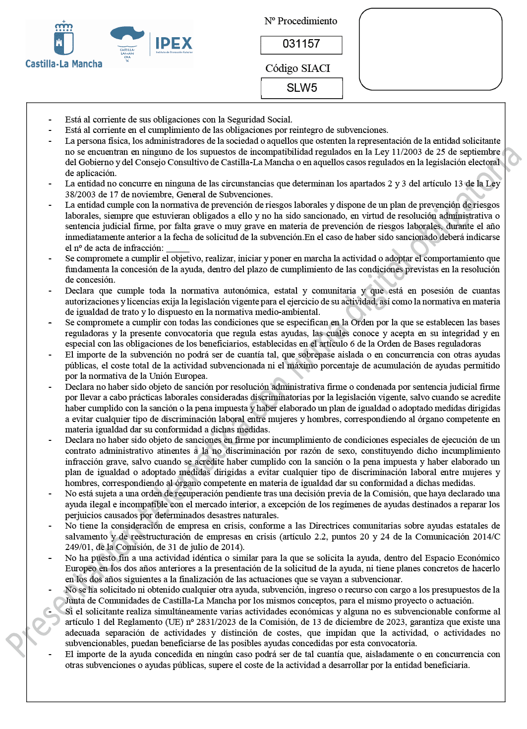 e) No haber solicitado ni obtenido cualquier otra ayuda, subvención, ingreso o recurso con cargo a los presupuestos de la Junta de Comunidades de Castilla-La Mancha por los mismos conceptos, para el mismo proyecto o actuación.