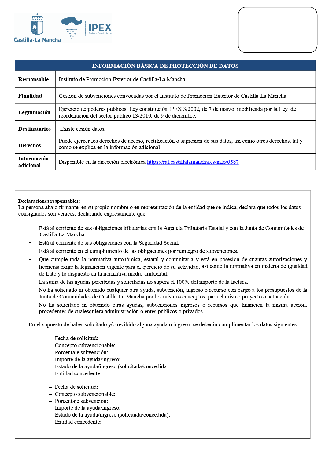 1. En cumplimiento de la Ley Orgánica 3/2018, de 5 de diciembre, de Protección de Datos Personales y garantía de los derechos digitales y del Reglamento 2016/679 del Parlamento Europeo y del Consejo de 27 de abril de 2016 relativo a la protección de las personas físicas en lo que respecta al tratamiento de datos personales y a la libre circulación de estos datos, se informa que los datos de carácter personal que consten en las solicitudes formuladas, serán incluidos en un registro de actividades de tratamiento, titularidad del Instituto de Promoción Exterior de Castilla-La Mancha, cuya finalidad será la gestión de la correspondiente subvención y aquellas otras competencias que el mismo tiene encomendadas. Las cesiones que se producen son las autorizadas en la legislación aplicable.