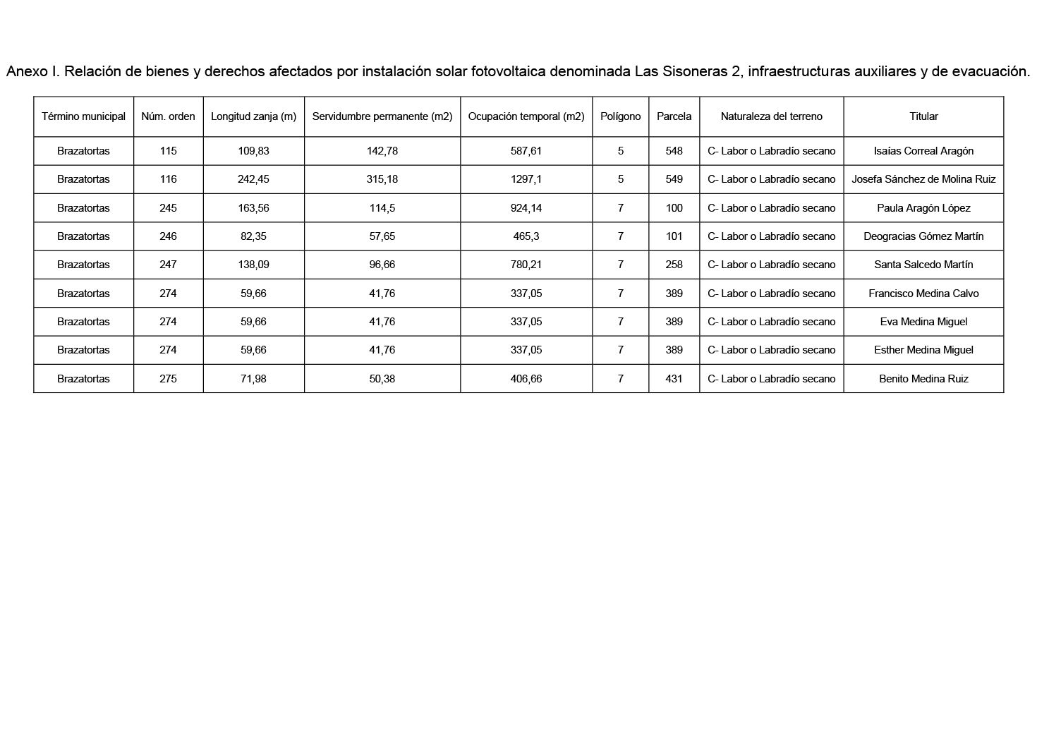 - Ubicación: La planta ocupará diversas parcelas de los polígonos 5 y 6 del T.M. de Brazatortas, siendo la coordenada del centro X 388956.80Y: 4279407.76 ocupando una superficie vallada aproximada de 73,18 ha. La línea de evacuación tiene su inicio en X: 389165.93 Y: 4278930.21 y su final en X: 390435.39 Y: 4279053.14 y atravesará varias parcelas de los polígonos 5 y 6 del T.M. de Brazatortas.