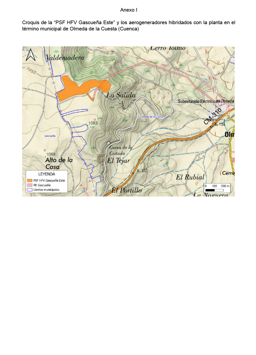 El objeto del proyecto sería la instalación de la HFV Gascueña Este, de 3 MW, así como todas las infraestructuras necesarias para conducir la energía generada hasta su conexión con LAAT existente y construida dentro del proyecto Parque Eólico Gascueña Este. La planta fotovoltaica proyectada se hibridará, de este modo, con el parque eólico existente. La parcela afectada por la PSF (área comprendida dentro del vallado) es la 13 del polígono 511 del término municipal de Olmeda de la Cuesta (Cuenca). En el anexo 1 se muestra un croquis aproximado de la HFV Gascueña Este junto con el parque eólico con el que se hibrida y la línea de evacuación proyectada.