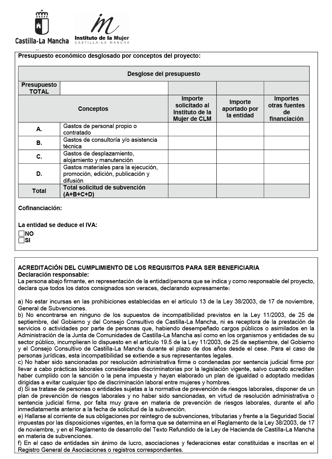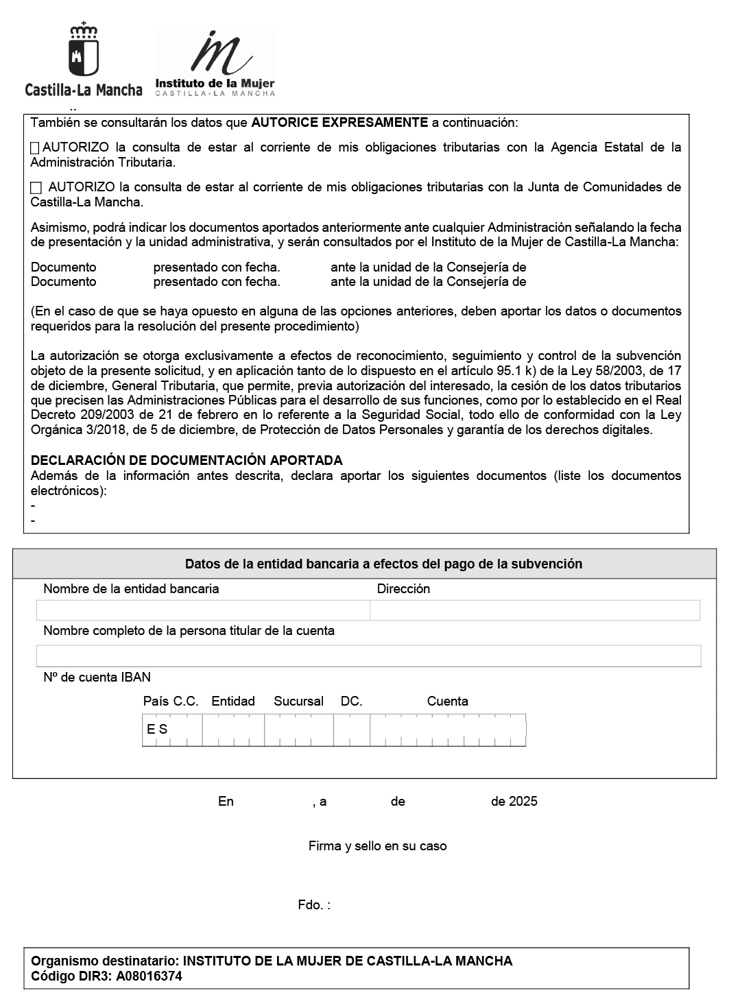 A la solicitud deberá adjuntarse la documentación requerida en el artículo 25.2 de la Orden 40/2023, de 23 de febrero, de la Consejería de Igualdad y Portavoz, por la que se establecen las bases reguladoras de las subvenciones para impulsar la igualdad de género, la prevención de la violencia machista y la no discriminación. En el caso de la acreditación de estar al corriente en el cumplimiento de las obligaciones tributarias con la Agencia Estatal de Administración Tributaria, con la Hacienda de la Junta de Comunidades de Castilla-La Mancha y frente a la Seguridad Social, así como del cumplimiento de las obligaciones por reintegro de subvenciones, la declaración responsable sustituirá a las certificaciones acreditativas de tales extremos, de acuerdo con lo previsto en el artículo 12.1 del Decreto 21/2008, de 5 de febrero.