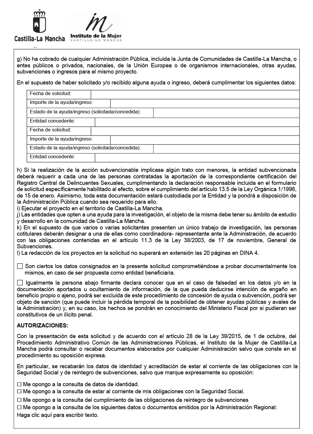 La Orden 40/2023, de 23 de febrero, de la Consejería de Igualdad y Portavoz, por la que se establecen las bases reguladoras de las subvenciones para impulsar la igualdad de género, la prevención de la violencia machista y la no discriminación, publicada en el DOCM de 02/03/2023, incluye entre los proyectos subvencionables los dirigidos a las ayudas para la investigación a través de proyectos dirigidos a orientar e impulsar ámbitos de investigación emergentes en el contexto de las relaciones de género y profundizar en el conocimiento de la igualdad entre mujeres y hombres de Castilla-La Mancha, y el estudio de todas las manifestaciones de la violencia de género, haciendo visibles, desde la perspectiva de género, las diversas situaciones en las que mujeres y hombres se encuentran.