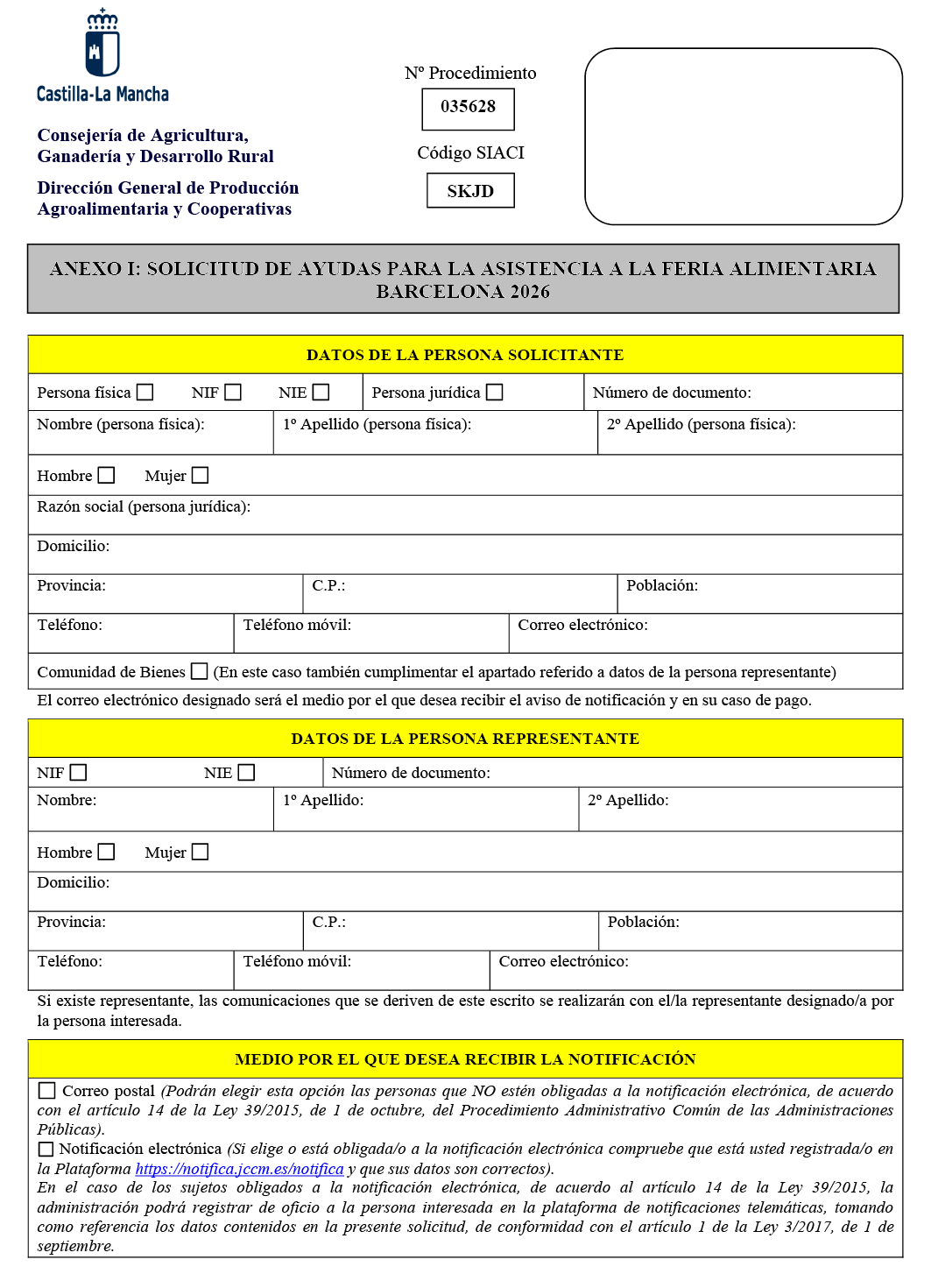 1. La presente resolución tiene por objeto convocar, por el procedimiento de tramitación anticipada, para el año 2026, las ayudas en especie para la asistencia a la feria agroalimentaria Alimentaria Barcelona 2026, de conformidad con la Orden 79/2022, de 22 de abril, de la Consejería de Agricultura, Ganadería y Desarrollo Rural por la que se establecen las bases reguladoras para la concesión, en régimen de minimis, de ayudas en especie para la participación agrupada en el stand que contratará la Consejería de Agricultura, Ganadería y Desarrollo Rural para la asistencia a las ferias del sector agroalimentario, publicada en el DOCM nº 82, de 29 de abril de 2022, (en adelante, orden de bases).