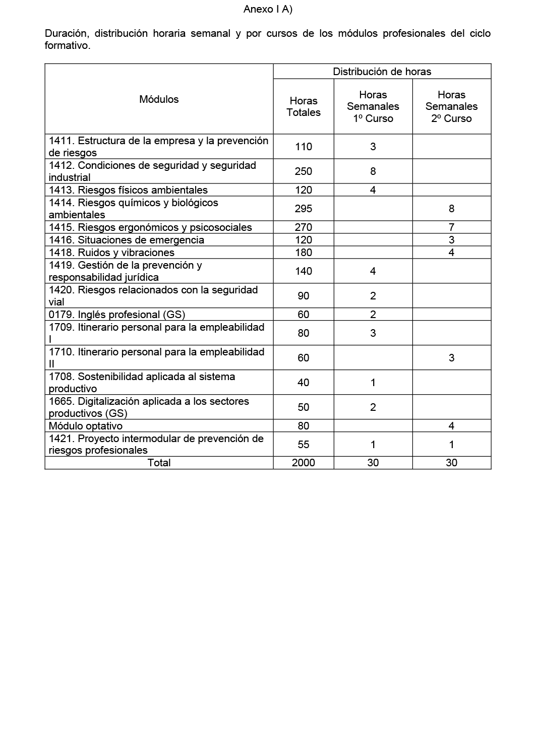 1. Los módulos profesionales del primer y segundo curso del ciclo formativo de grado superior, así como su duración, distribución horaria semanal y por cursos, son los establecidos en el anexo I A).