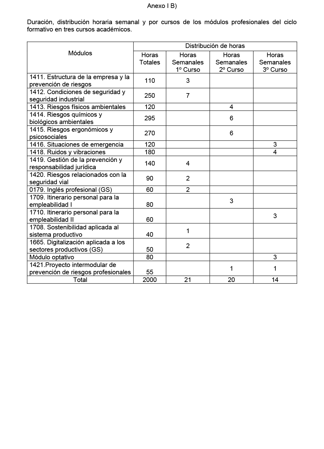 2. La duración y distribución horaria semanal y por cursos de los módulos profesionales y del proyecto intermodular del ciclo formativo para la oferta excepcional en tres cursos académicos es la establecida en el anexo I B).