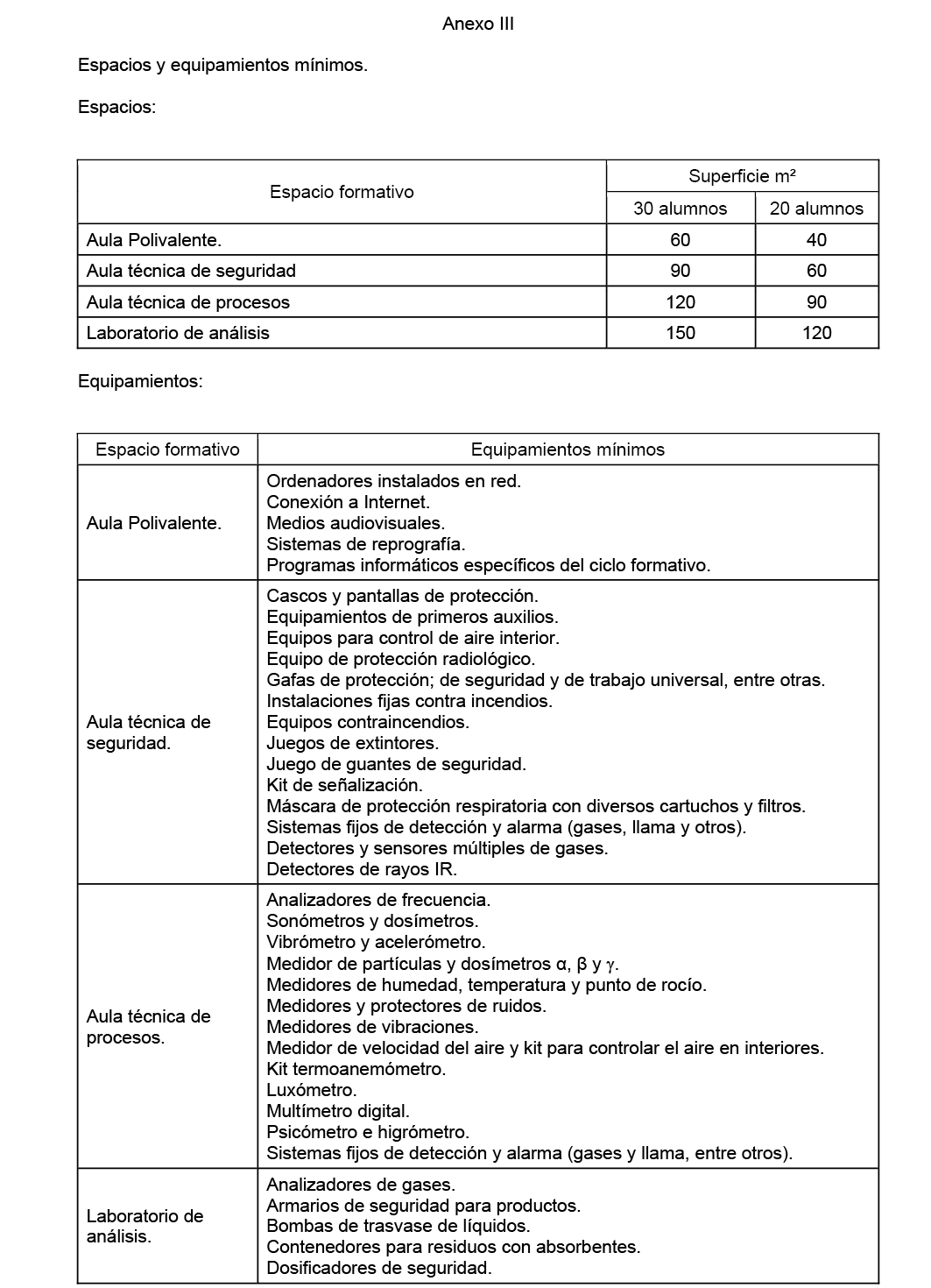 1. Los espacios y equipamientos mínimos necesarios para el desarrollo de las enseñanzas del ciclo formativo de grado superior correspondiente al título de Técnico/a Superior en Prevención de riesgos profesionales son los establecidos en el anexo III del presente decreto.