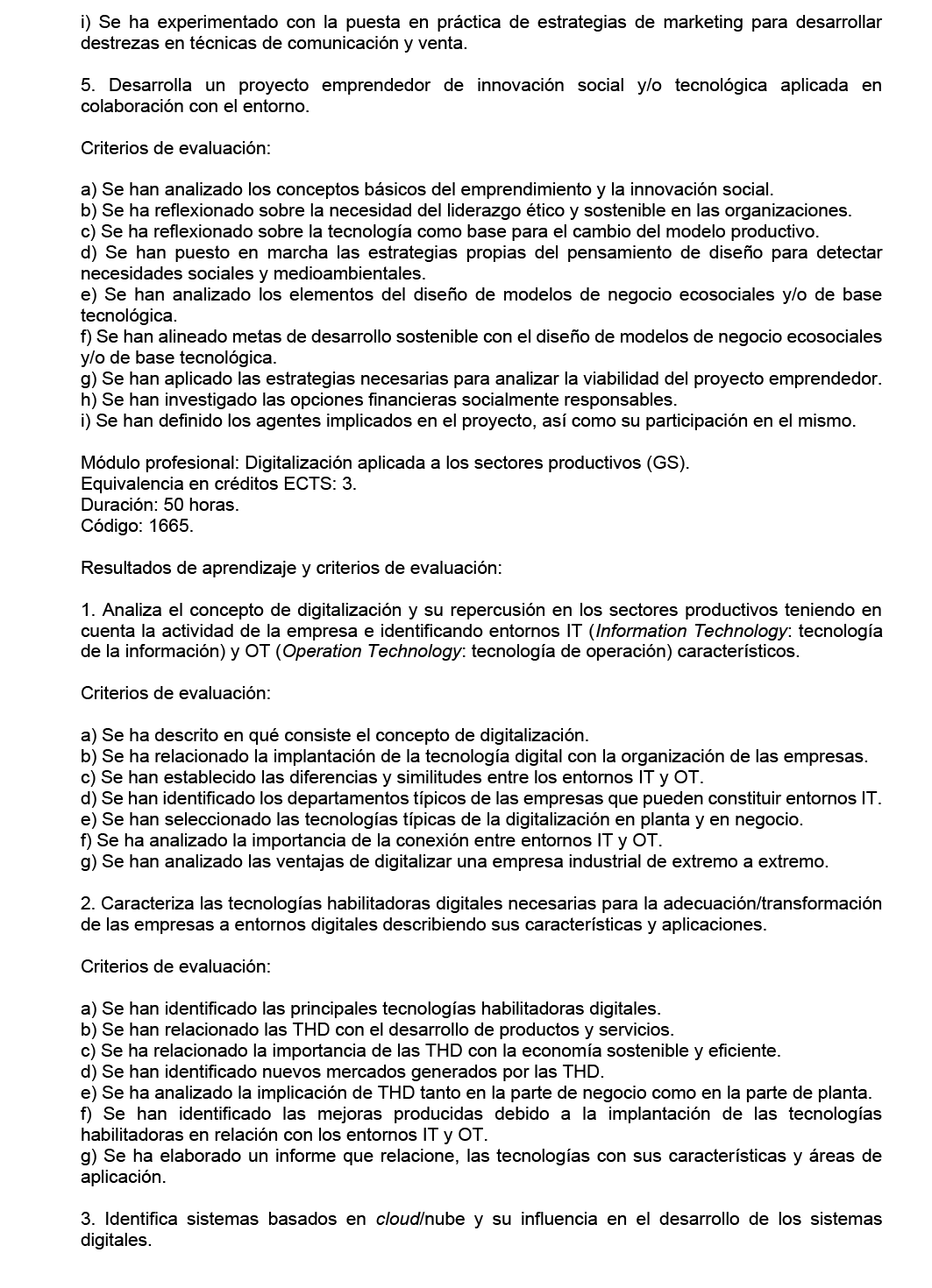 La Ley Orgánica 3/2022, de 31 de marzo, de ordenación e integración de la Formación Profesional, en su artículo 13.1 establece que todo currículo de la formación profesional tendrá por objetivo facilitar el desarrollo formativo profesional de las personas, promoviendo su formación integral, contribuyendo al desarrollo de su personalidad en todas sus dimensiones, incorporando al currículo contenidos culturales, científicos, tecnológicos y organizativos, así como contenidos vinculados a la digitalización, la defensa de la propiedad intelectual e industrial, la sostenibilidad, la innovación e investigación aplicada, el emprendimiento, la versatilidad tecnológica, las habilidades para la gestión de la carrera profesional, las relaciones laborales, la prevención de riesgos laborales y medioambientales, la responsabilidad profesional, las habilidades interpersonales, los valores cívicos, la participación ciudadana y la igualdad efectiva entre hombres y mujeres. En su artículo 13.2 dispone que el contenido básico del currículo deberá mantenerse actualizado por el procedimiento que reglamentariamente se establezca, definirá las enseñanzas mínimas y tendrá por finalidad asegurar una formación común y garantizar la validez estatal de los títulos, certificados y acreditaciones correspondientes.