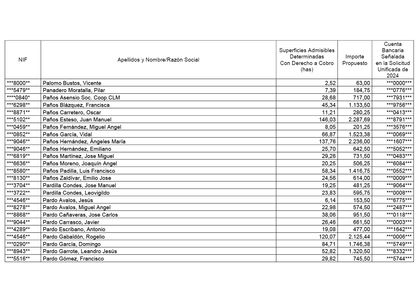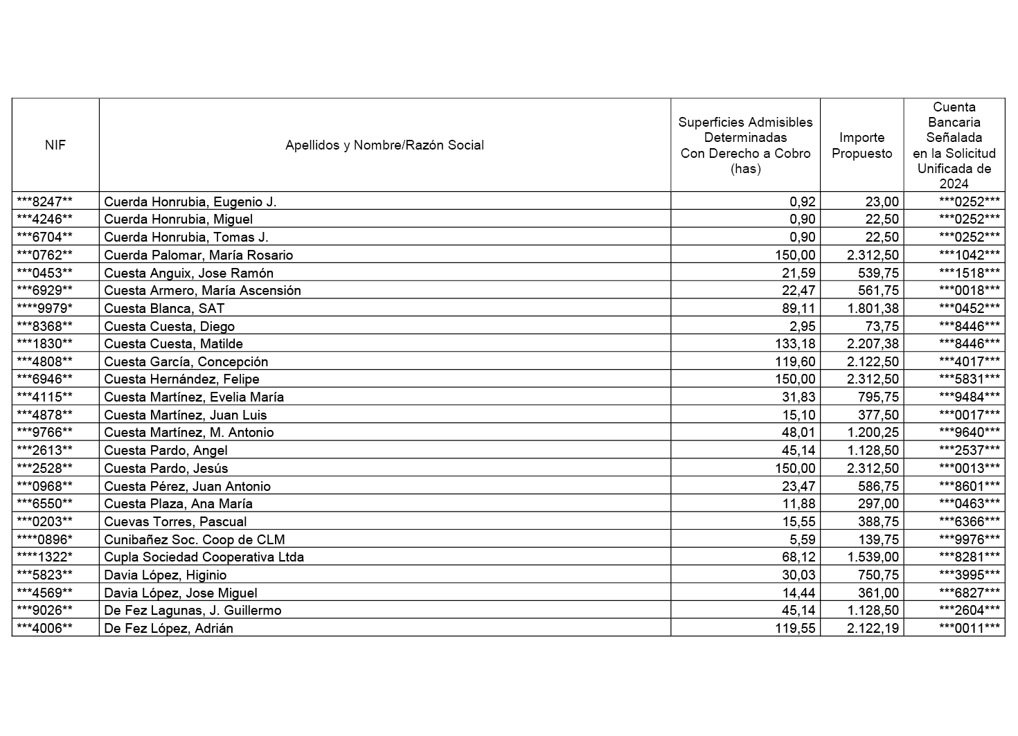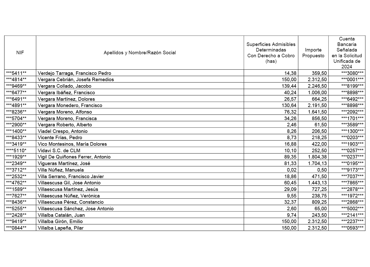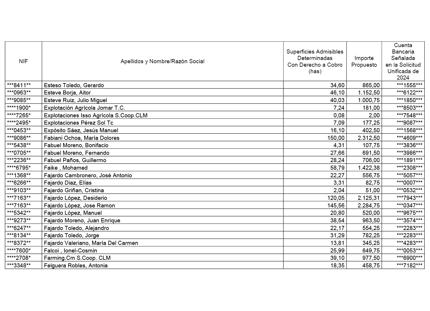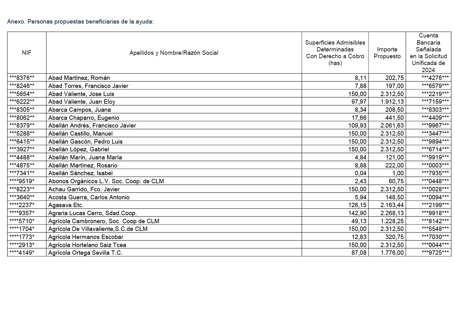 Vista la Propuesta de Resolución Definitiva de las ayudas previstas en el Decreto 59/2025, de 29 de julio, por el que se establecen las bases reguladoras, con carácter excepcional, en régimen de minimis, de ayudas dirigidas a personas titulares de explotaciones agrícolas de determinados sectores ubicadas en municipios de Castilla-La Mancha especialmente afectados por la sequía, durante el año hidrológico 2023-2024 y de conformidad con lo dispuesto en el artículo 6.3 del decreto referido que exige su publicación en el Diario Oficial de Castilla-La Mancha, con indicación, para cada una de las personas propuestas, de las superficies admisibles que motivan la concesión de la ayuda, los importes propuestos, así como los últimos dígitos de la cuenta bancaria señalada en la solicitud unificada de 2024, resuelvo: