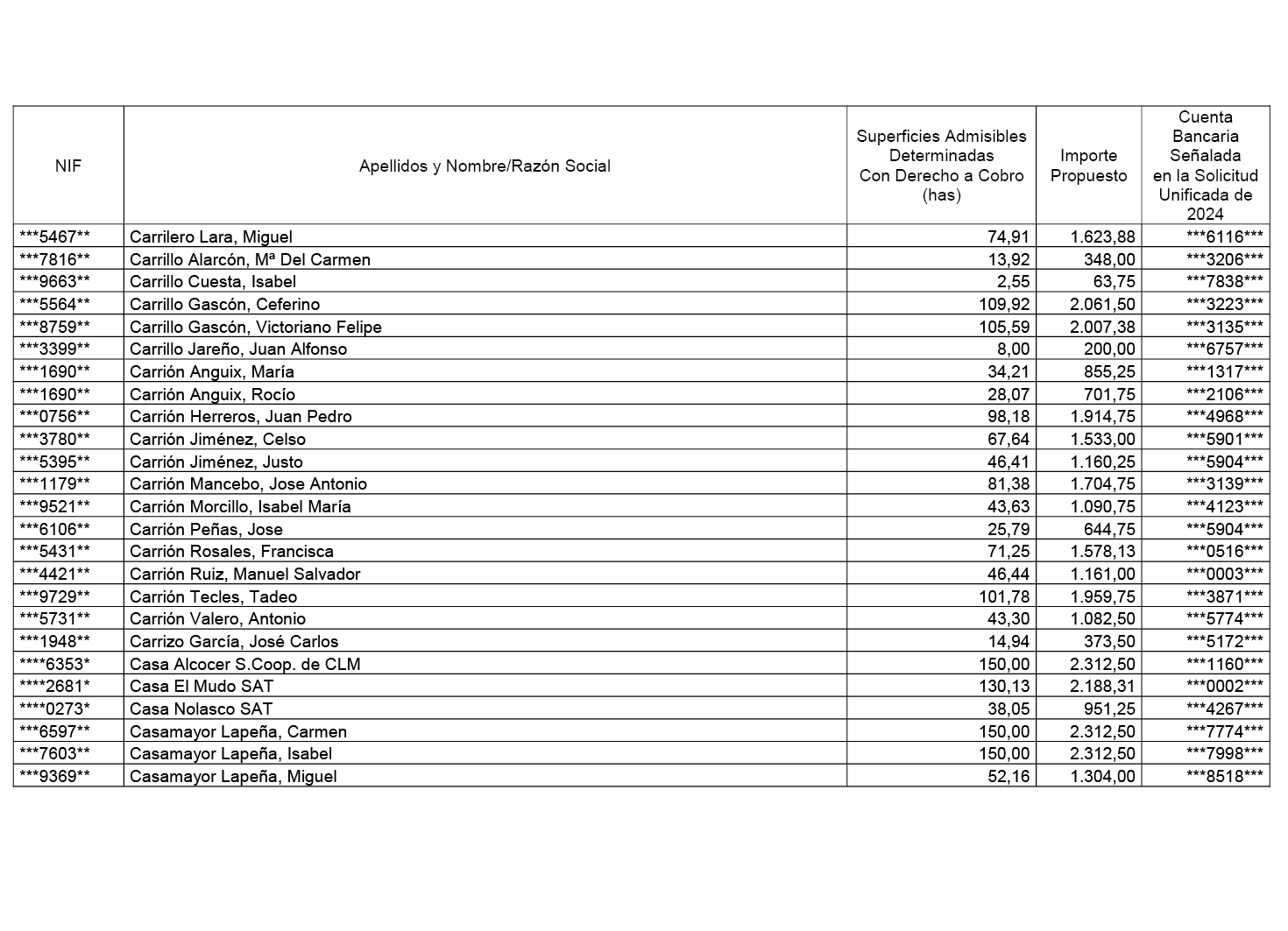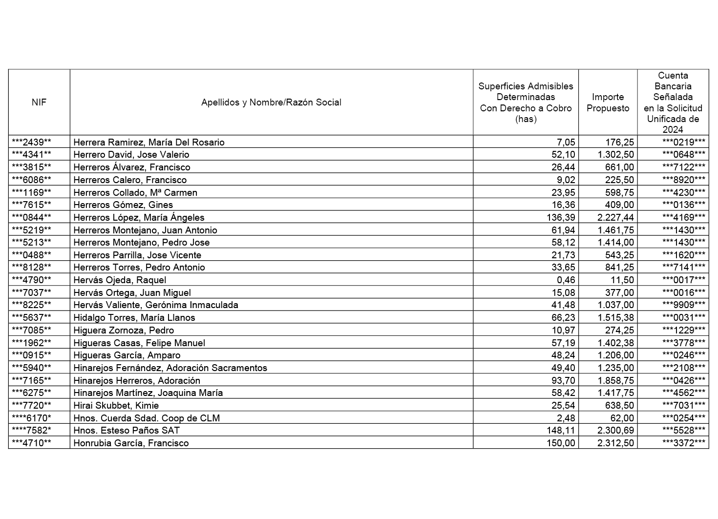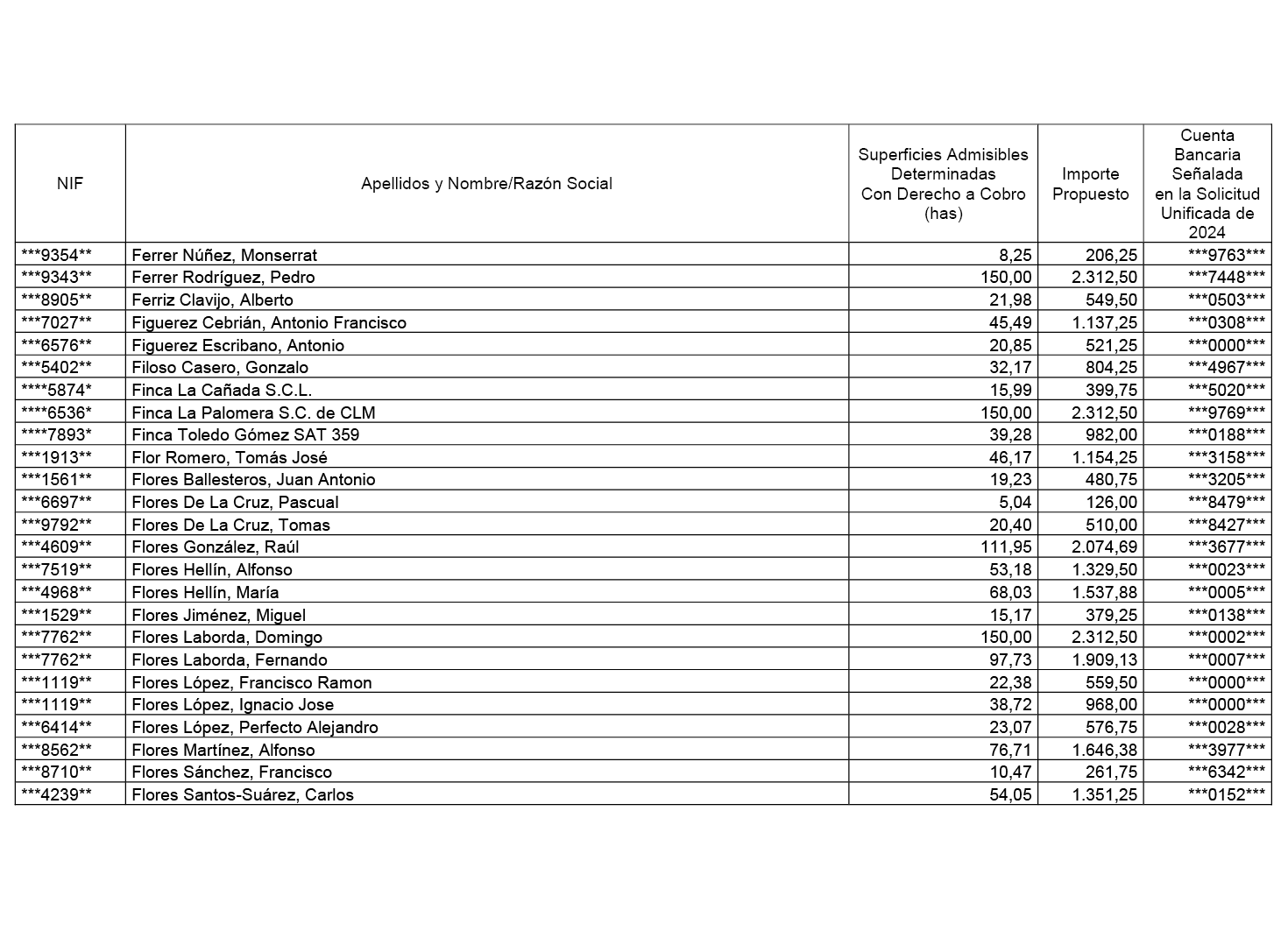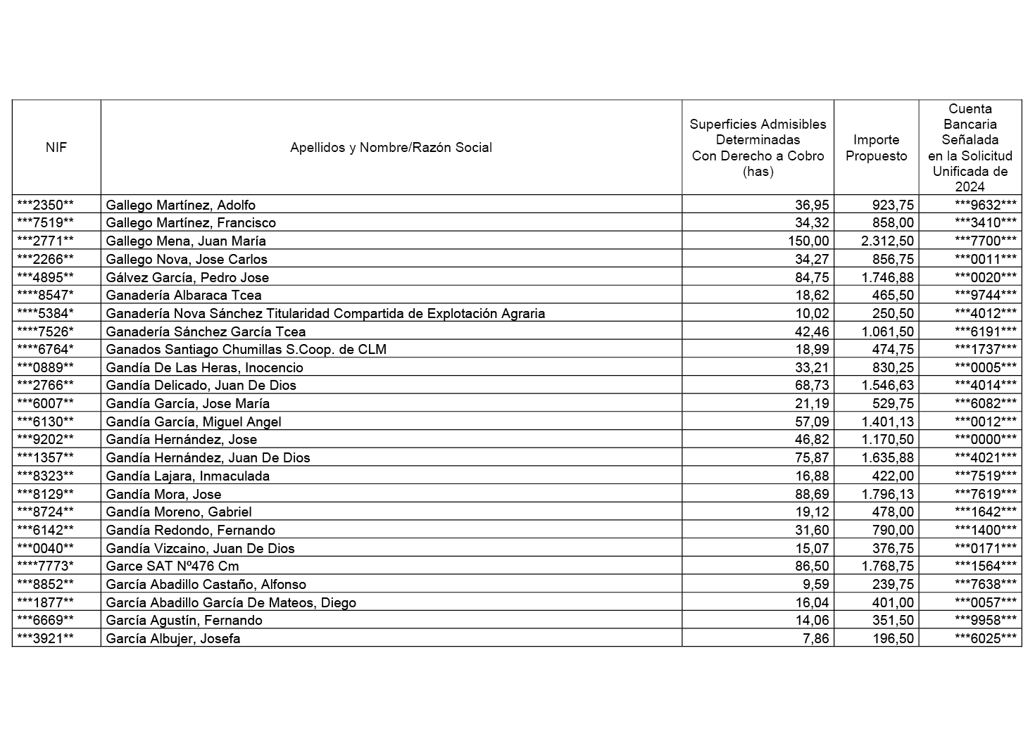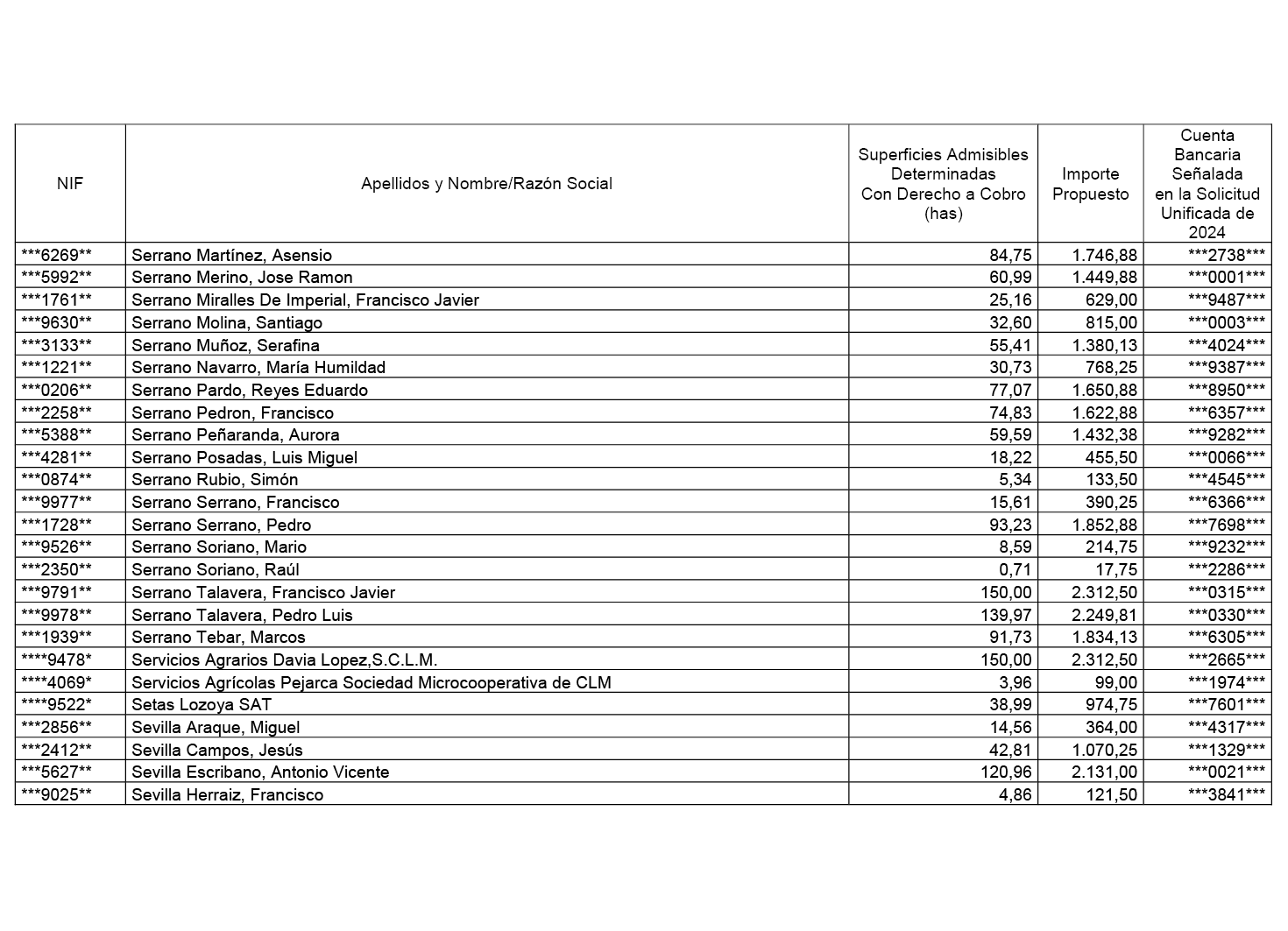 Vista la Propuesta de Resolución Definitiva de las ayudas previstas en el Decreto 59/2025, de 29 de julio, por el que se establecen las bases reguladoras, con carácter excepcional, en régimen de minimis, de ayudas dirigidas a personas titulares de explotaciones agrícolas de determinados sectores ubicadas en municipios de Castilla-La Mancha especialmente afectados por la sequía, durante el año hidrológico 2023-2024 y de conformidad con lo dispuesto en el artículo 6.3 del decreto referido que exige su publicación en el Diario Oficial de Castilla-La Mancha, con indicación, para cada una de las personas propuestas, de las superficies admisibles que motivan la concesión de la ayuda, los importes propuestos, así como los últimos dígitos de la cuenta bancaria señalada en la solicitud unificada de 2024, resuelvo: