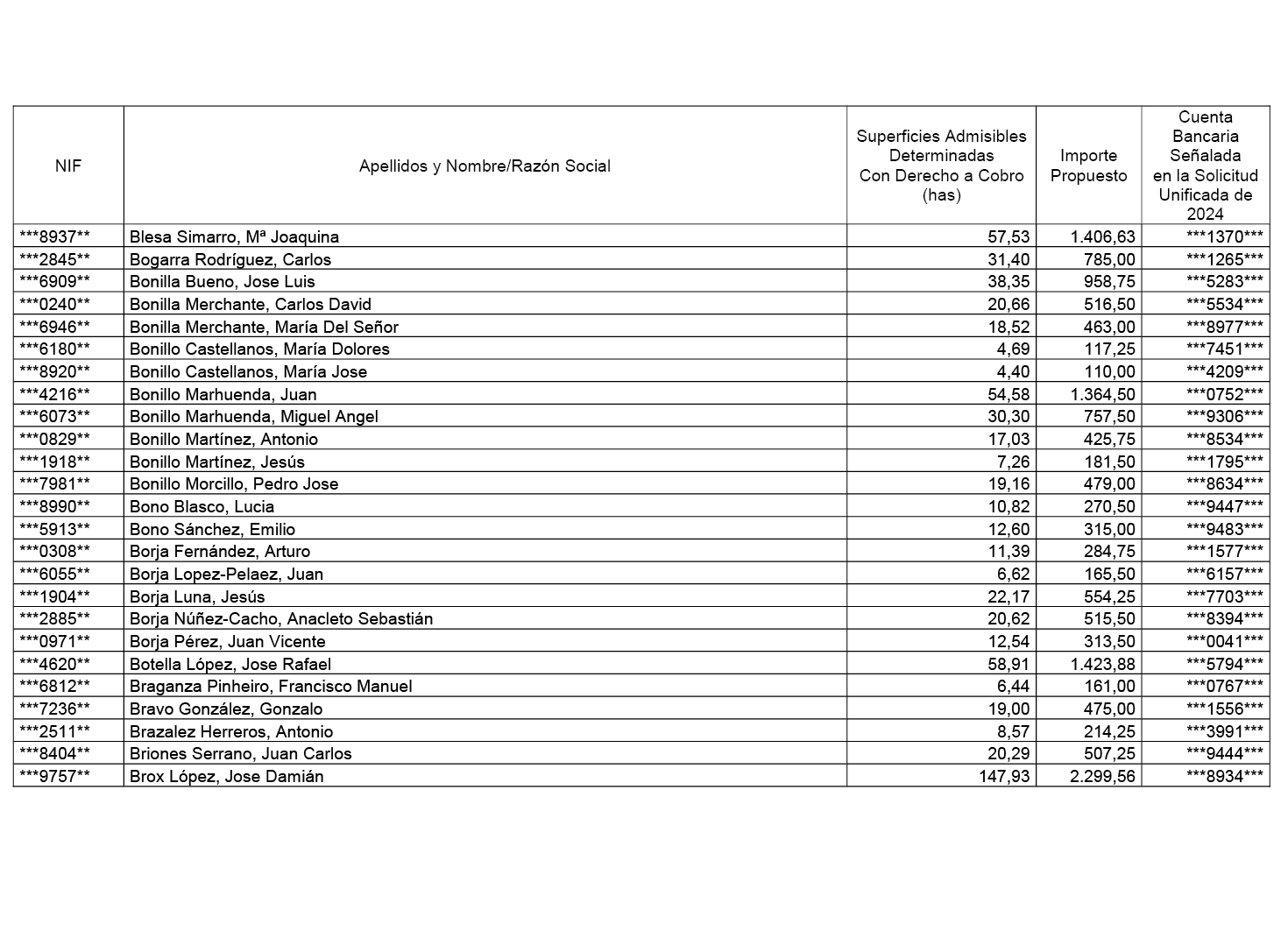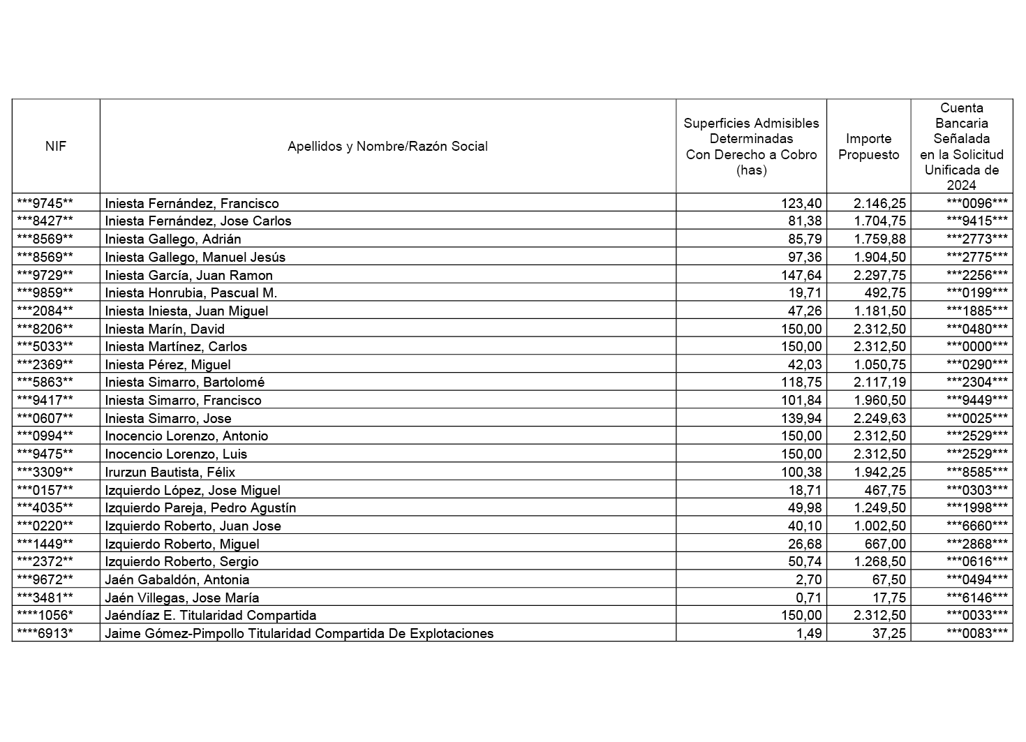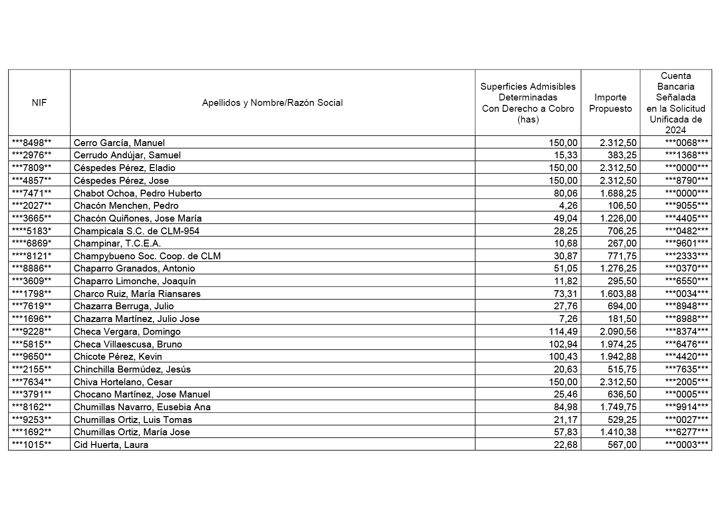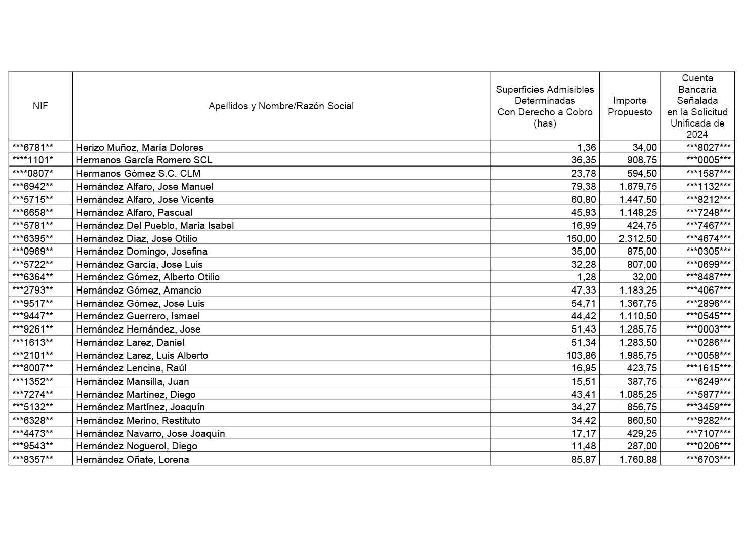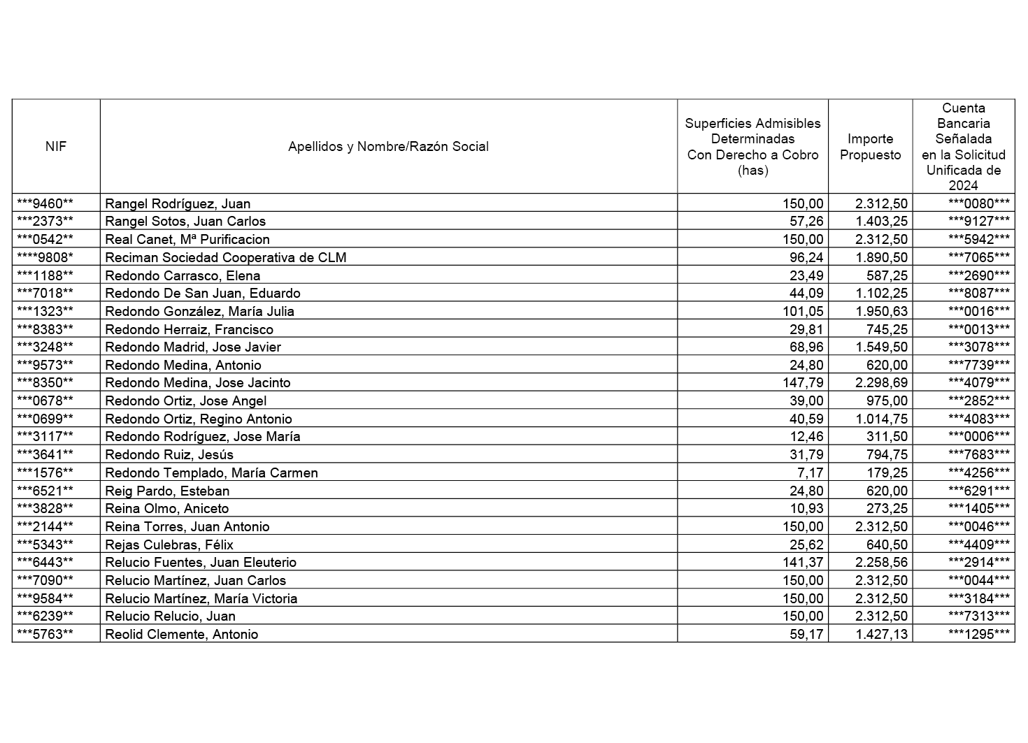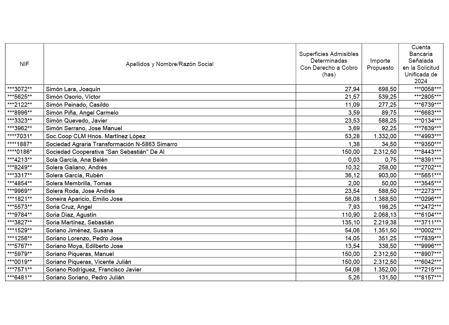 Vista la Propuesta de Resolución Definitiva de las ayudas previstas en el Decreto 59/2025, de 29 de julio, por el que se establecen las bases reguladoras, con carácter excepcional, en régimen de minimis, de ayudas dirigidas a personas titulares de explotaciones agrícolas de determinados sectores ubicadas en municipios de Castilla-La Mancha especialmente afectados por la sequía, durante el año hidrológico 2023-2024 y de conformidad con lo dispuesto en el artículo 6.3 del decreto referido que exige su publicación en el Diario Oficial de Castilla-La Mancha, con indicación, para cada una de las personas propuestas, de las superficies admisibles que motivan la concesión de la ayuda, los importes propuestos, así como los últimos dígitos de la cuenta bancaria señalada en la solicitud unificada de 2024, resuelvo: