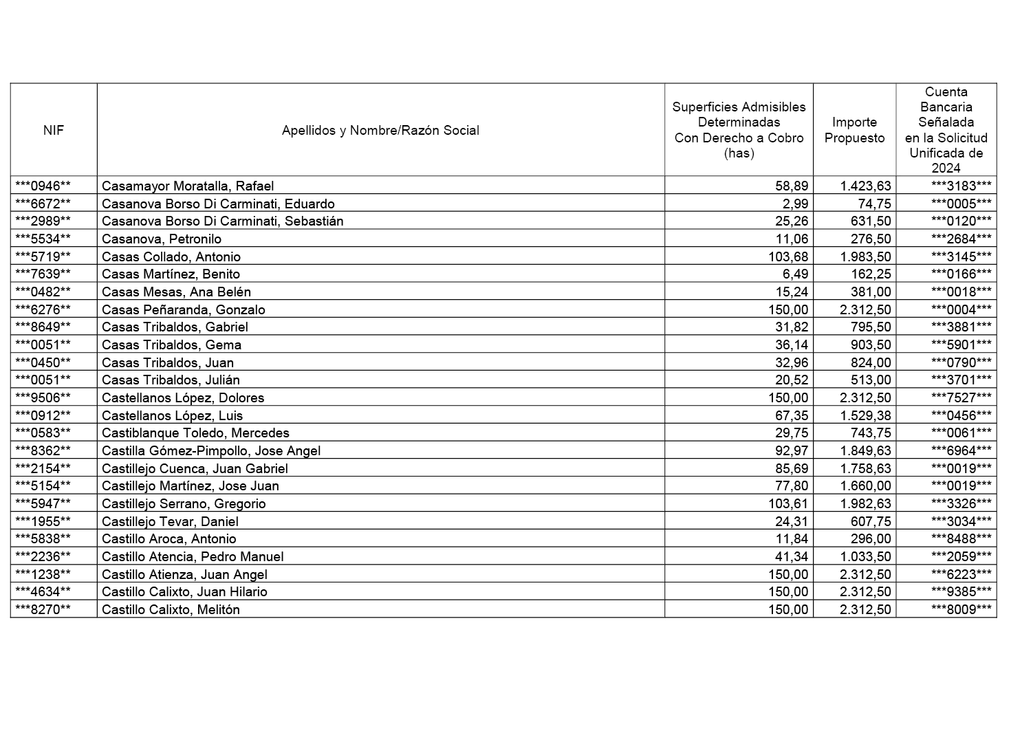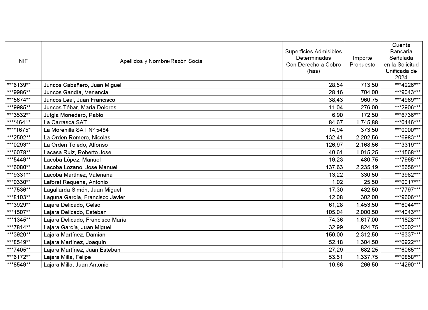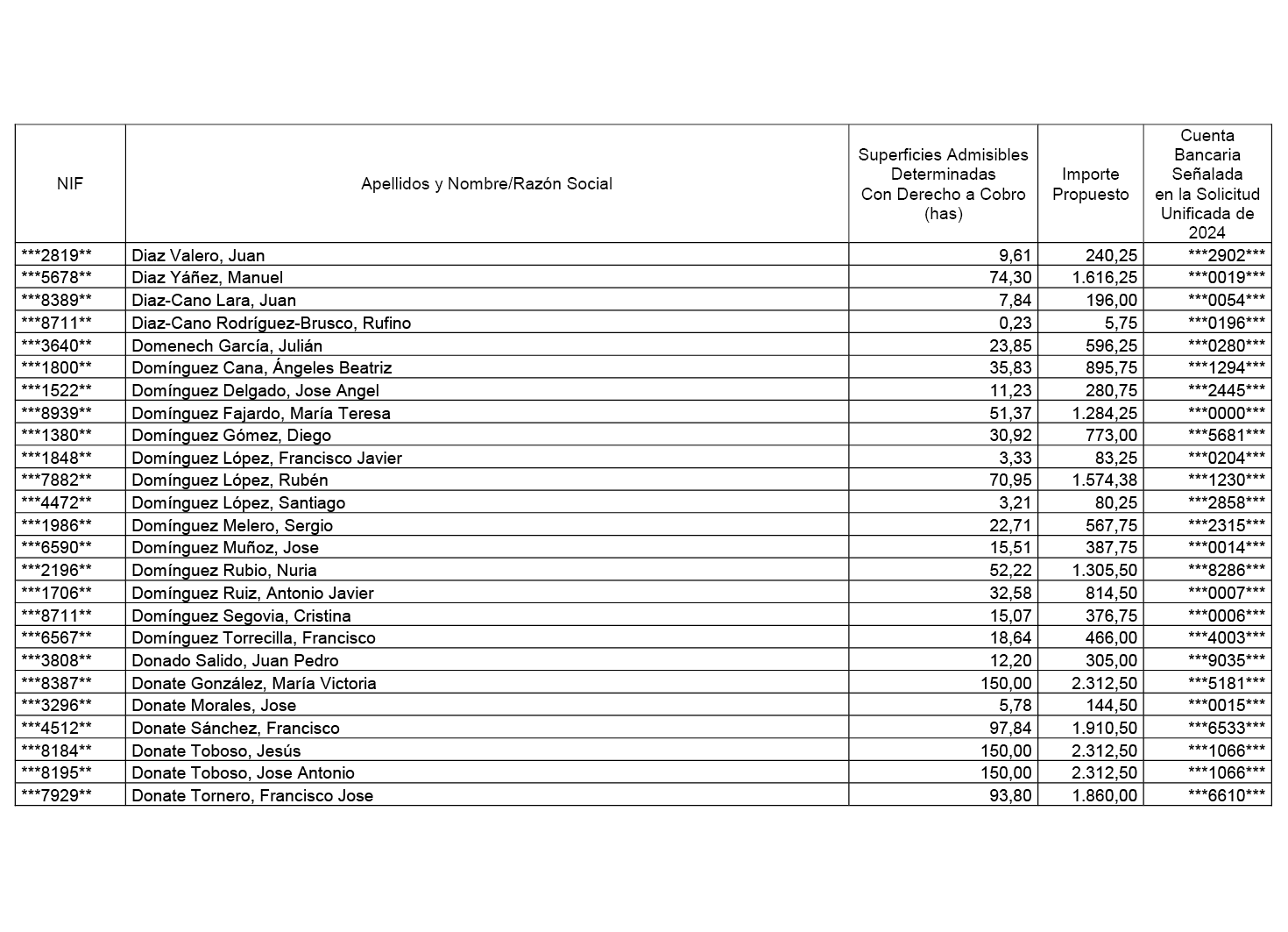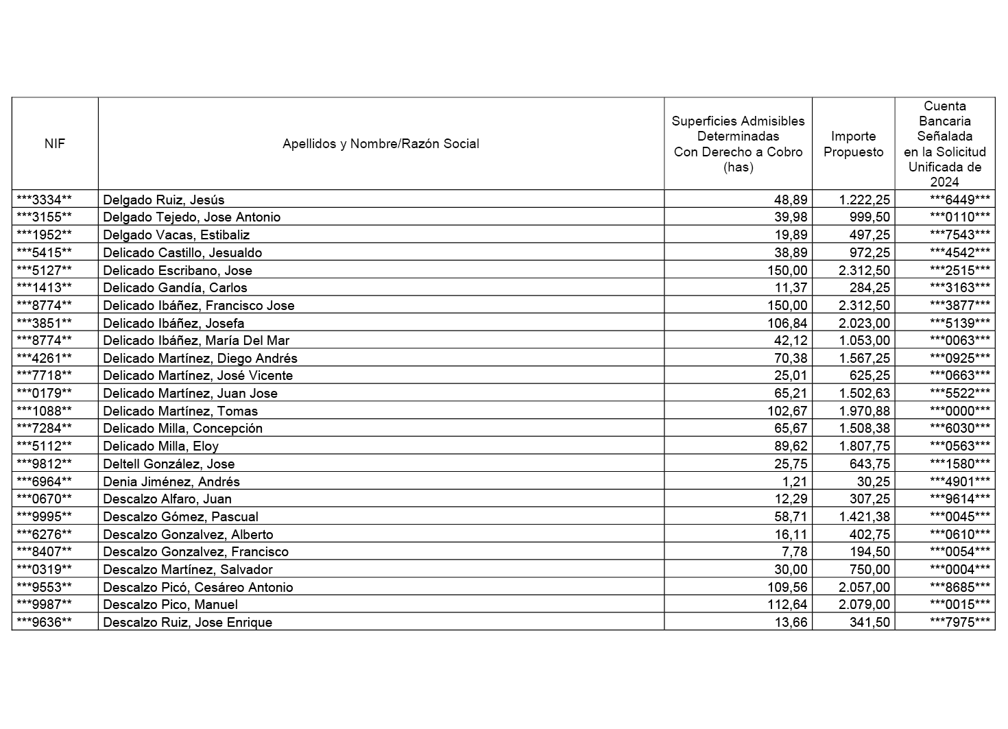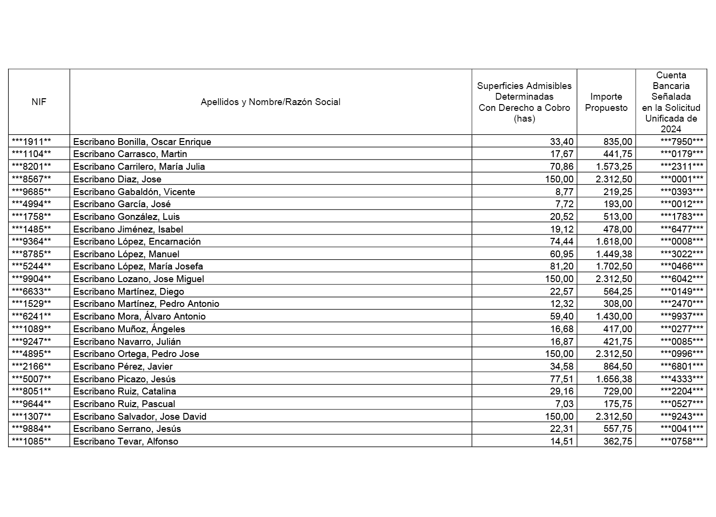 Vista la Propuesta de Resolución Definitiva de las ayudas previstas en el Decreto 59/2025, de 29 de julio, por el que se establecen las bases reguladoras, con carácter excepcional, en régimen de minimis, de ayudas dirigidas a personas titulares de explotaciones agrícolas de determinados sectores ubicadas en municipios de Castilla-La Mancha especialmente afectados por la sequía, durante el año hidrológico 2023-2024 y de conformidad con lo dispuesto en el artículo 6.3 del decreto referido que exige su publicación en el Diario Oficial de Castilla-La Mancha, con indicación, para cada una de las personas propuestas, de las superficies admisibles que motivan la concesión de la ayuda, los importes propuestos, así como los últimos dígitos de la cuenta bancaria señalada en la solicitud unificada de 2024, resuelvo: