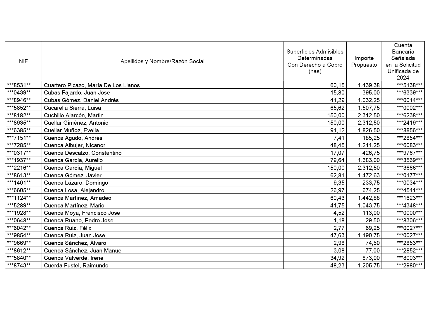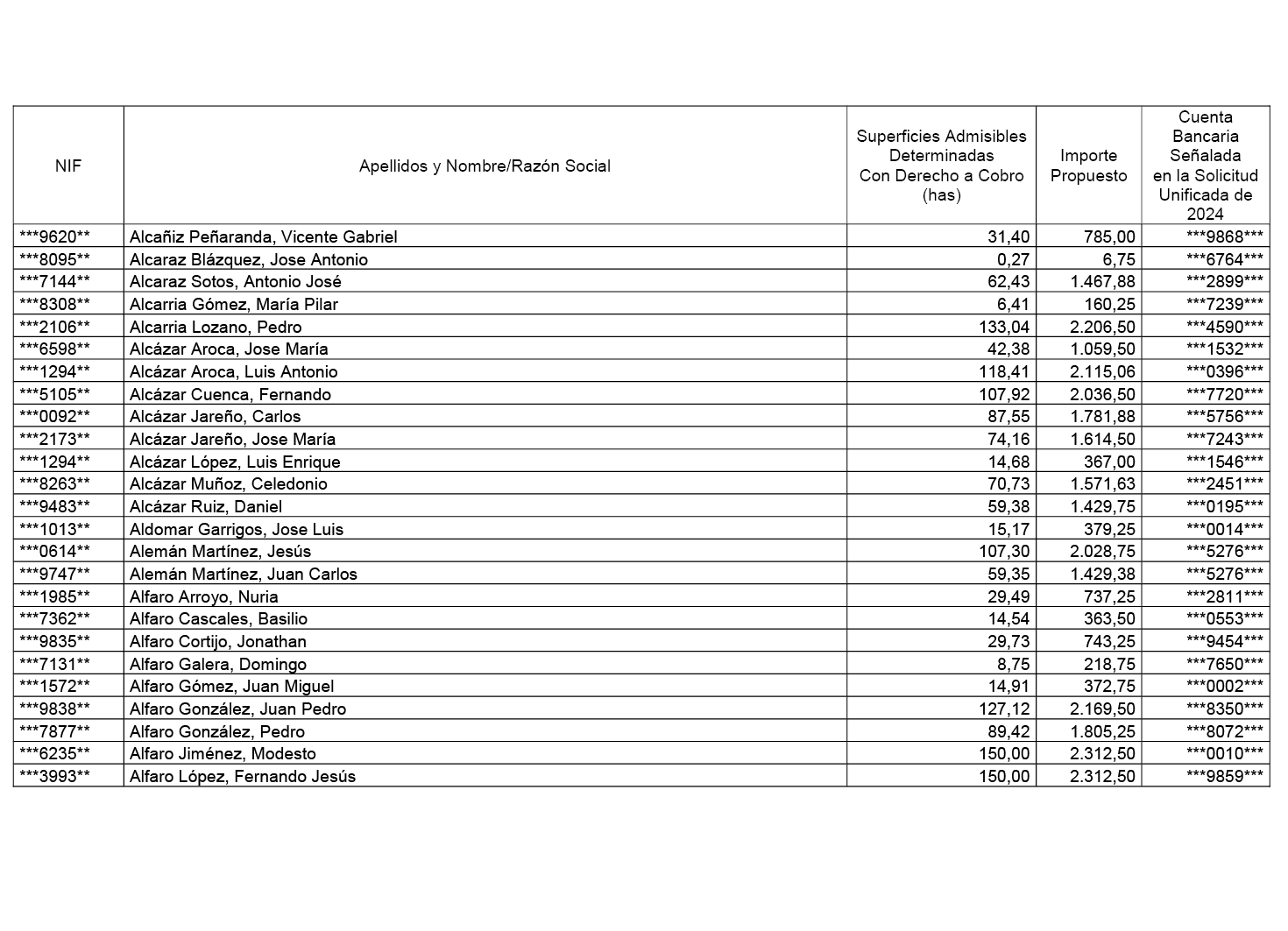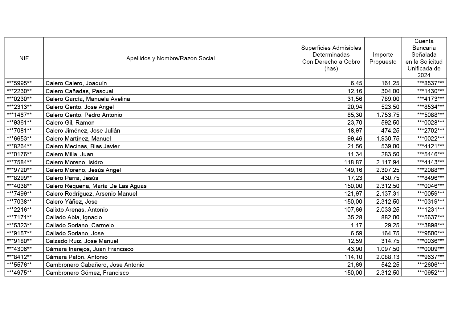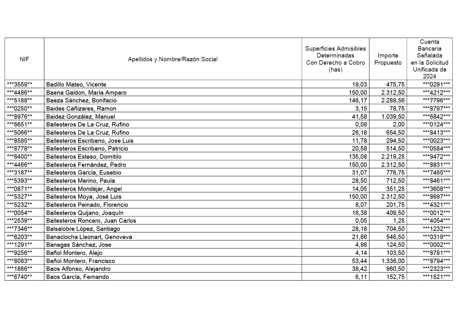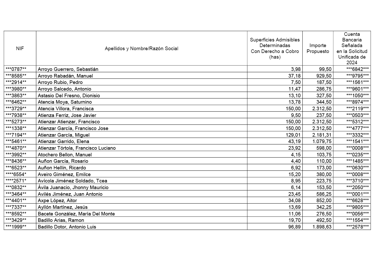 Vista la Propuesta de Resolución Definitiva de las ayudas previstas en el Decreto 59/2025, de 29 de julio, por el que se establecen las bases reguladoras, con carácter excepcional, en régimen de minimis, de ayudas dirigidas a personas titulares de explotaciones agrícolas de determinados sectores ubicadas en municipios de Castilla-La Mancha especialmente afectados por la sequía, durante el año hidrológico 2023-2024 y de conformidad con lo dispuesto en el artículo 6.3 del decreto referido que exige su publicación en el Diario Oficial de Castilla-La Mancha, con indicación, para cada una de las personas propuestas, de las superficies admisibles que motivan la concesión de la ayuda, los importes propuestos, así como los últimos dígitos de la cuenta bancaria señalada en la solicitud unificada de 2024, resuelvo: