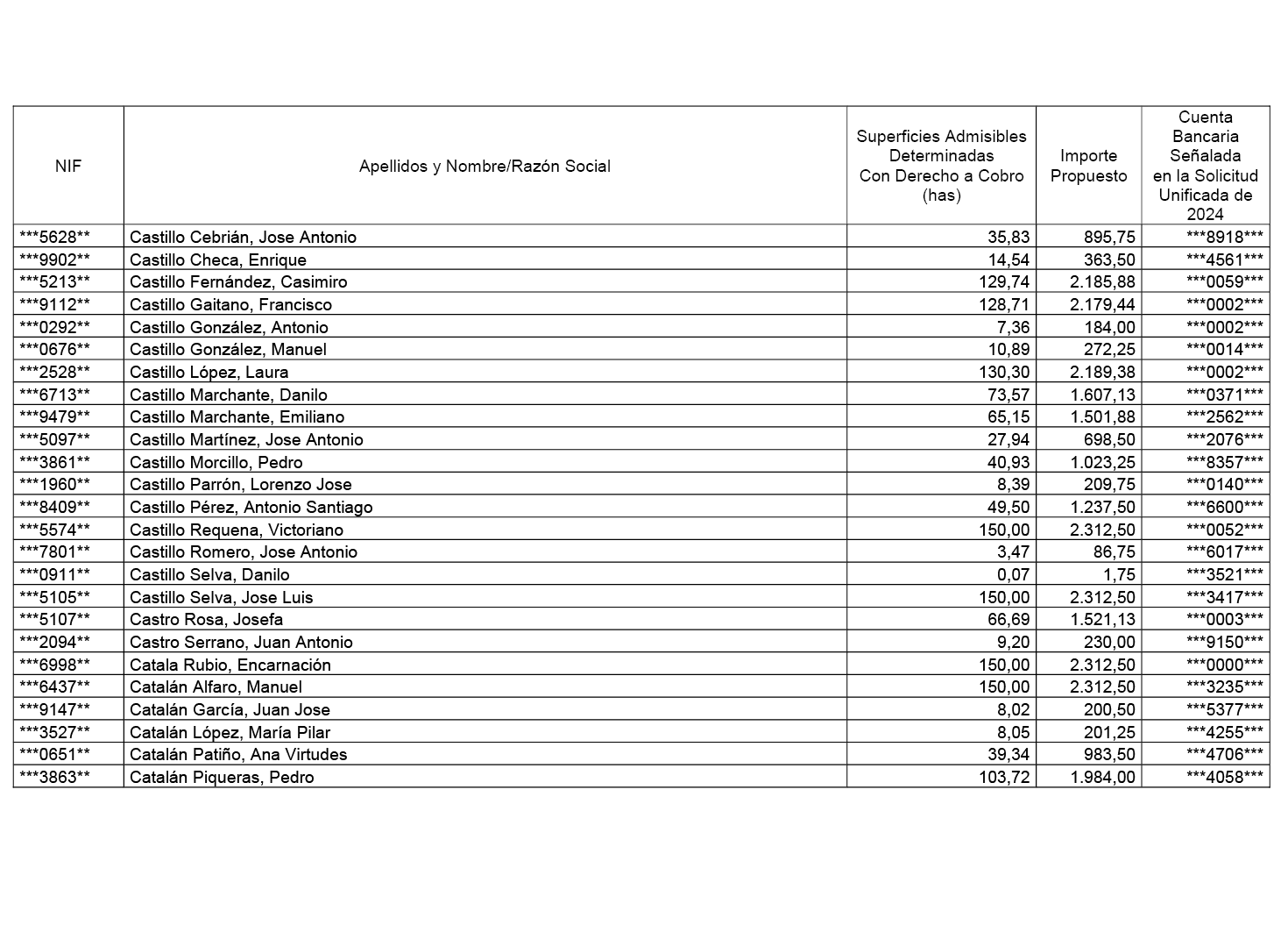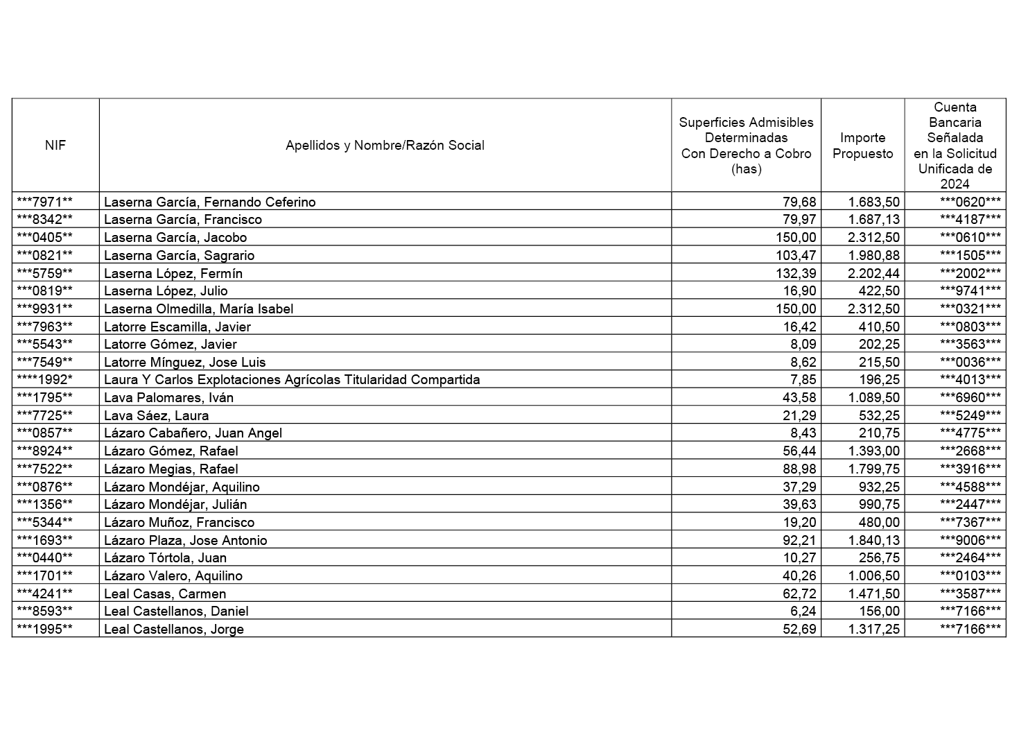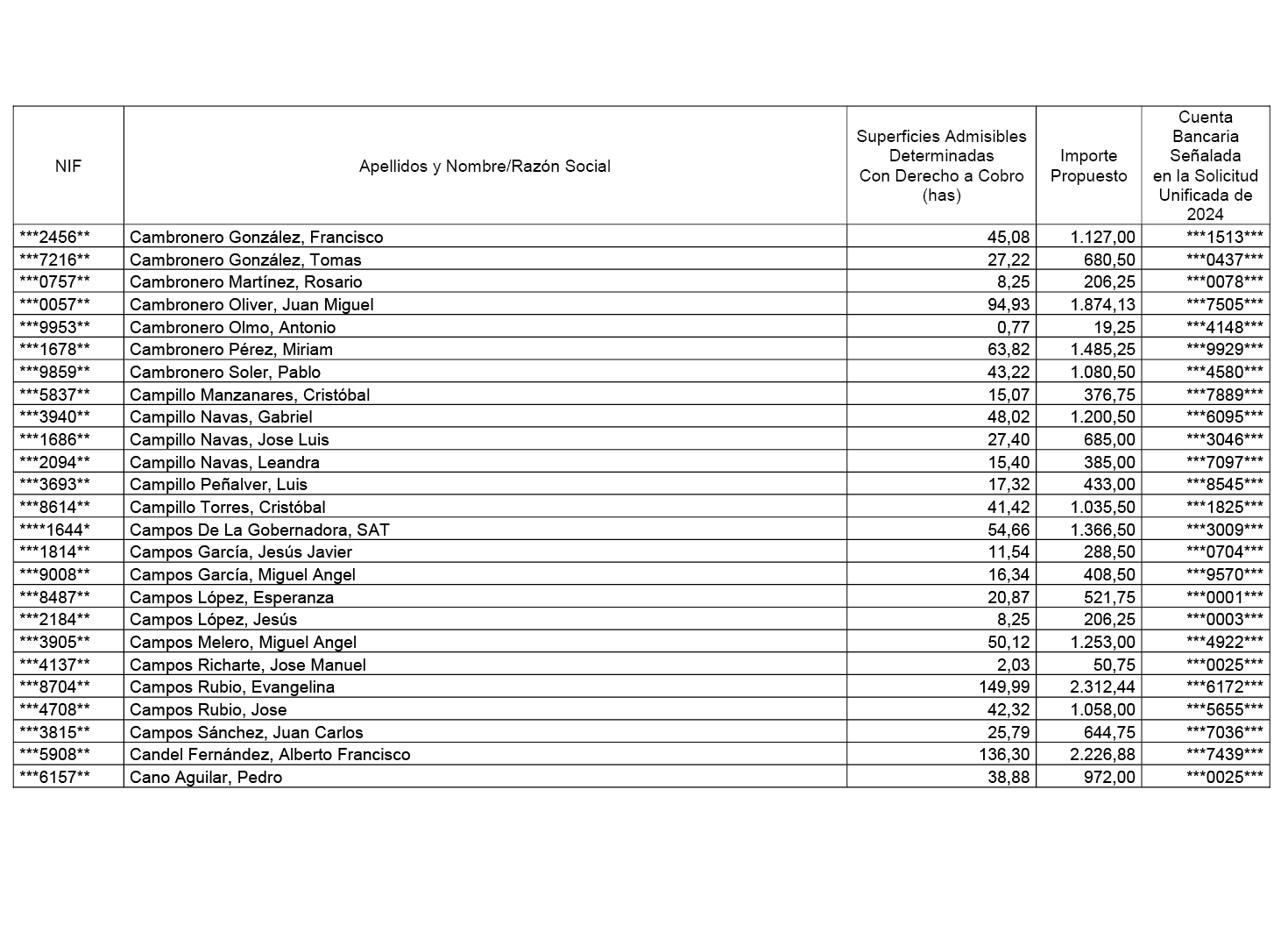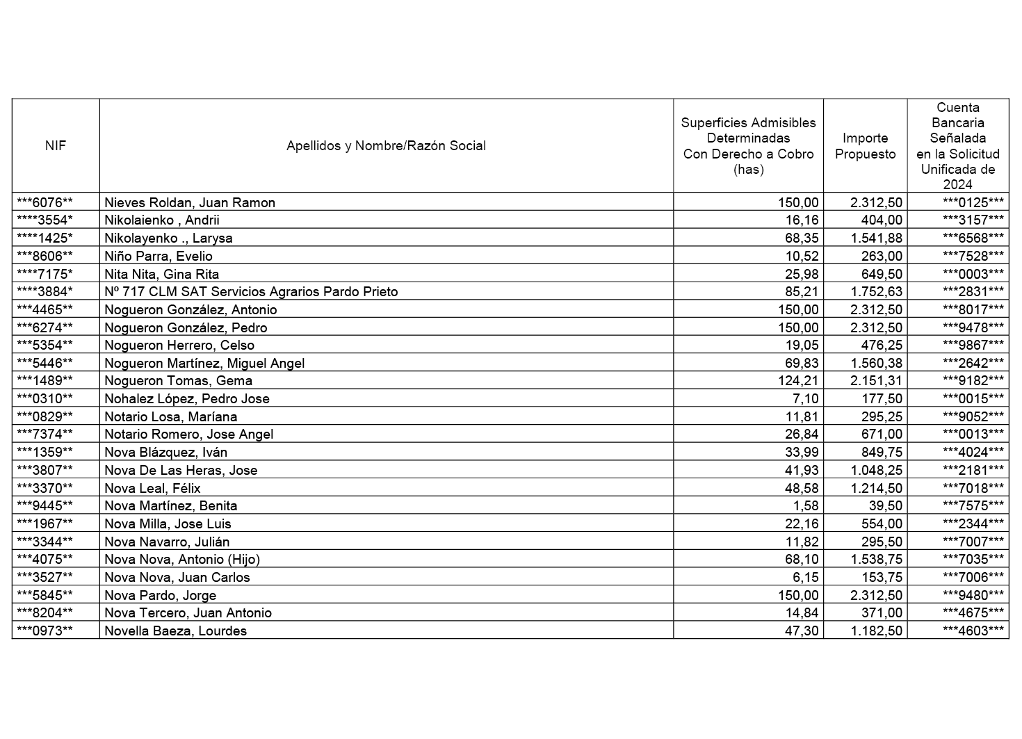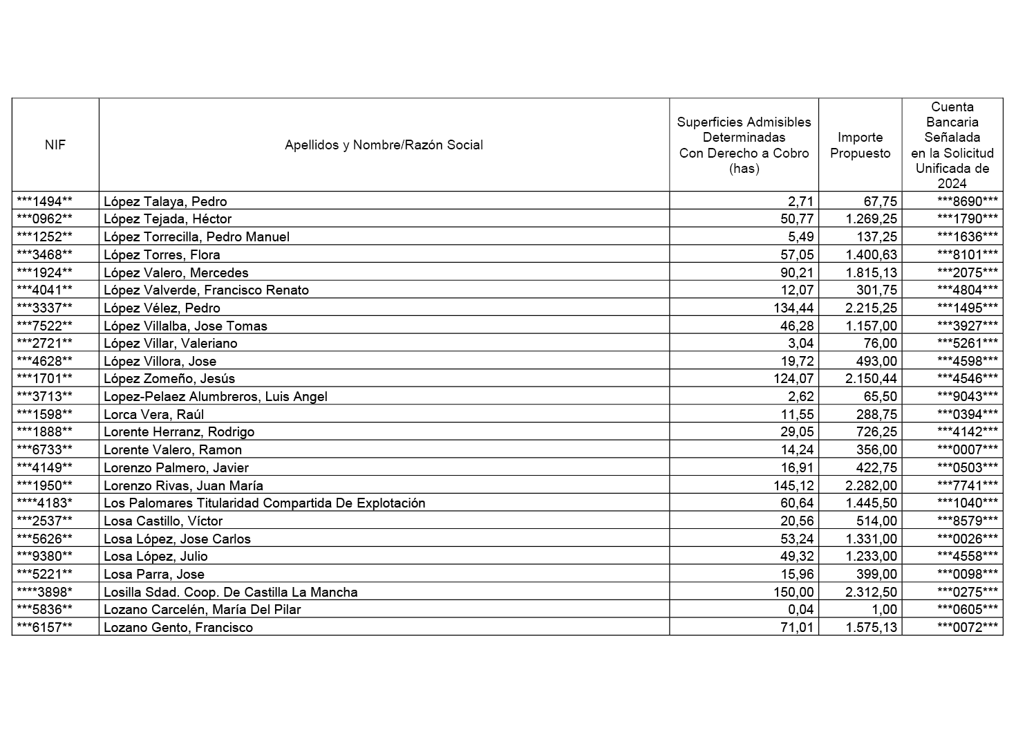 Vista la Propuesta de Resolución Definitiva de las ayudas previstas en el Decreto 59/2025, de 29 de julio, por el que se establecen las bases reguladoras, con carácter excepcional, en régimen de minimis, de ayudas dirigidas a personas titulares de explotaciones agrícolas de determinados sectores ubicadas en municipios de Castilla-La Mancha especialmente afectados por la sequía, durante el año hidrológico 2023-2024 y de conformidad con lo dispuesto en el artículo 6.3 del decreto referido que exige su publicación en el Diario Oficial de Castilla-La Mancha, con indicación, para cada una de las personas propuestas, de las superficies admisibles que motivan la concesión de la ayuda, los importes propuestos, así como los últimos dígitos de la cuenta bancaria señalada en la solicitud unificada de 2024, resuelvo:
