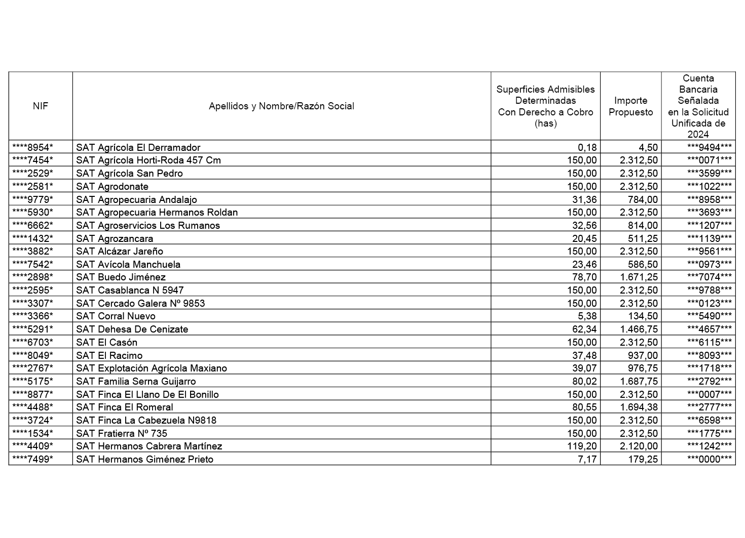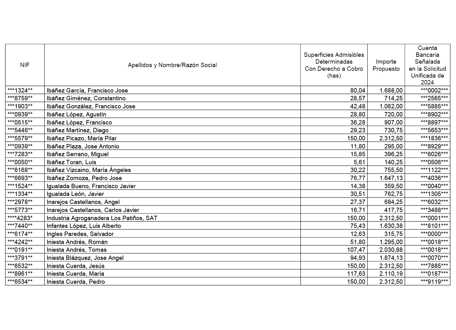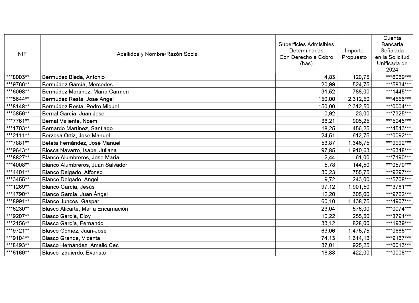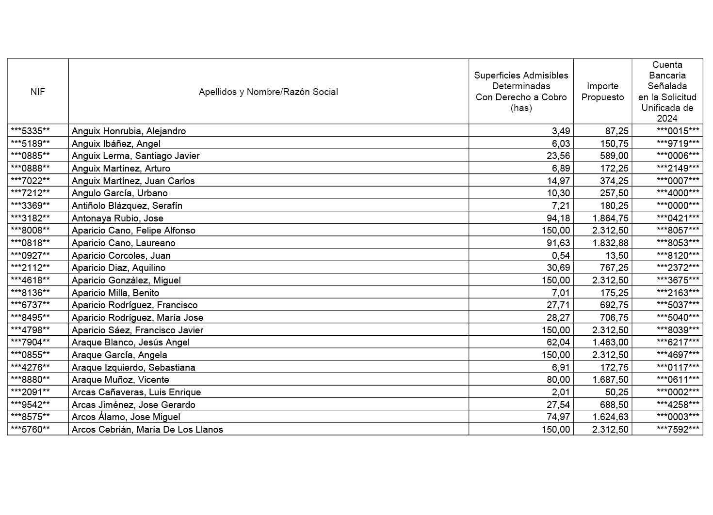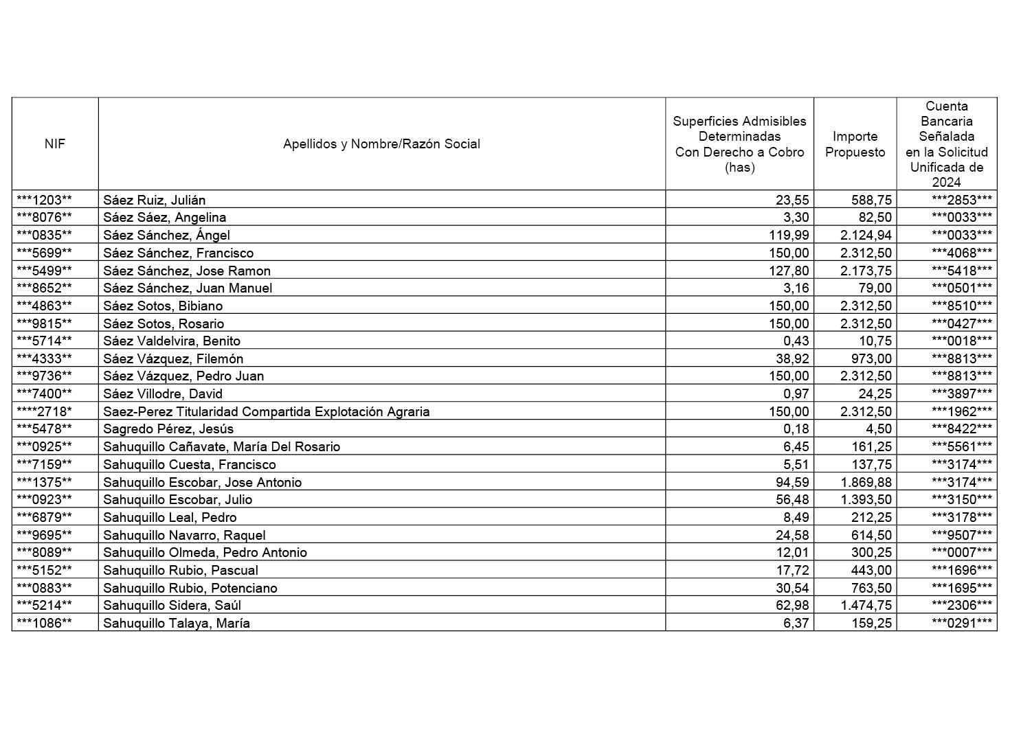 Vista la Propuesta de Resolución Definitiva de las ayudas previstas en el Decreto 59/2025, de 29 de julio, por el que se establecen las bases reguladoras, con carácter excepcional, en régimen de minimis, de ayudas dirigidas a personas titulares de explotaciones agrícolas de determinados sectores ubicadas en municipios de Castilla-La Mancha especialmente afectados por la sequía, durante el año hidrológico 2023-2024 y de conformidad con lo dispuesto en el artículo 6.3 del decreto referido que exige su publicación en el Diario Oficial de Castilla-La Mancha, con indicación, para cada una de las personas propuestas, de las superficies admisibles que motivan la concesión de la ayuda, los importes propuestos, así como los últimos dígitos de la cuenta bancaria señalada en la solicitud unificada de 2024, resuelvo: