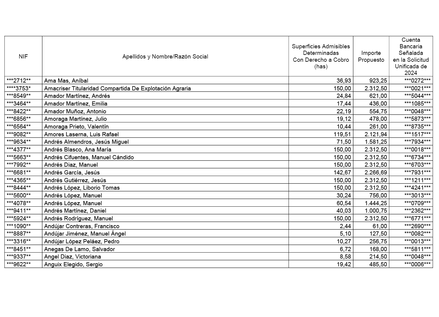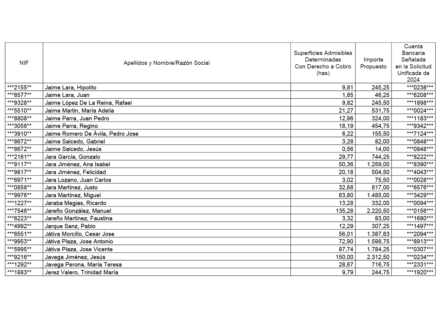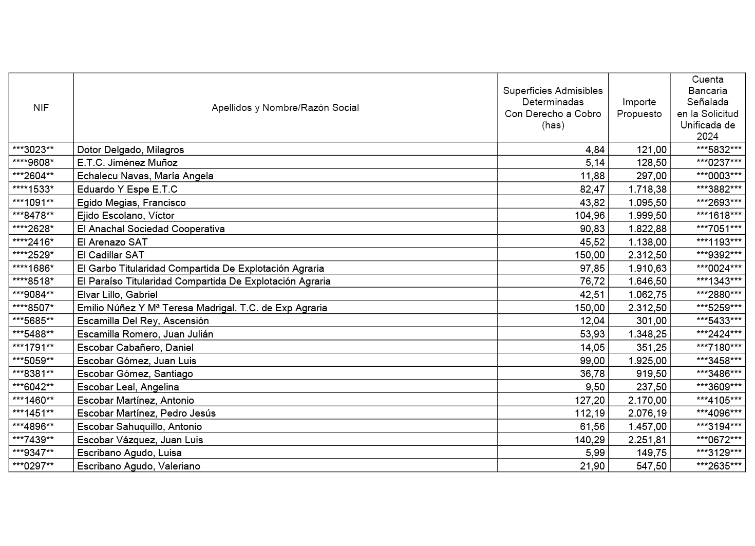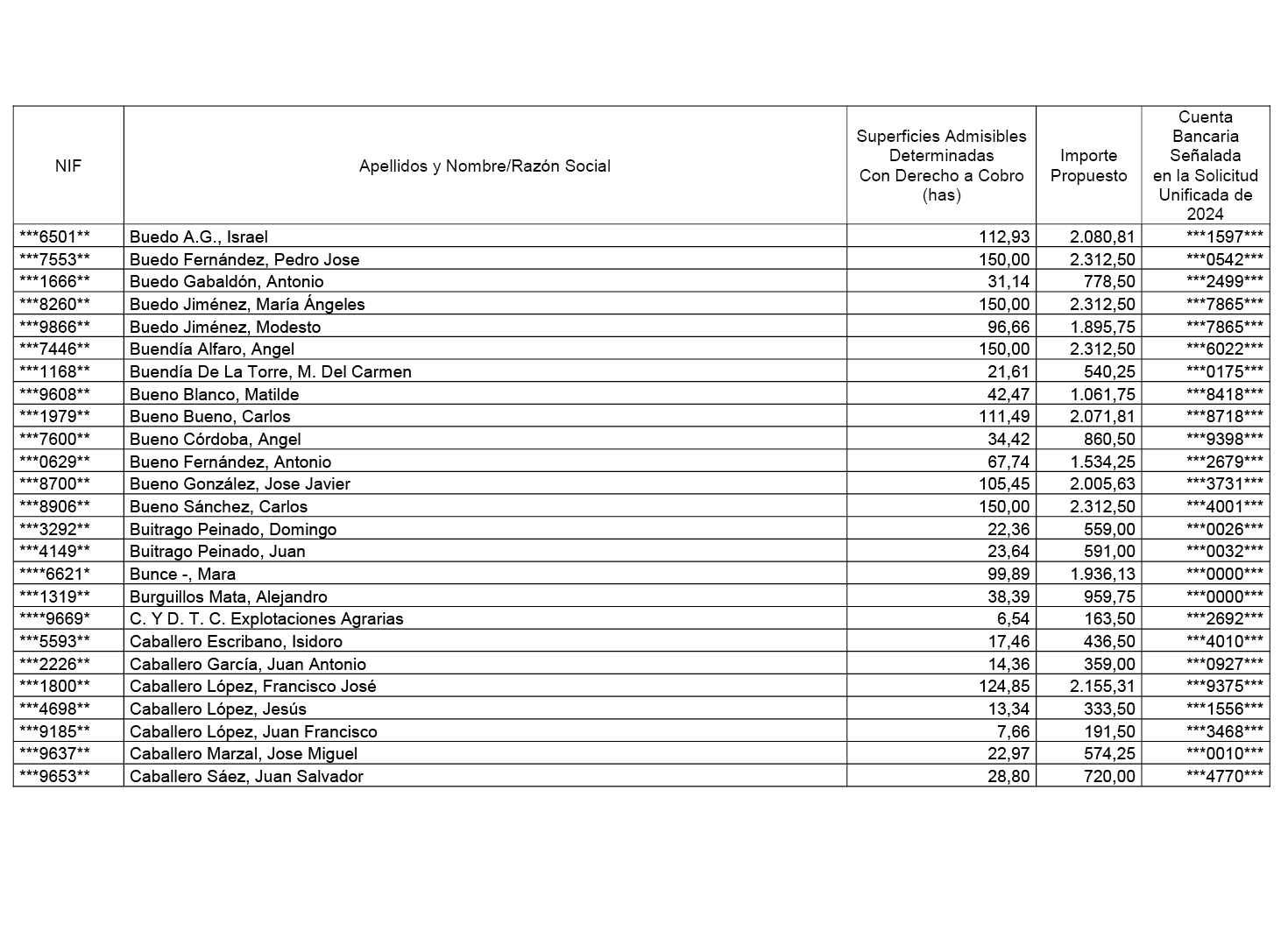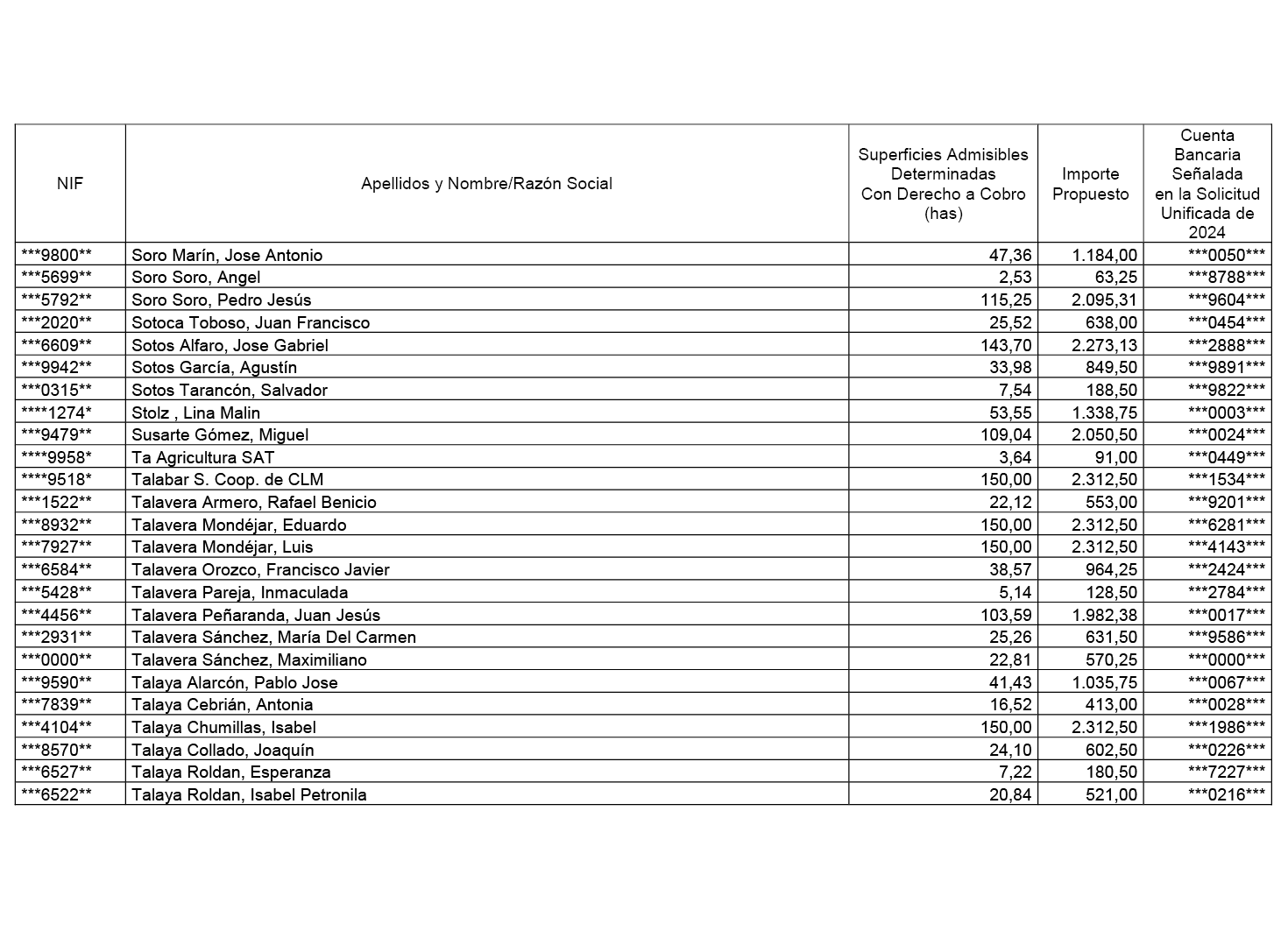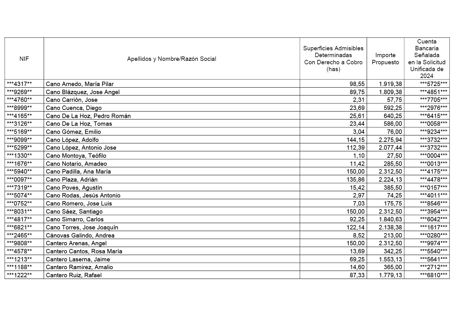 Vista la Propuesta de Resolución Definitiva de las ayudas previstas en el Decreto 59/2025, de 29 de julio, por el que se establecen las bases reguladoras, con carácter excepcional, en régimen de minimis, de ayudas dirigidas a personas titulares de explotaciones agrícolas de determinados sectores ubicadas en municipios de Castilla-La Mancha especialmente afectados por la sequía, durante el año hidrológico 2023-2024 y de conformidad con lo dispuesto en el artículo 6.3 del decreto referido que exige su publicación en el Diario Oficial de Castilla-La Mancha, con indicación, para cada una de las personas propuestas, de las superficies admisibles que motivan la concesión de la ayuda, los importes propuestos, así como los últimos dígitos de la cuenta bancaria señalada en la solicitud unificada de 2024, resuelvo: