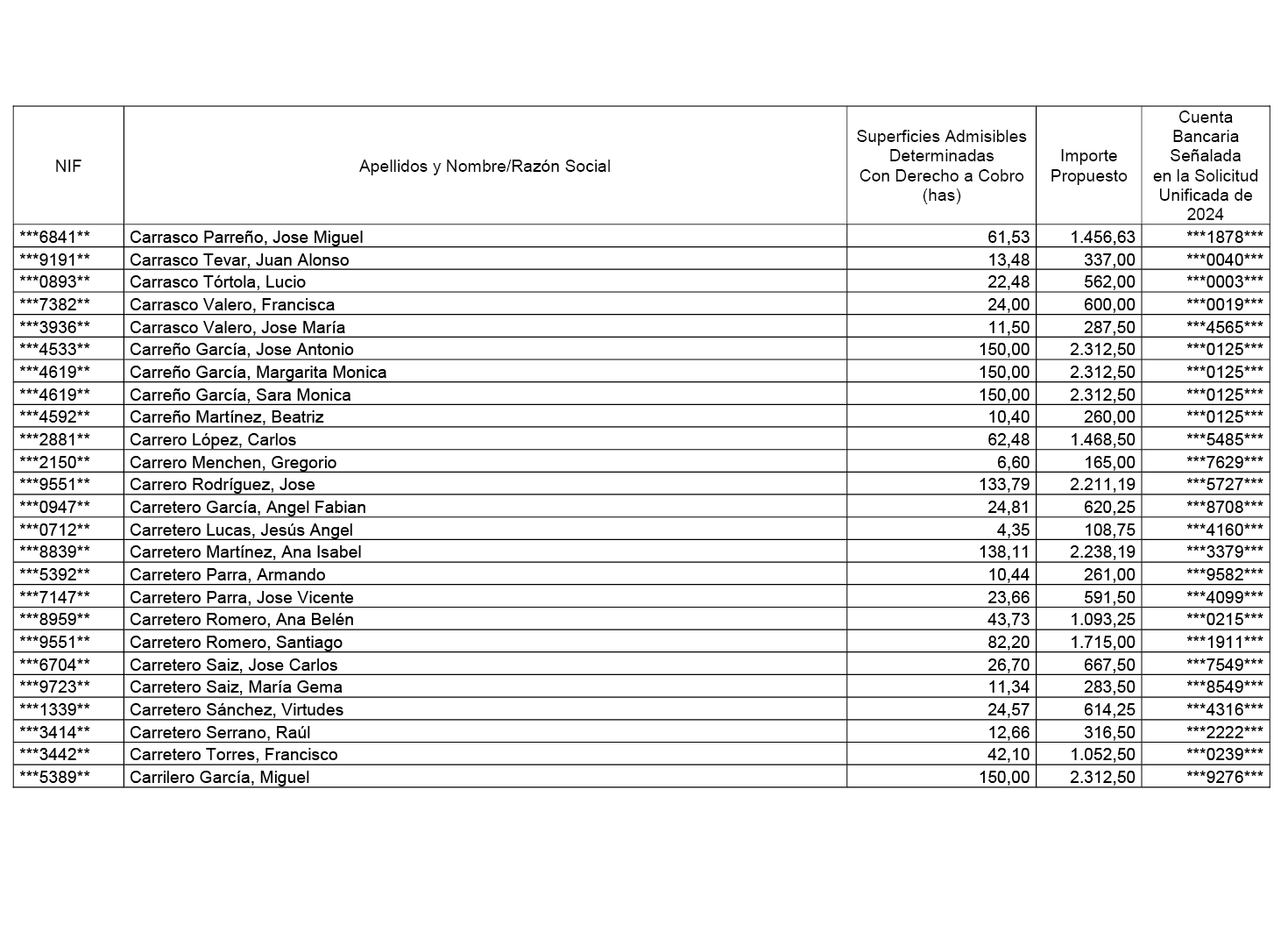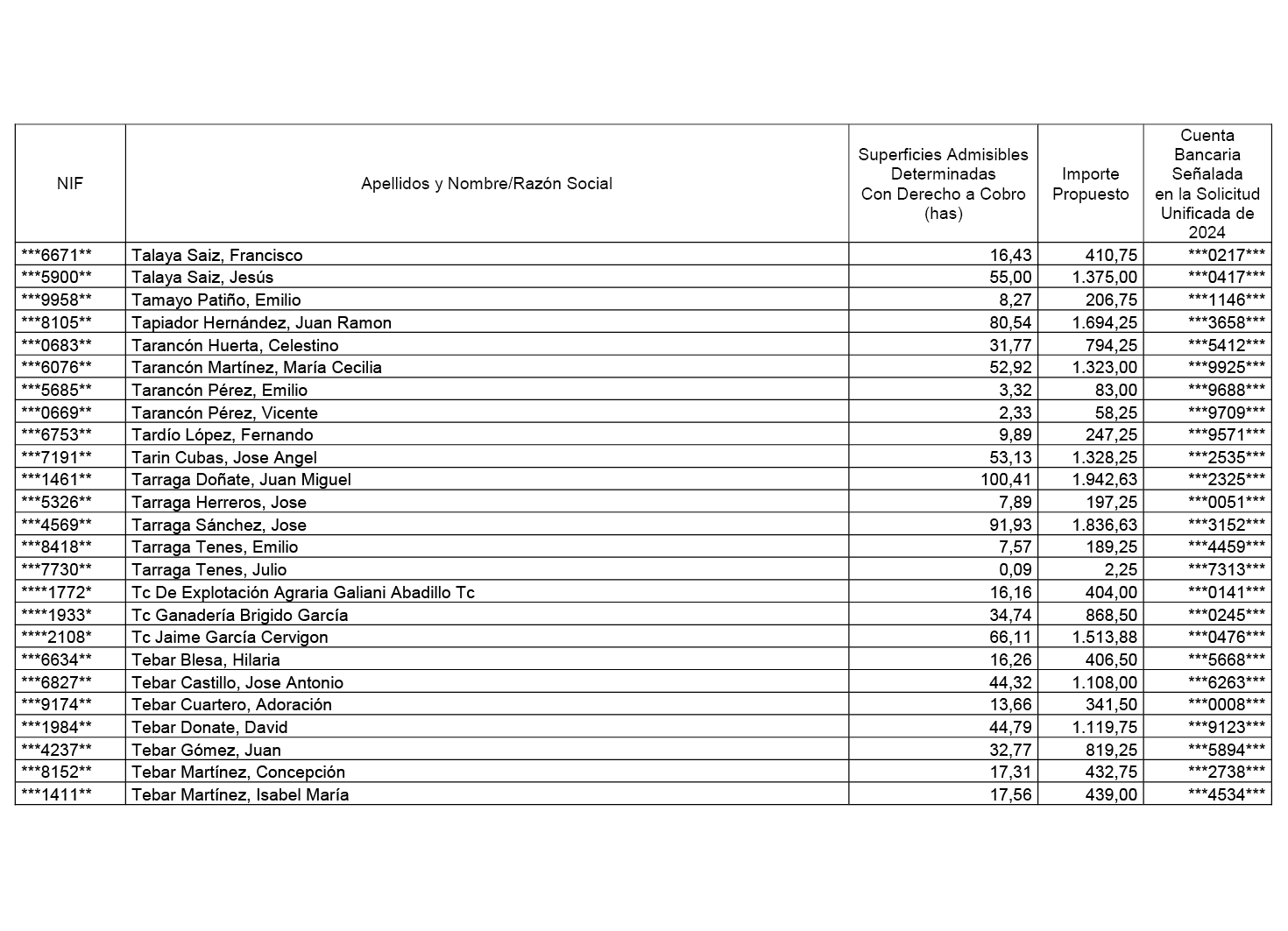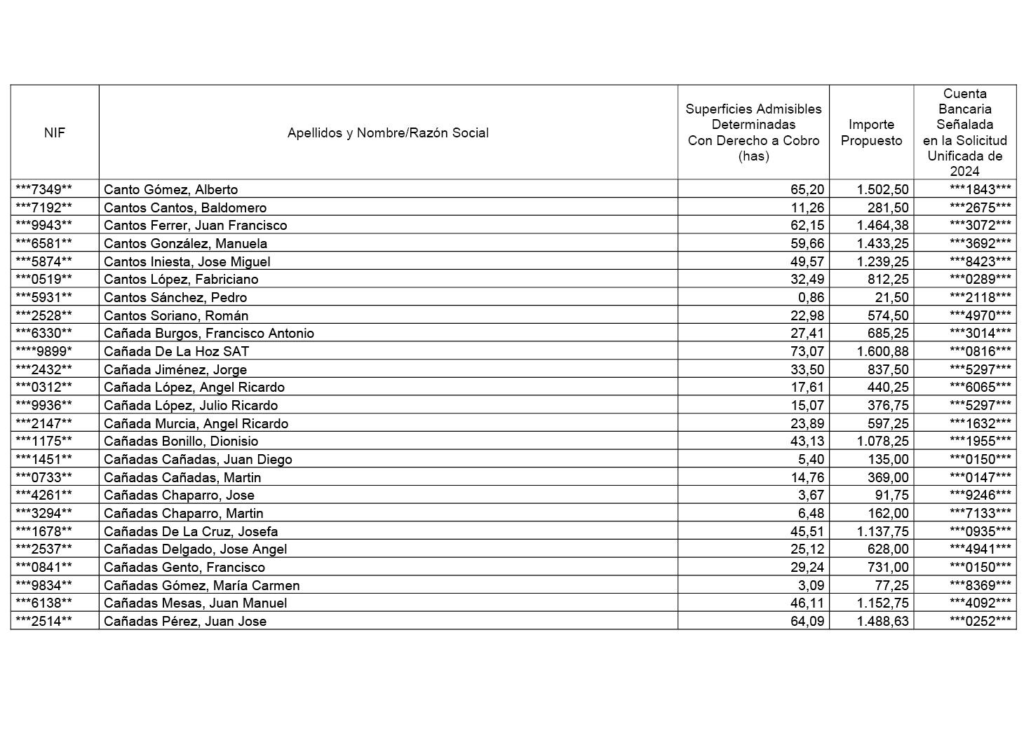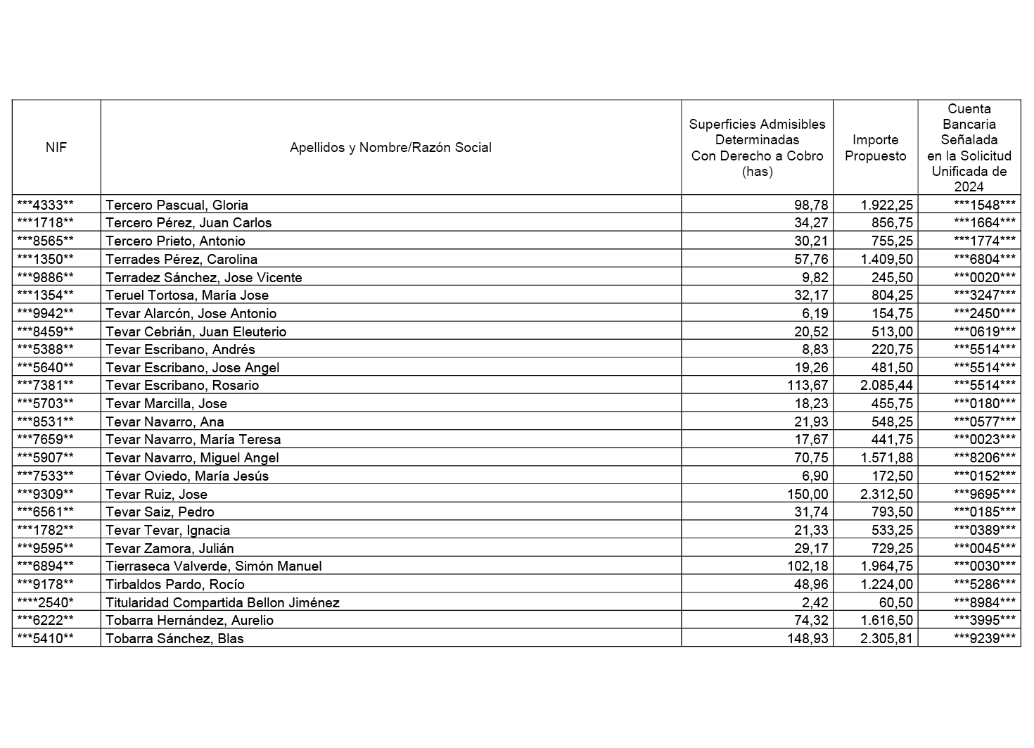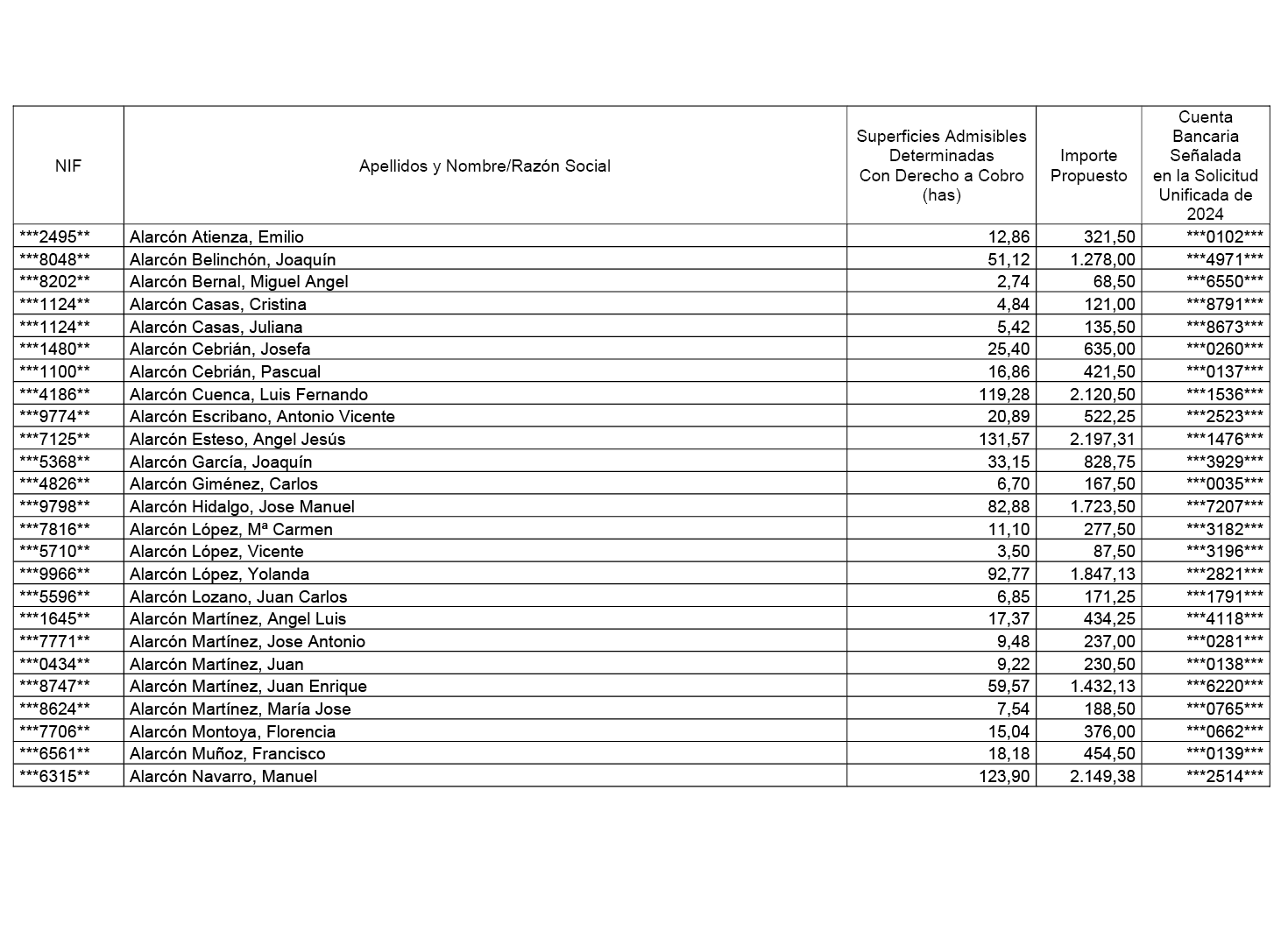 Vista la Propuesta de Resolución Definitiva de las ayudas previstas en el Decreto 59/2025, de 29 de julio, por el que se establecen las bases reguladoras, con carácter excepcional, en régimen de minimis, de ayudas dirigidas a personas titulares de explotaciones agrícolas de determinados sectores ubicadas en municipios de Castilla-La Mancha especialmente afectados por la sequía, durante el año hidrológico 2023-2024 y de conformidad con lo dispuesto en el artículo 6.3 del decreto referido que exige su publicación en el Diario Oficial de Castilla-La Mancha, con indicación, para cada una de las personas propuestas, de las superficies admisibles que motivan la concesión de la ayuda, los importes propuestos, así como los últimos dígitos de la cuenta bancaria señalada en la solicitud unificada de 2024, resuelvo: