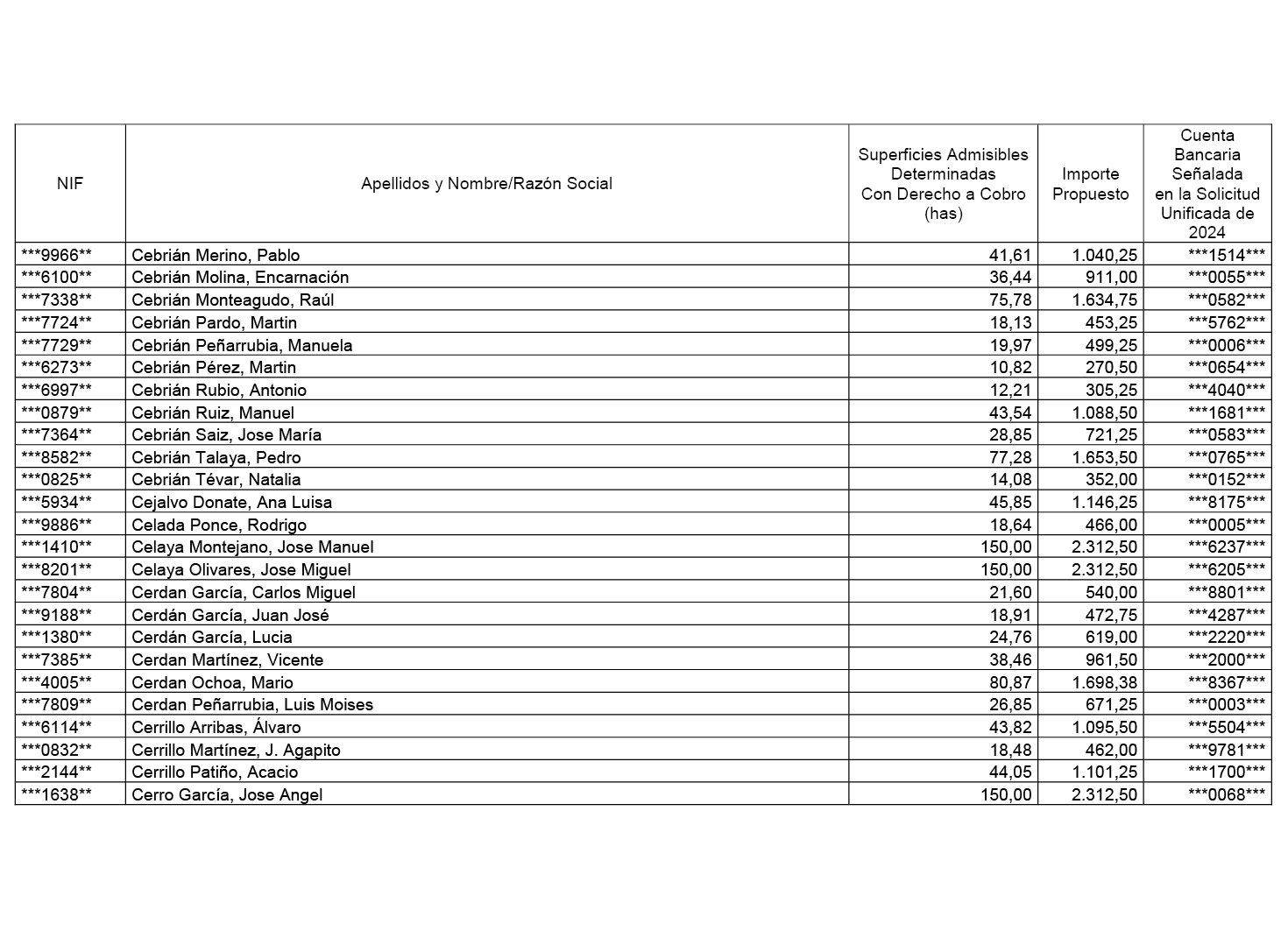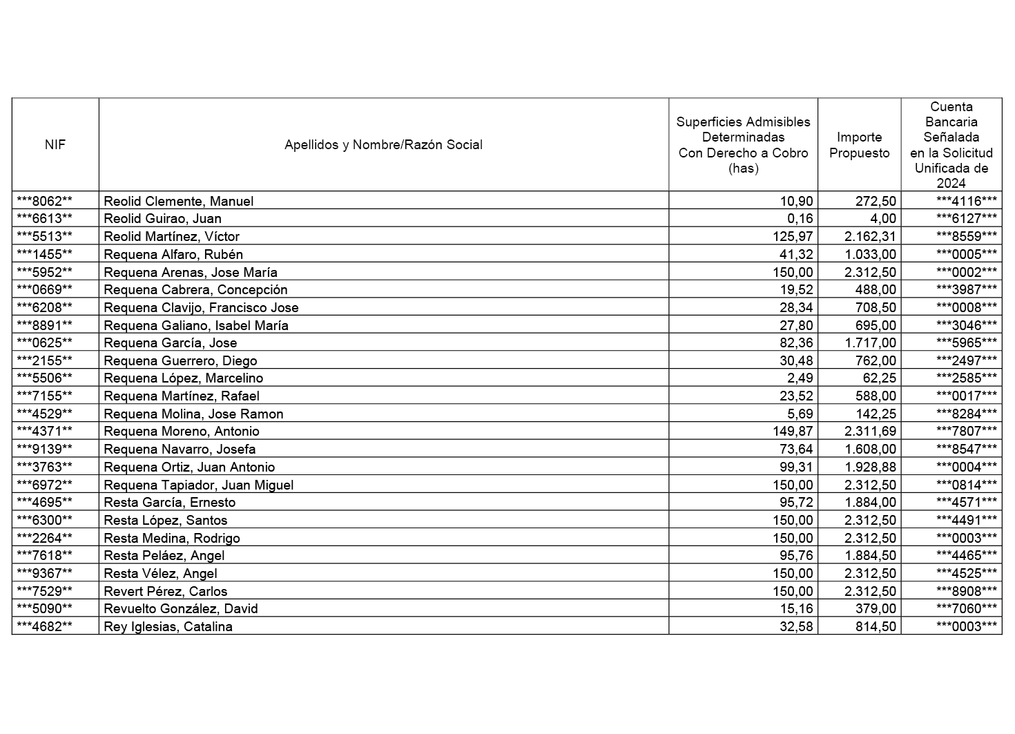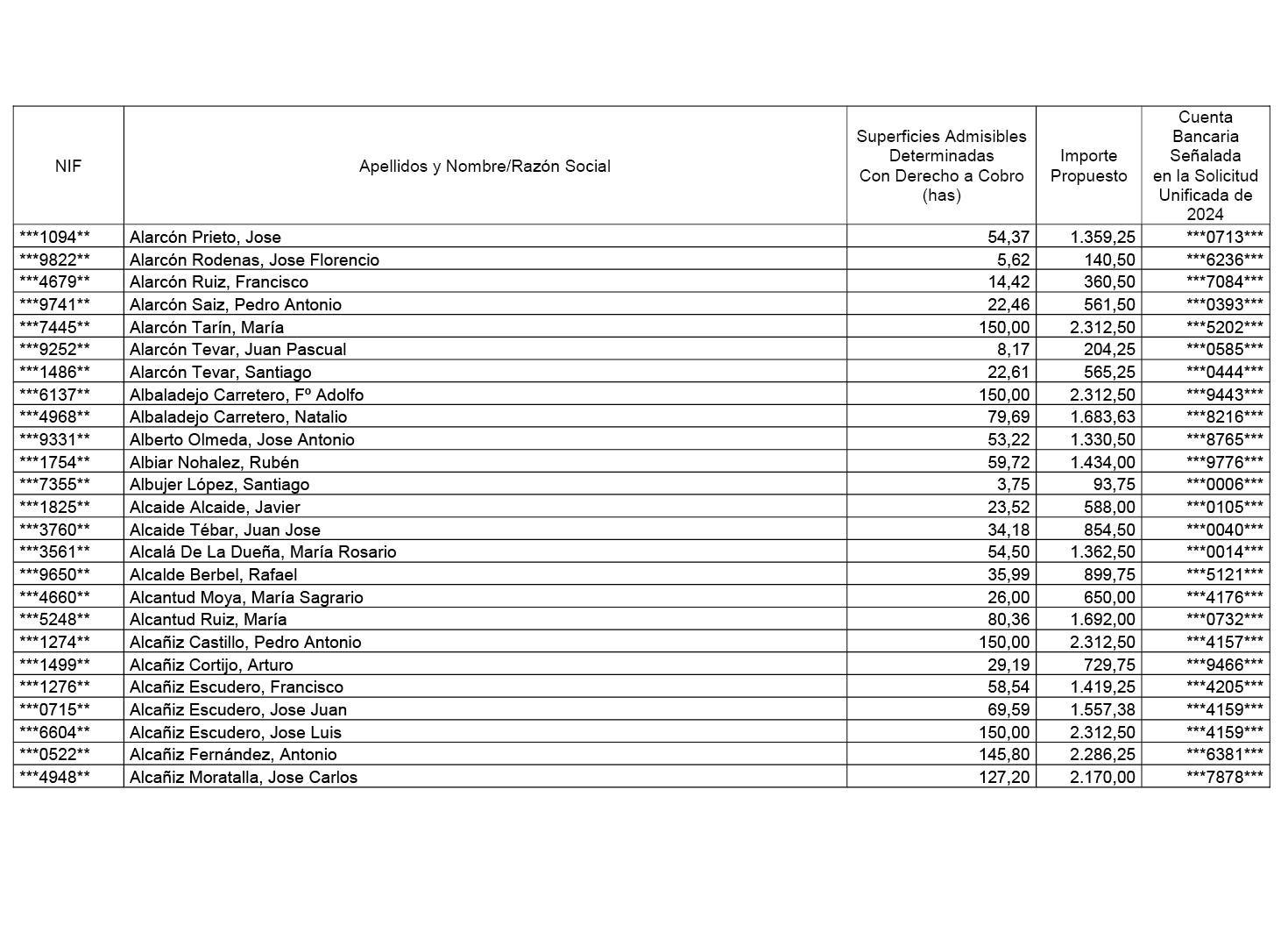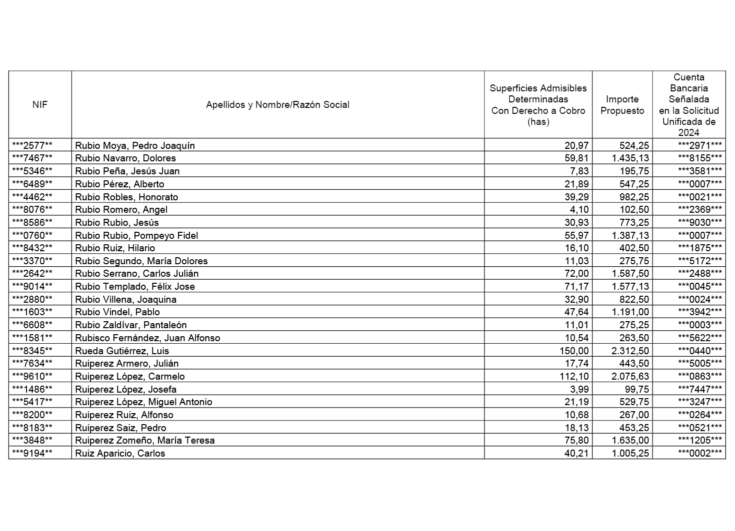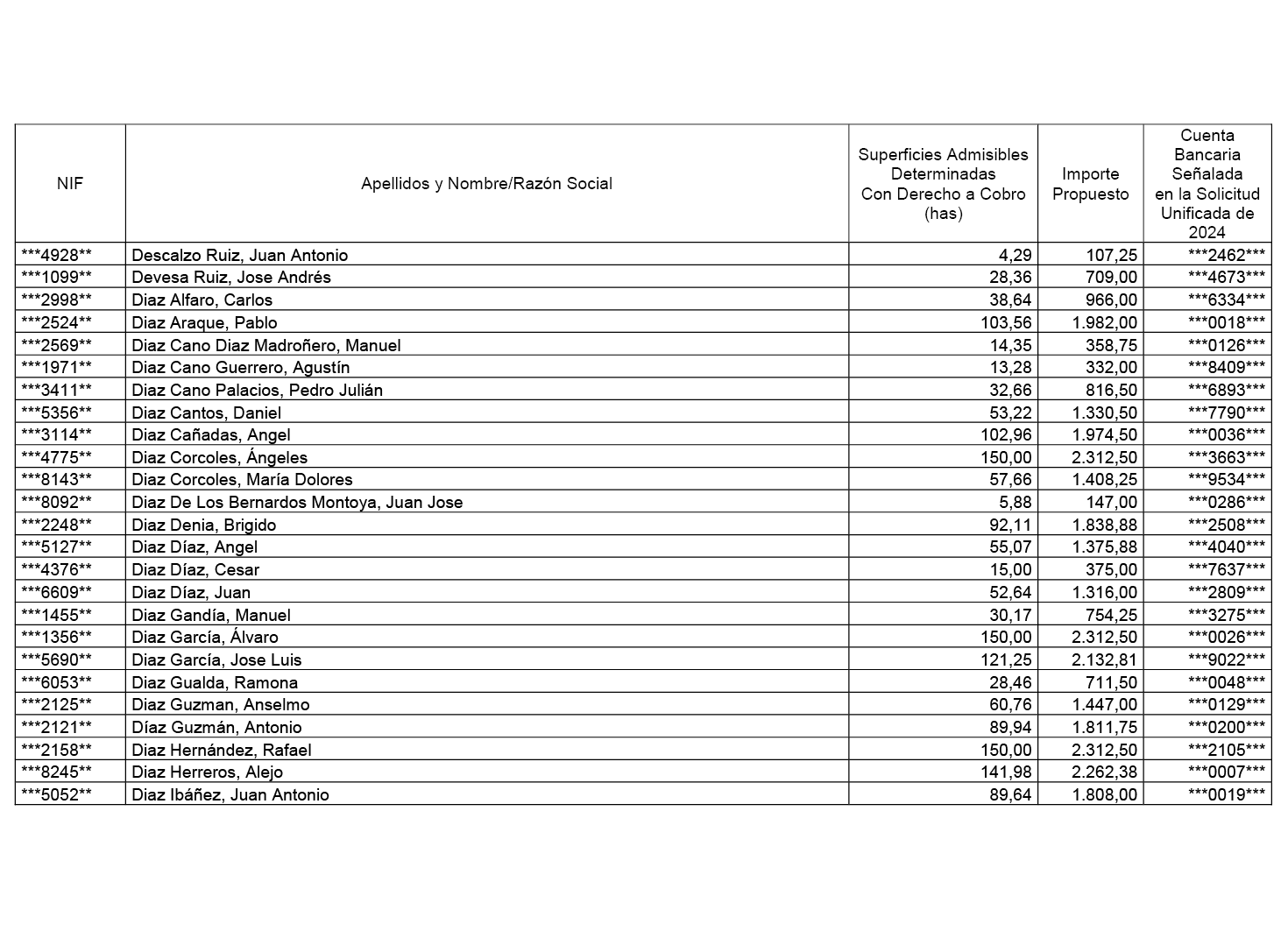 Vista la Propuesta de Resolución Definitiva de las ayudas previstas en el Decreto 59/2025, de 29 de julio, por el que se establecen las bases reguladoras, con carácter excepcional, en régimen de minimis, de ayudas dirigidas a personas titulares de explotaciones agrícolas de determinados sectores ubicadas en municipios de Castilla-La Mancha especialmente afectados por la sequía, durante el año hidrológico 2023-2024 y de conformidad con lo dispuesto en el artículo 6.3 del decreto referido que exige su publicación en el Diario Oficial de Castilla-La Mancha, con indicación, para cada una de las personas propuestas, de las superficies admisibles que motivan la concesión de la ayuda, los importes propuestos, así como los últimos dígitos de la cuenta bancaria señalada en la solicitud unificada de 2024, resuelvo: