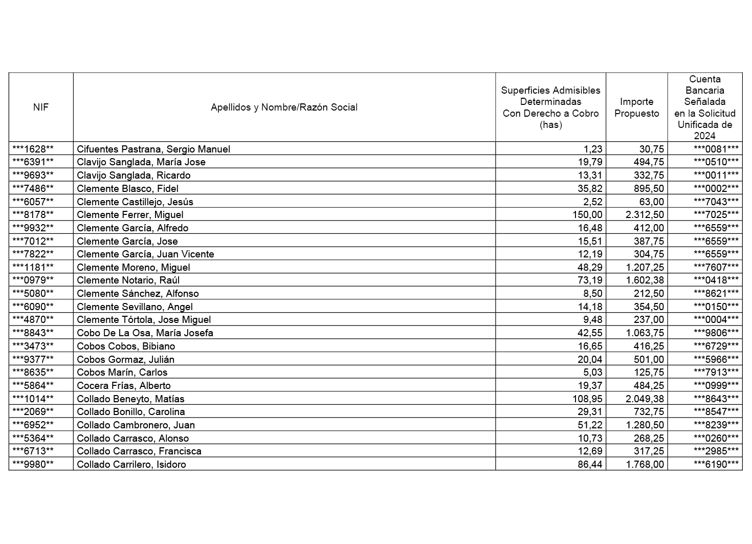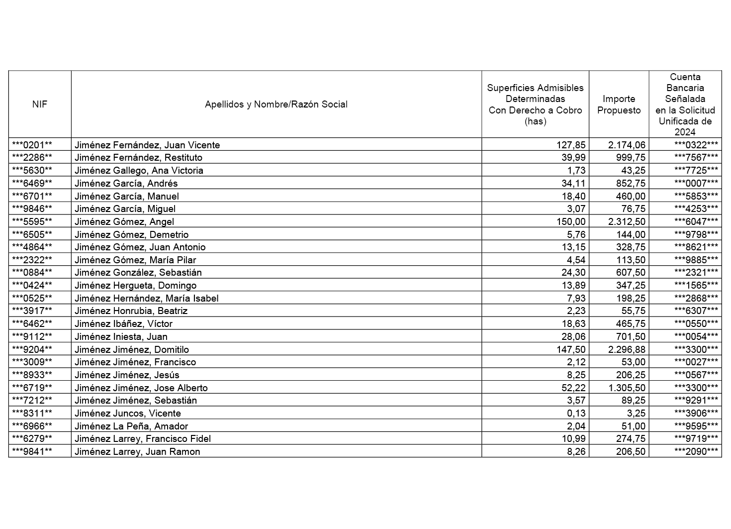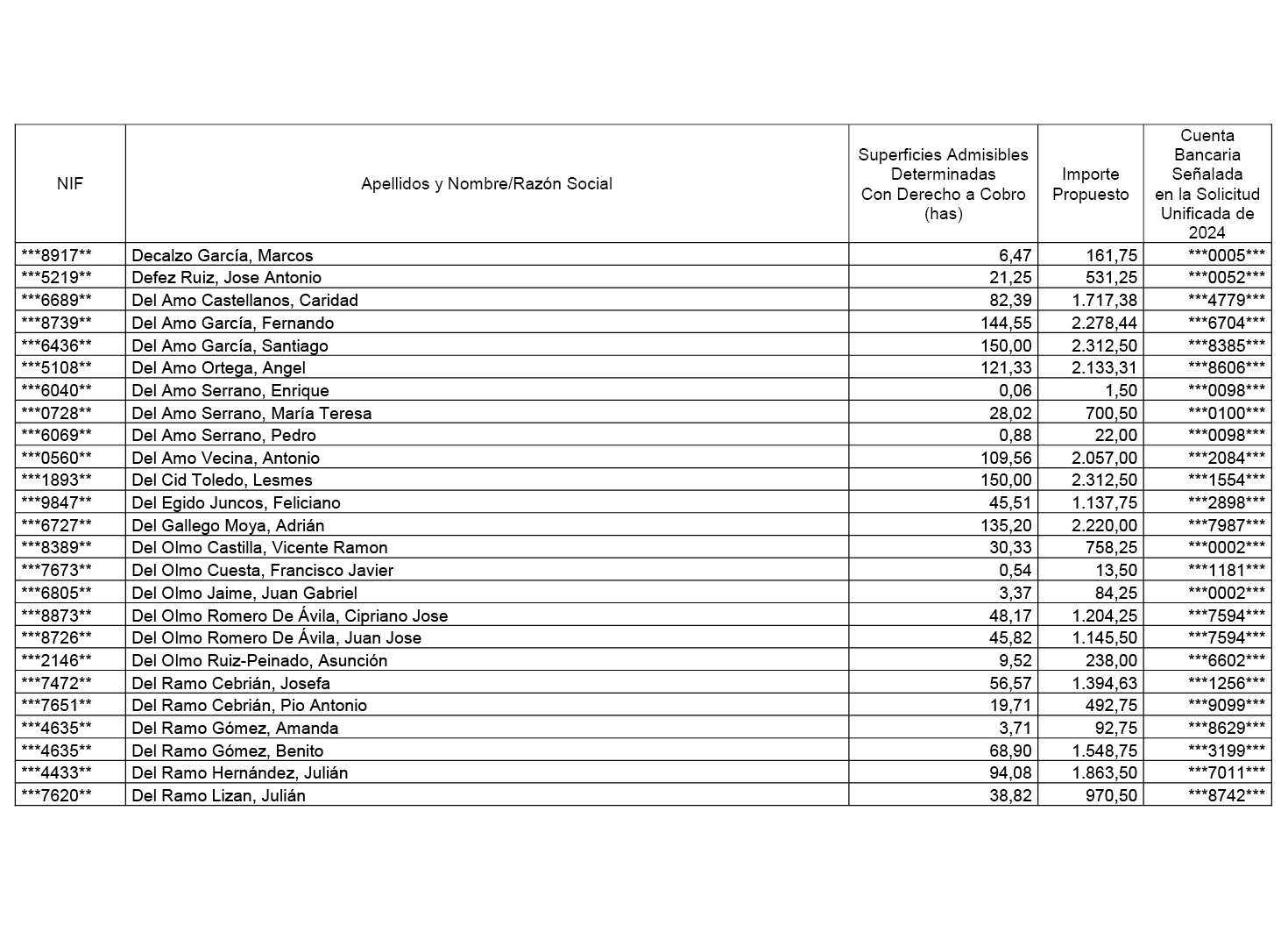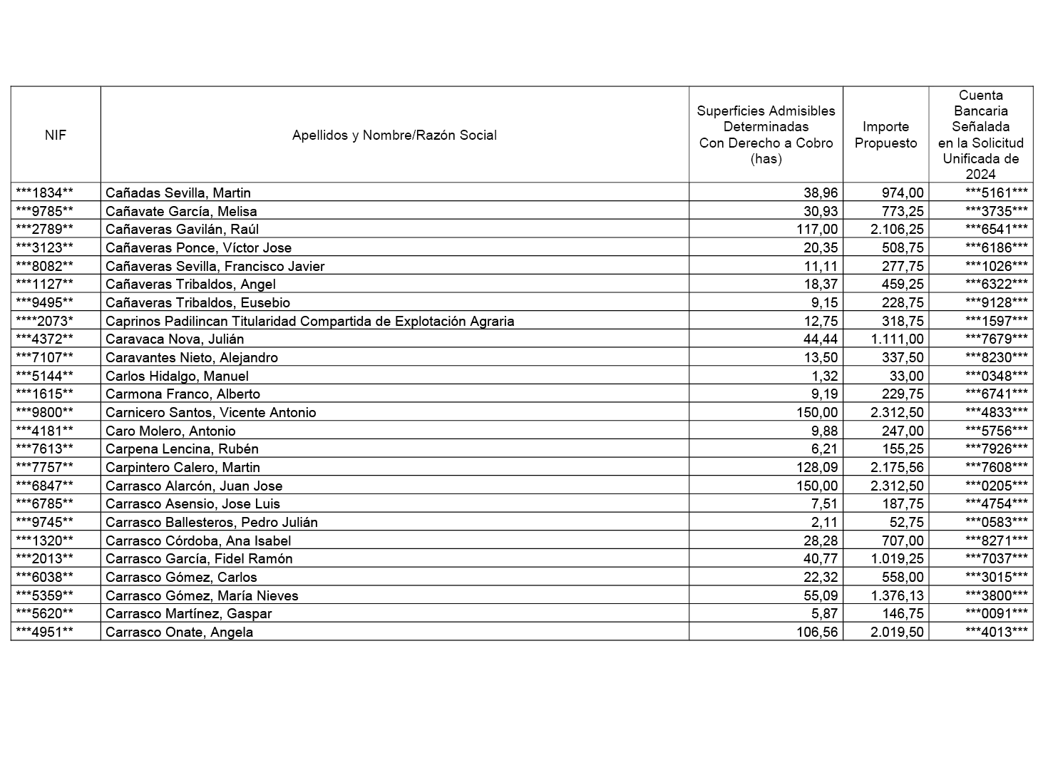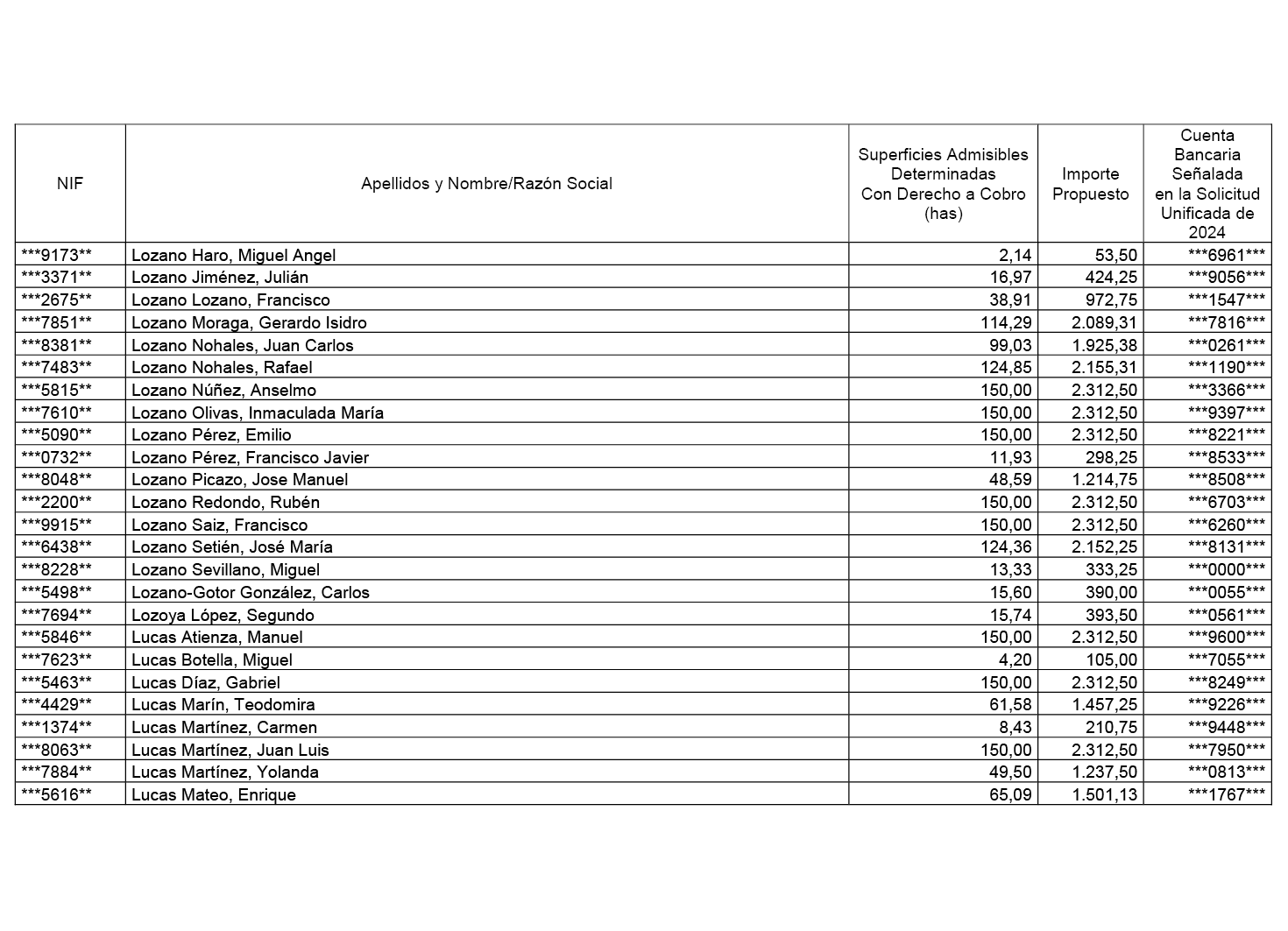 Vista la Propuesta de Resolución Definitiva de las ayudas previstas en el Decreto 59/2025, de 29 de julio, por el que se establecen las bases reguladoras, con carácter excepcional, en régimen de minimis, de ayudas dirigidas a personas titulares de explotaciones agrícolas de determinados sectores ubicadas en municipios de Castilla-La Mancha especialmente afectados por la sequía, durante el año hidrológico 2023-2024 y de conformidad con lo dispuesto en el artículo 6.3 del decreto referido que exige su publicación en el Diario Oficial de Castilla-La Mancha, con indicación, para cada una de las personas propuestas, de las superficies admisibles que motivan la concesión de la ayuda, los importes propuestos, así como los últimos dígitos de la cuenta bancaria señalada en la solicitud unificada de 2024, resuelvo: