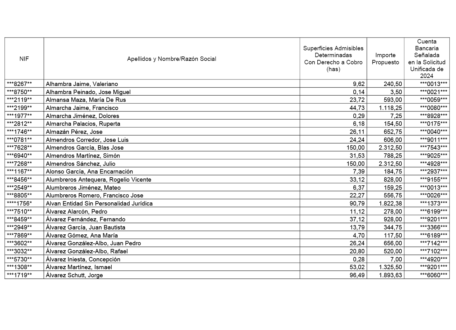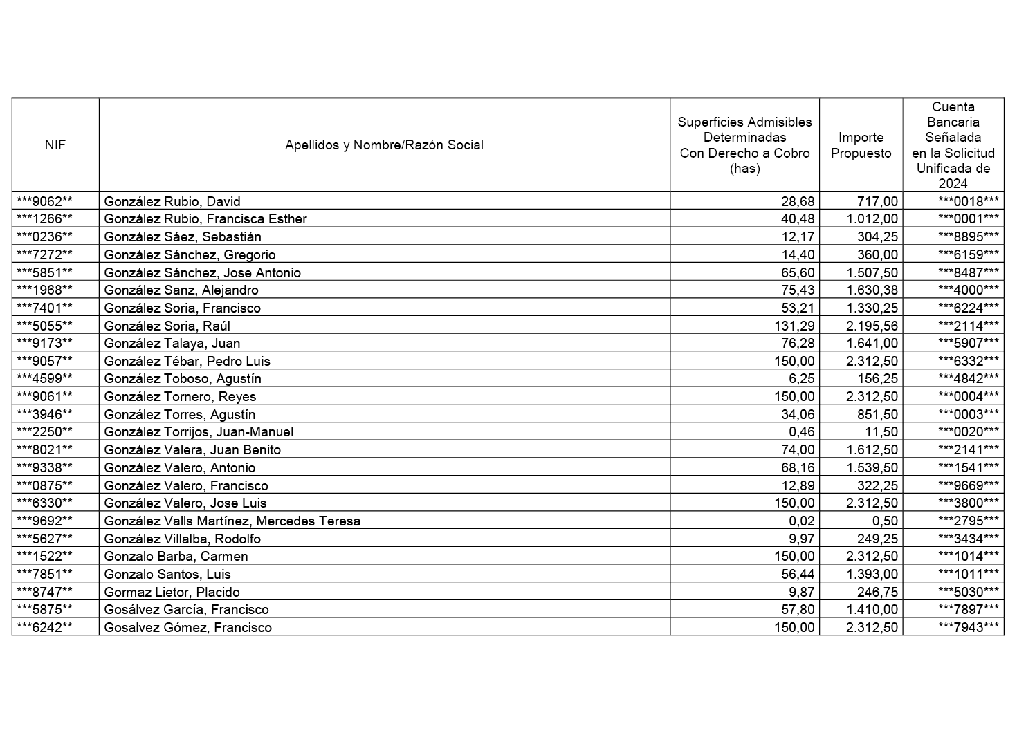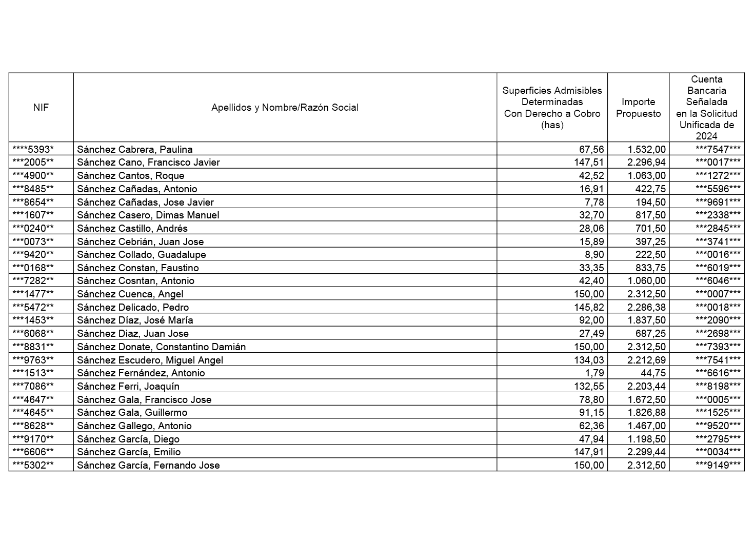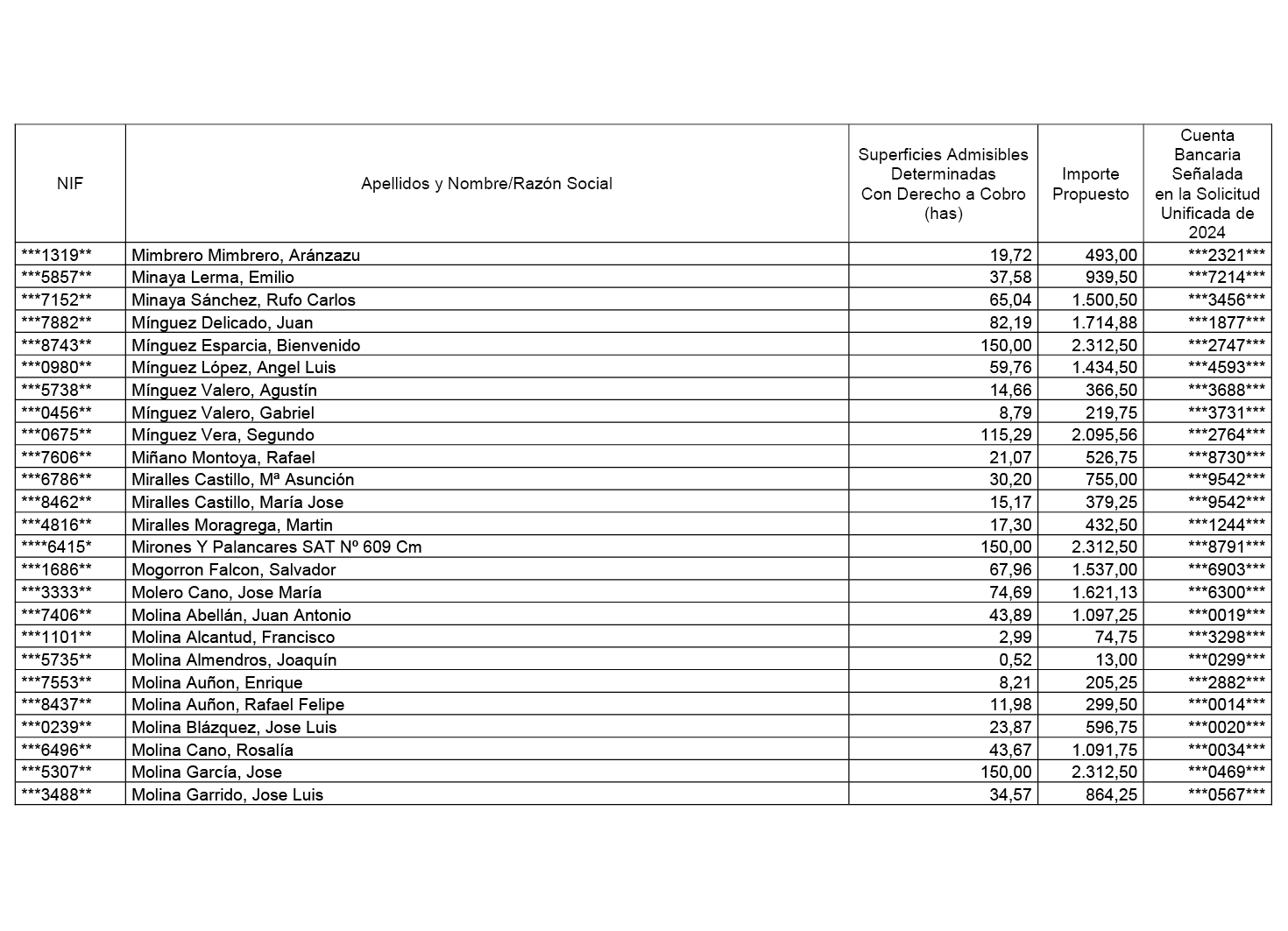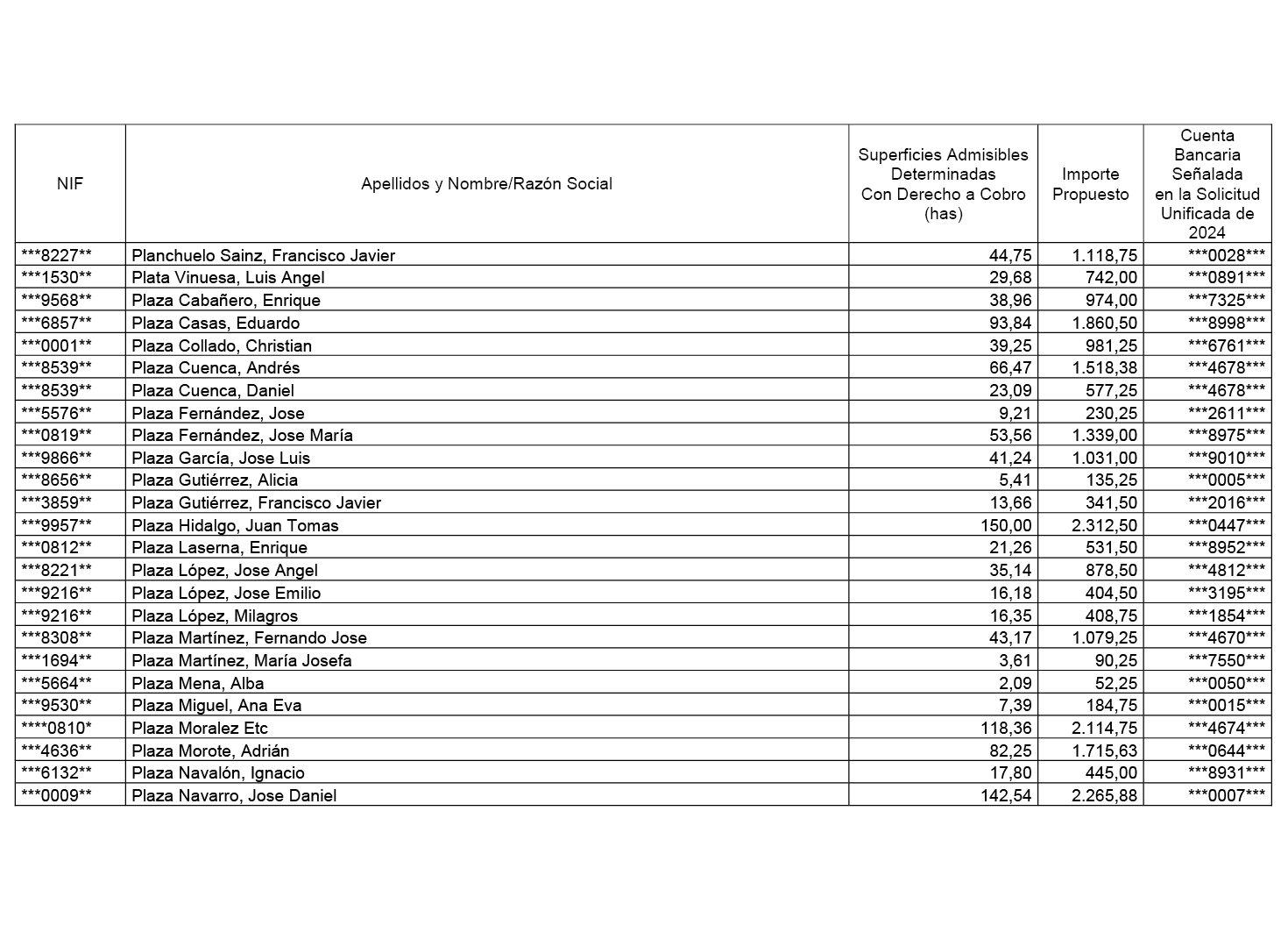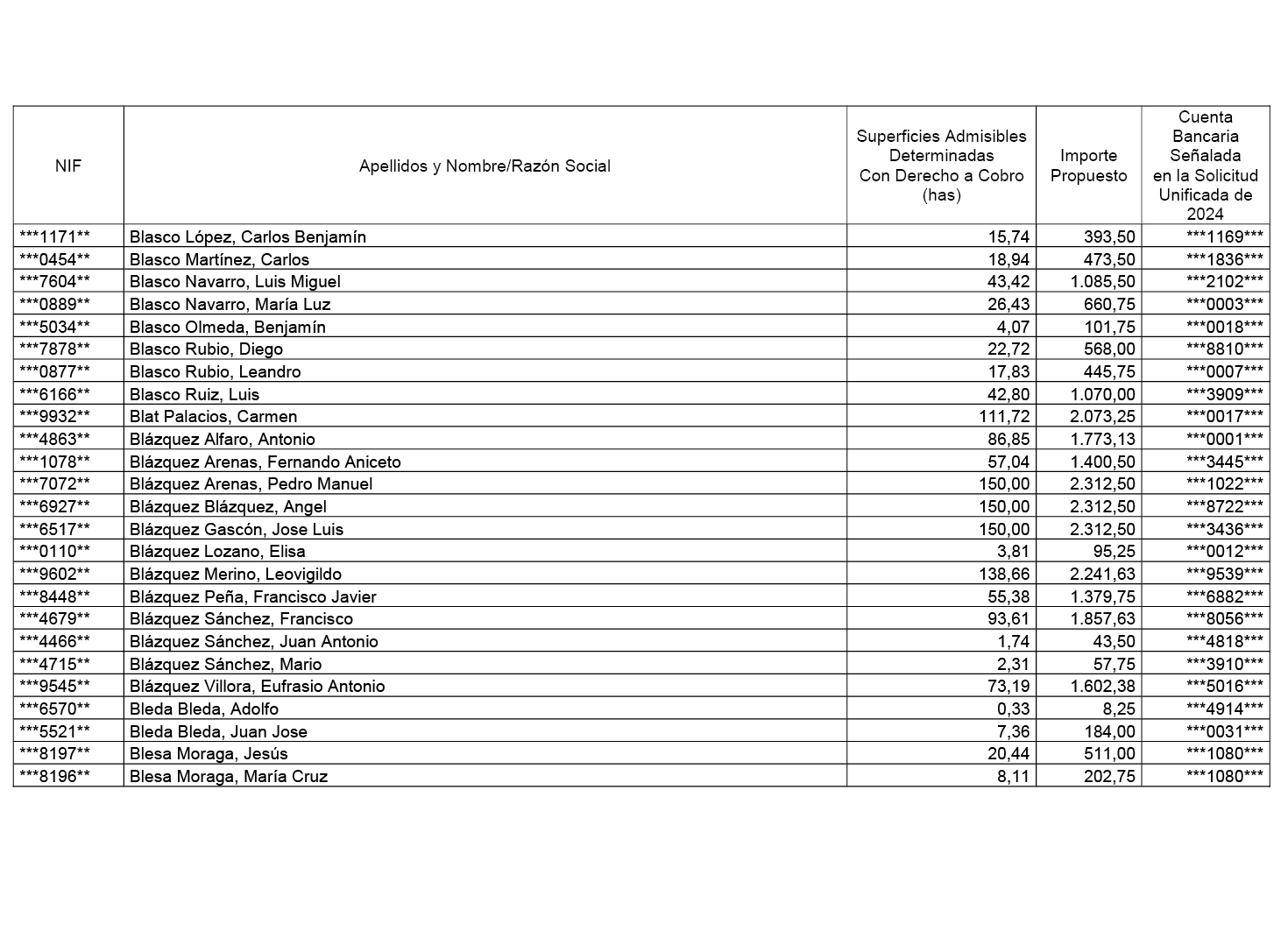 Vista la Propuesta de Resolución Definitiva de las ayudas previstas en el Decreto 59/2025, de 29 de julio, por el que se establecen las bases reguladoras, con carácter excepcional, en régimen de minimis, de ayudas dirigidas a personas titulares de explotaciones agrícolas de determinados sectores ubicadas en municipios de Castilla-La Mancha especialmente afectados por la sequía, durante el año hidrológico 2023-2024 y de conformidad con lo dispuesto en el artículo 6.3 del decreto referido que exige su publicación en el Diario Oficial de Castilla-La Mancha, con indicación, para cada una de las personas propuestas, de las superficies admisibles que motivan la concesión de la ayuda, los importes propuestos, así como los últimos dígitos de la cuenta bancaria señalada en la solicitud unificada de 2024, resuelvo: