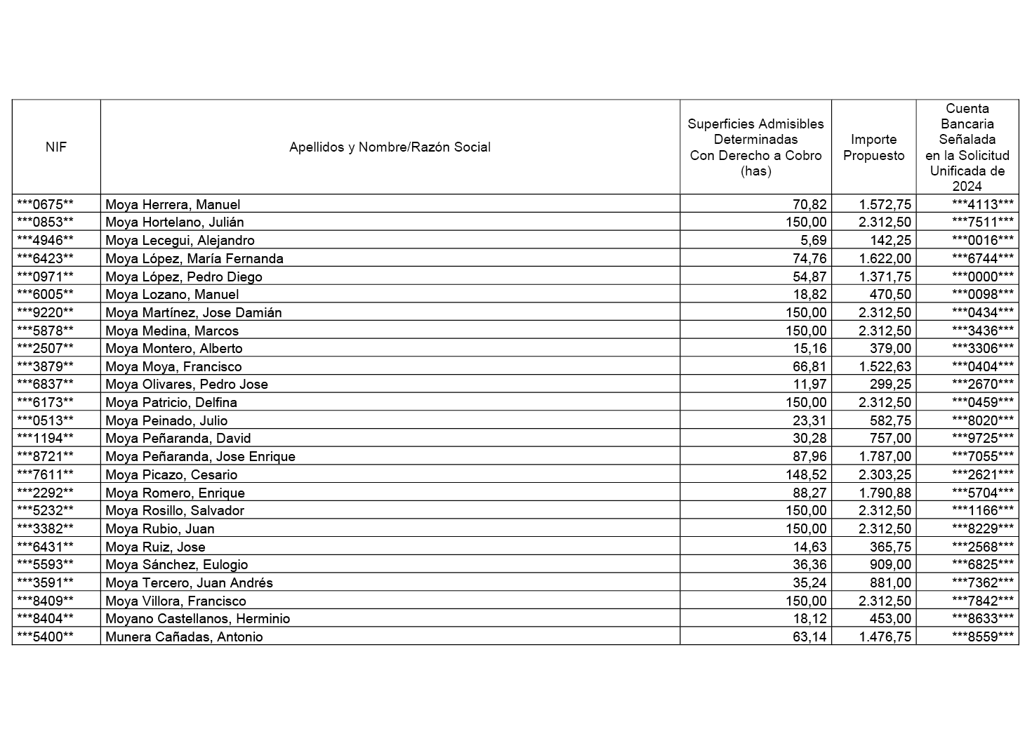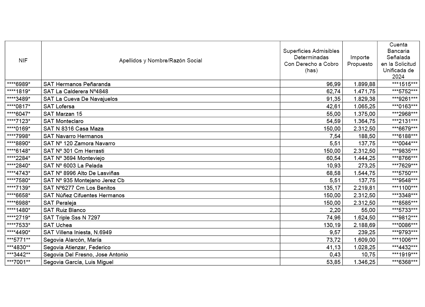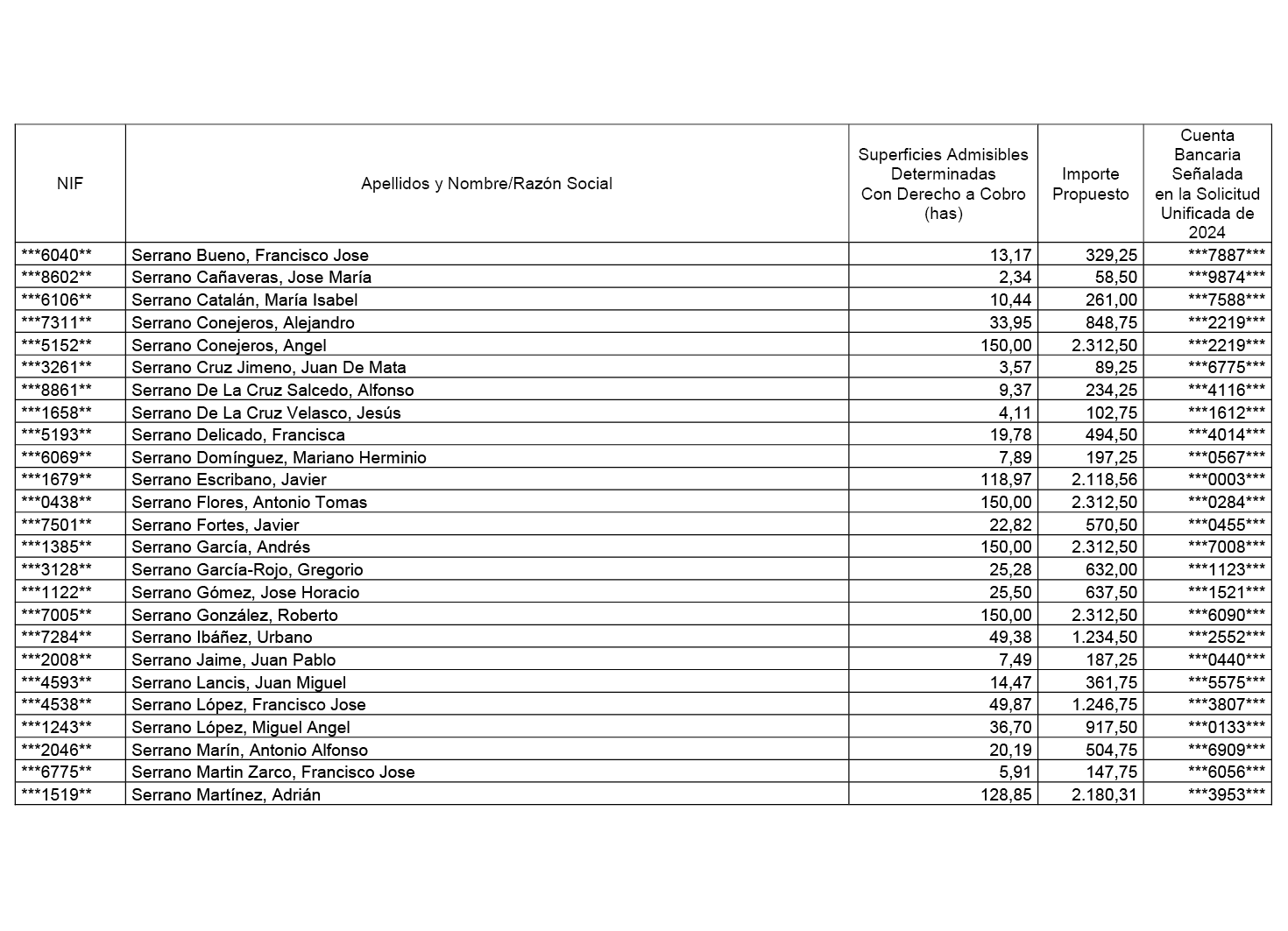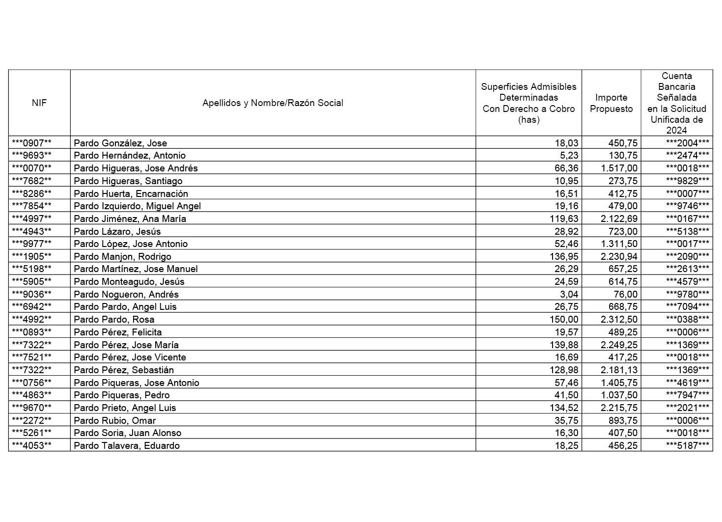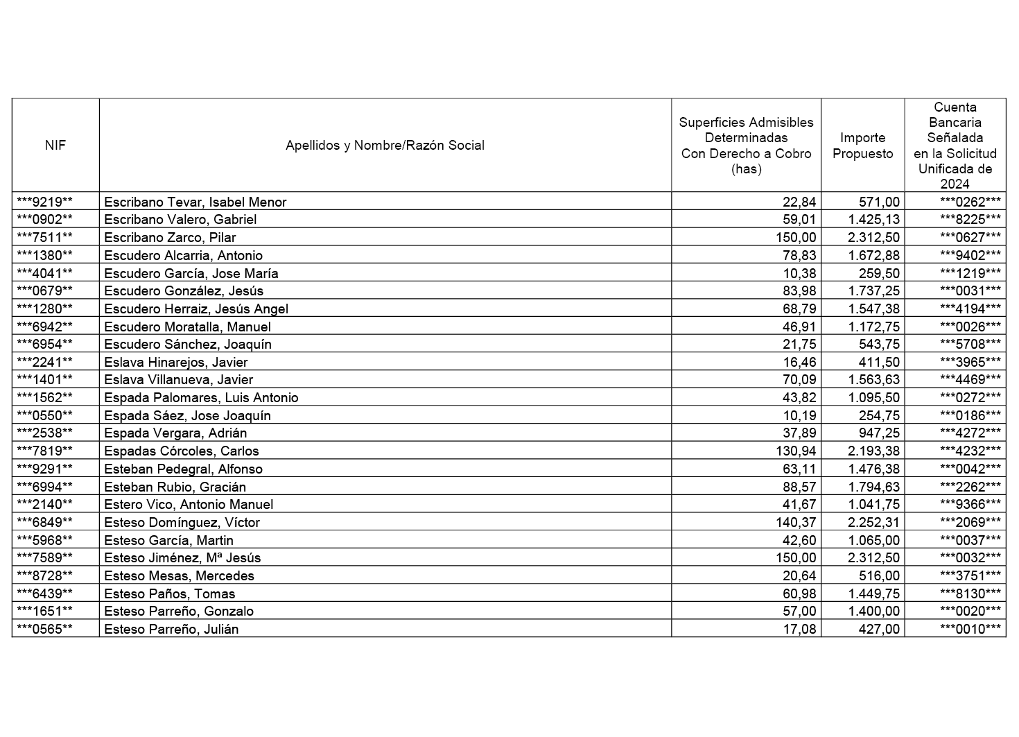 Vista la Propuesta de Resolución Definitiva de las ayudas previstas en el Decreto 59/2025, de 29 de julio, por el que se establecen las bases reguladoras, con carácter excepcional, en régimen de minimis, de ayudas dirigidas a personas titulares de explotaciones agrícolas de determinados sectores ubicadas en municipios de Castilla-La Mancha especialmente afectados por la sequía, durante el año hidrológico 2023-2024 y de conformidad con lo dispuesto en el artículo 6.3 del decreto referido que exige su publicación en el Diario Oficial de Castilla-La Mancha, con indicación, para cada una de las personas propuestas, de las superficies admisibles que motivan la concesión de la ayuda, los importes propuestos, así como los últimos dígitos de la cuenta bancaria señalada en la solicitud unificada de 2024, resuelvo: