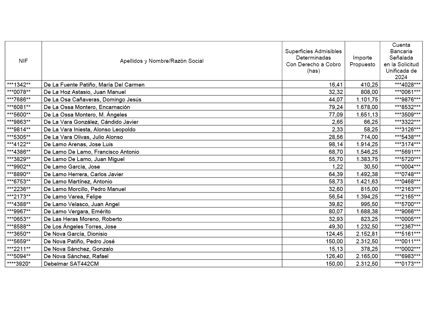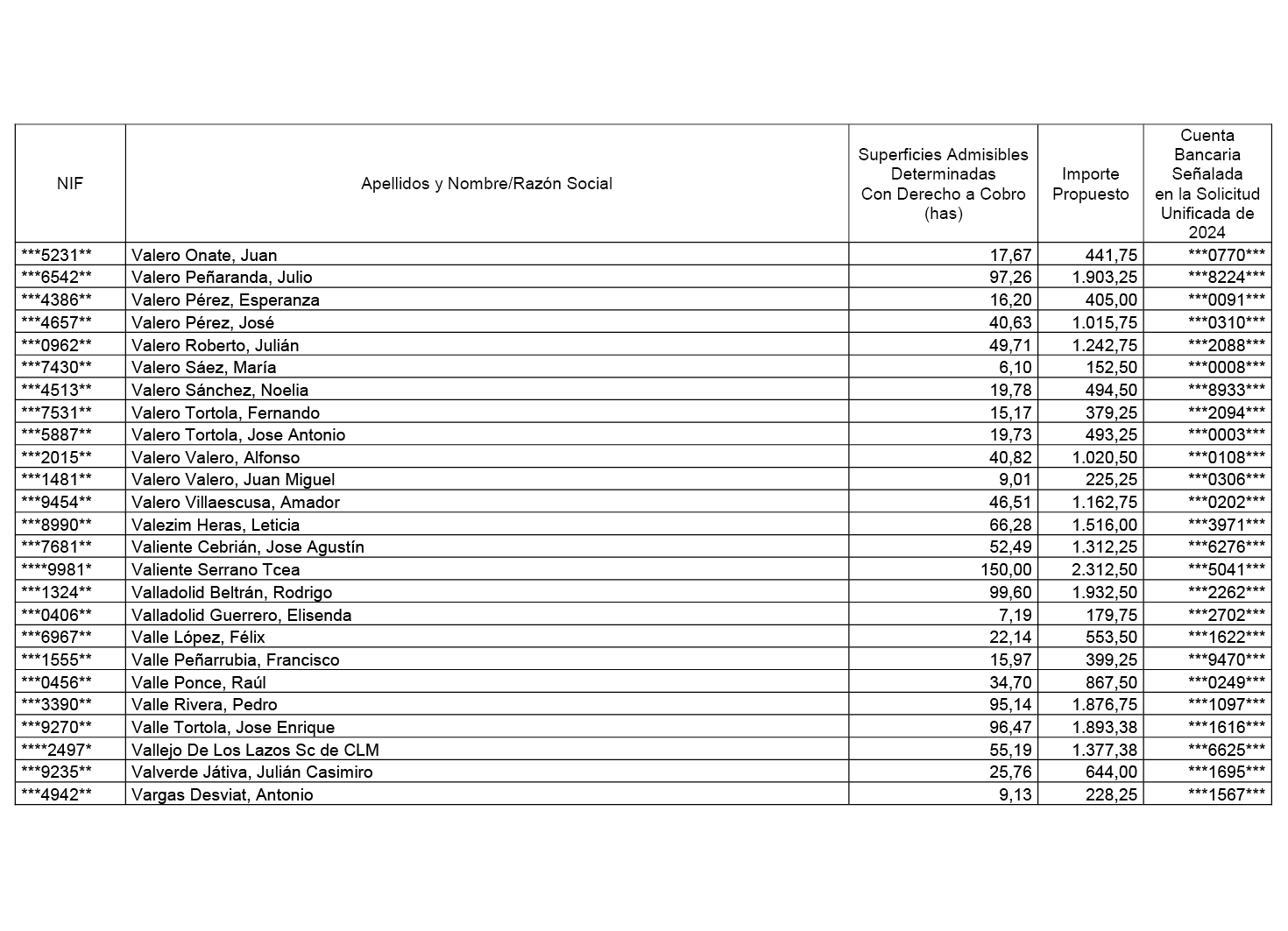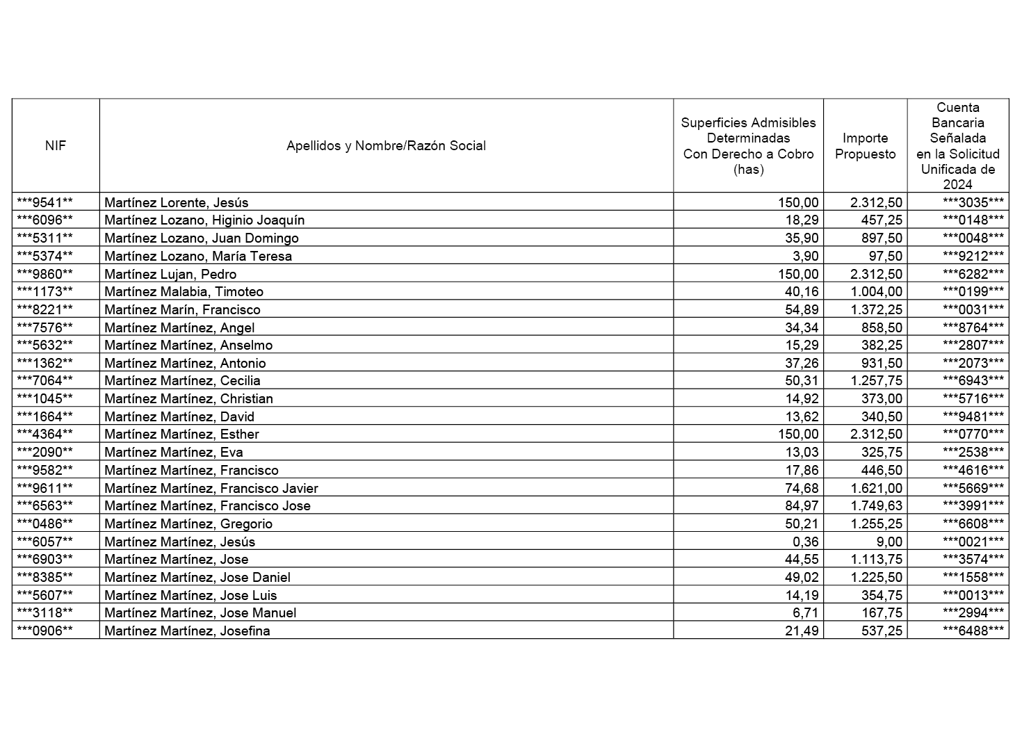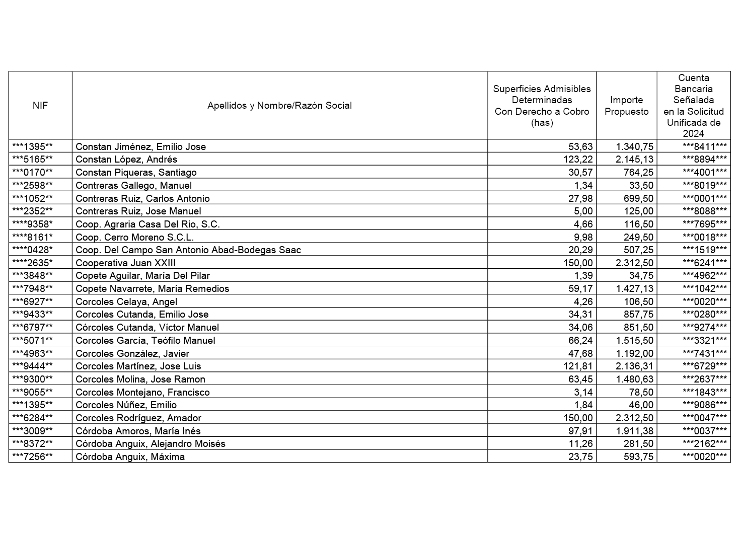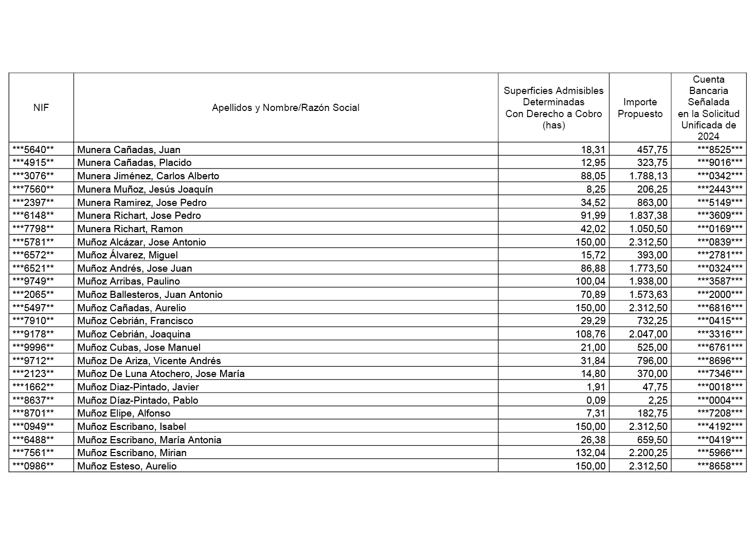 Vista la Propuesta de Resolución Definitiva de las ayudas previstas en el Decreto 59/2025, de 29 de julio, por el que se establecen las bases reguladoras, con carácter excepcional, en régimen de minimis, de ayudas dirigidas a personas titulares de explotaciones agrícolas de determinados sectores ubicadas en municipios de Castilla-La Mancha especialmente afectados por la sequía, durante el año hidrológico 2023-2024 y de conformidad con lo dispuesto en el artículo 6.3 del decreto referido que exige su publicación en el Diario Oficial de Castilla-La Mancha, con indicación, para cada una de las personas propuestas, de las superficies admisibles que motivan la concesión de la ayuda, los importes propuestos, así como los últimos dígitos de la cuenta bancaria señalada en la solicitud unificada de 2024, resuelvo: