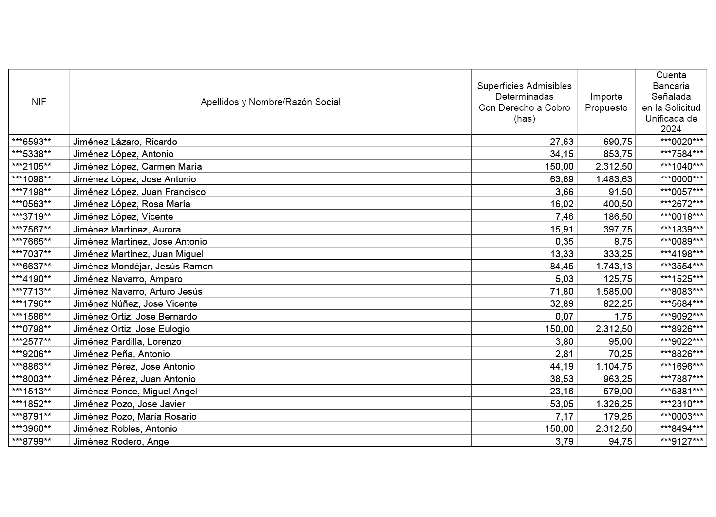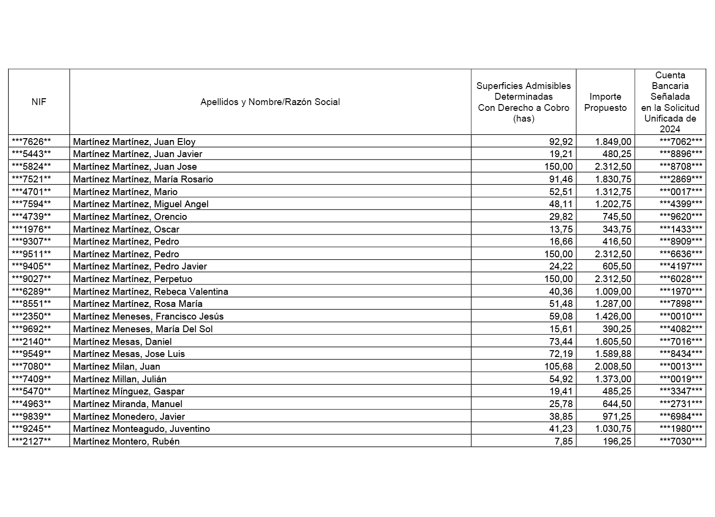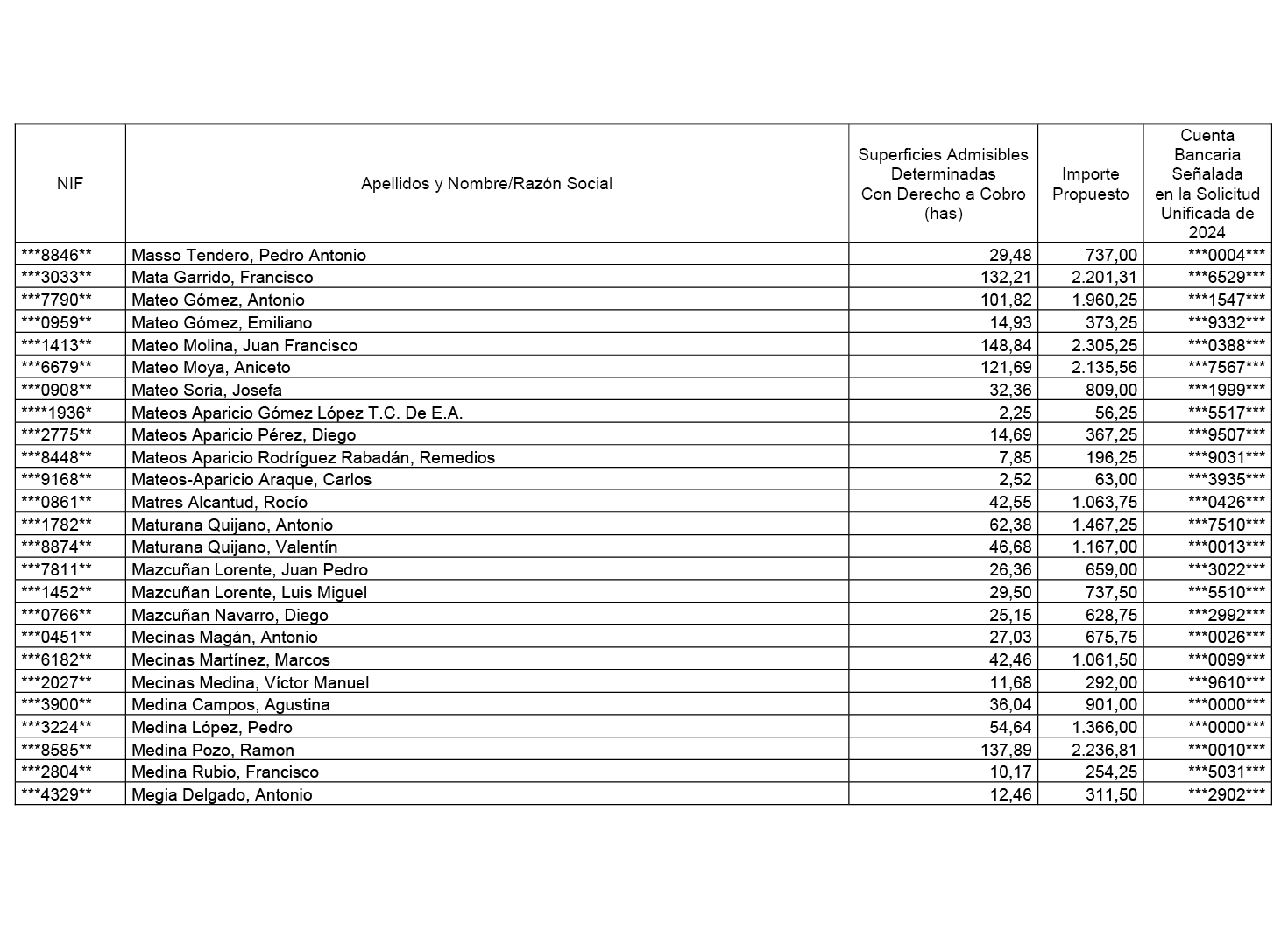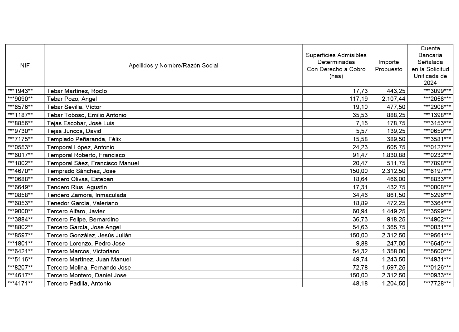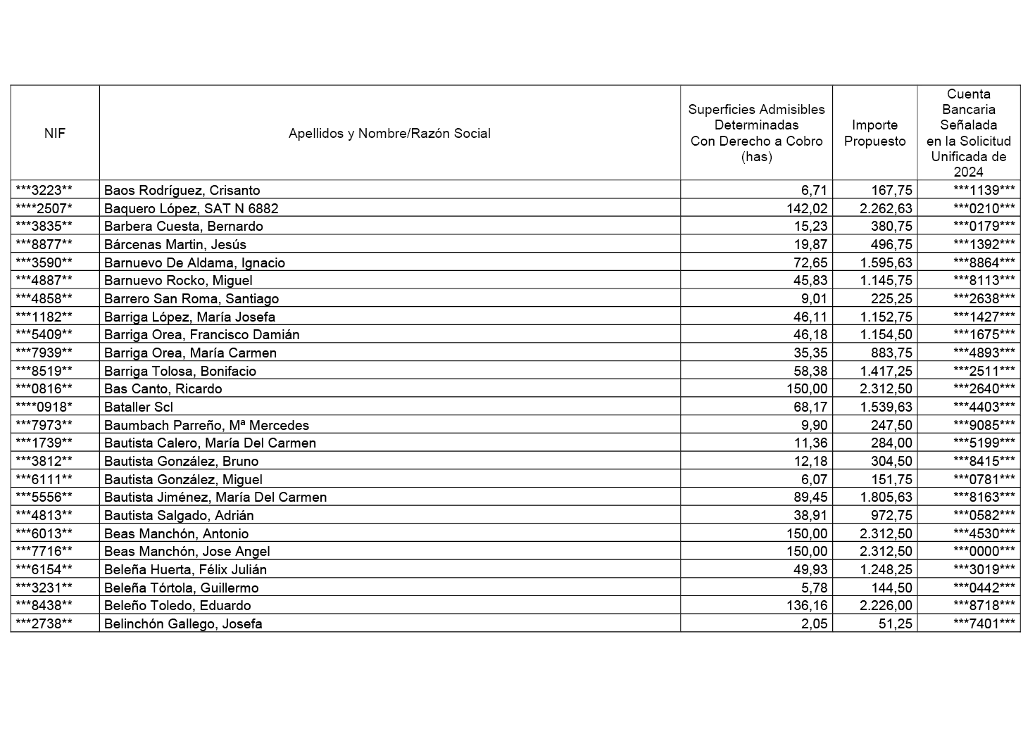 Vista la Propuesta de Resolución Definitiva de las ayudas previstas en el Decreto 59/2025, de 29 de julio, por el que se establecen las bases reguladoras, con carácter excepcional, en régimen de minimis, de ayudas dirigidas a personas titulares de explotaciones agrícolas de determinados sectores ubicadas en municipios de Castilla-La Mancha especialmente afectados por la sequía, durante el año hidrológico 2023-2024 y de conformidad con lo dispuesto en el artículo 6.3 del decreto referido que exige su publicación en el Diario Oficial de Castilla-La Mancha, con indicación, para cada una de las personas propuestas, de las superficies admisibles que motivan la concesión de la ayuda, los importes propuestos, así como los últimos dígitos de la cuenta bancaria señalada en la solicitud unificada de 2024, resuelvo: