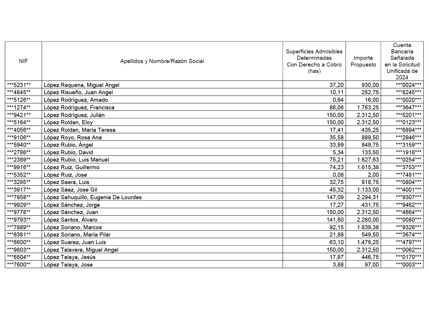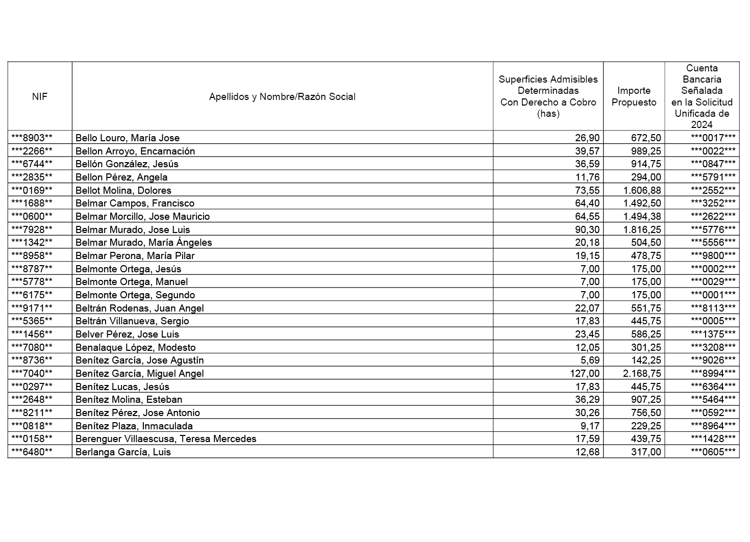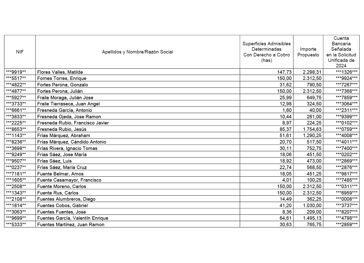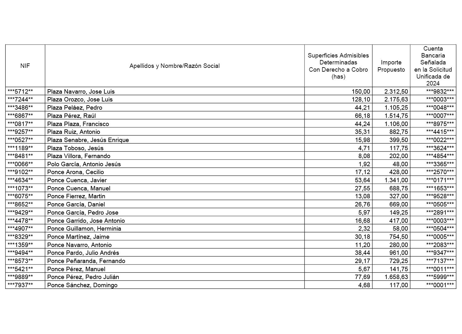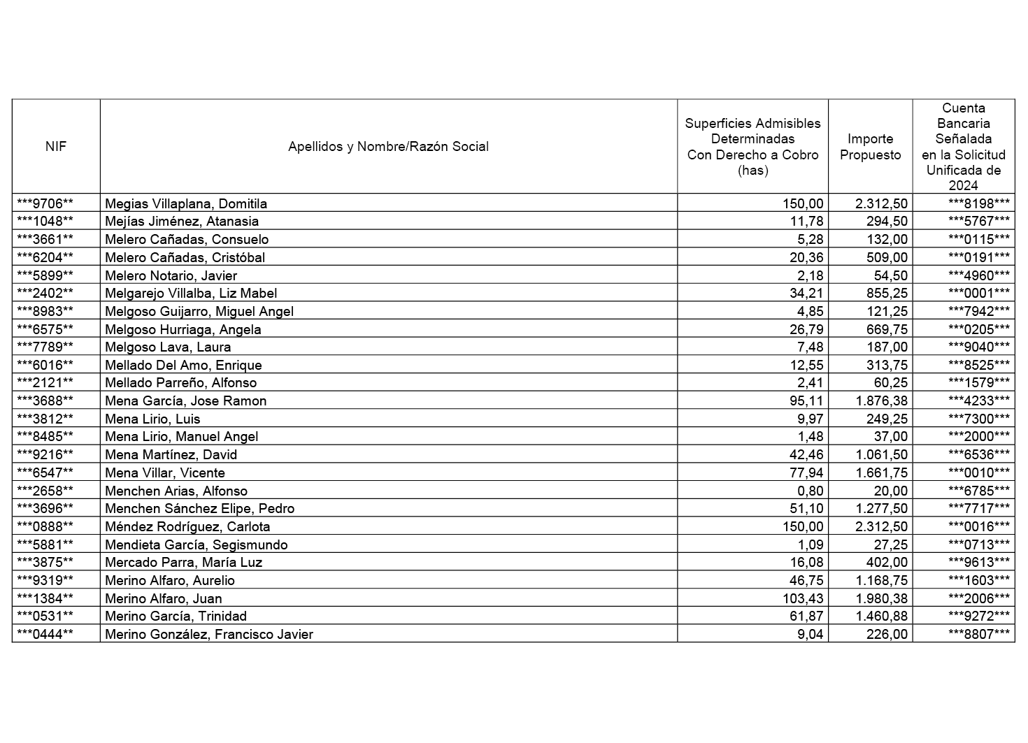 Vista la Propuesta de Resolución Definitiva de las ayudas previstas en el Decreto 59/2025, de 29 de julio, por el que se establecen las bases reguladoras, con carácter excepcional, en régimen de minimis, de ayudas dirigidas a personas titulares de explotaciones agrícolas de determinados sectores ubicadas en municipios de Castilla-La Mancha especialmente afectados por la sequía, durante el año hidrológico 2023-2024 y de conformidad con lo dispuesto en el artículo 6.3 del decreto referido que exige su publicación en el Diario Oficial de Castilla-La Mancha, con indicación, para cada una de las personas propuestas, de las superficies admisibles que motivan la concesión de la ayuda, los importes propuestos, así como los últimos dígitos de la cuenta bancaria señalada en la solicitud unificada de 2024, resuelvo: