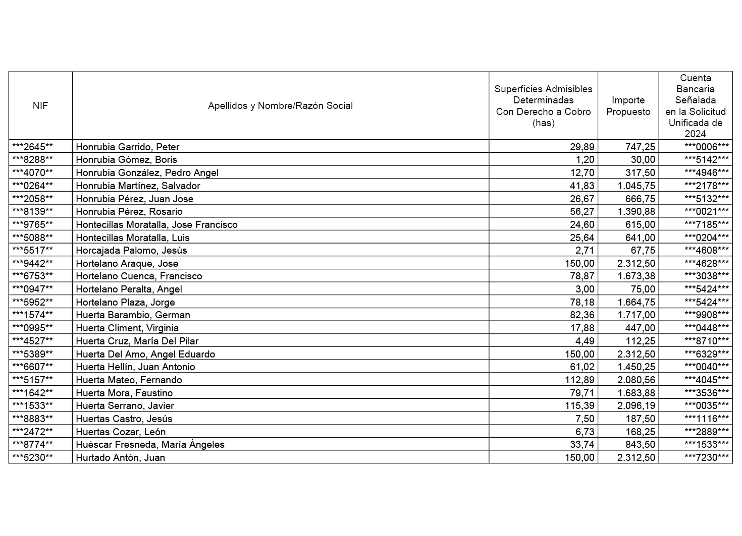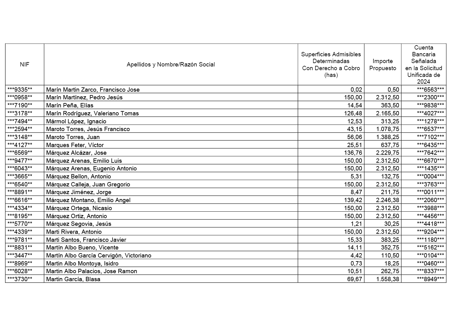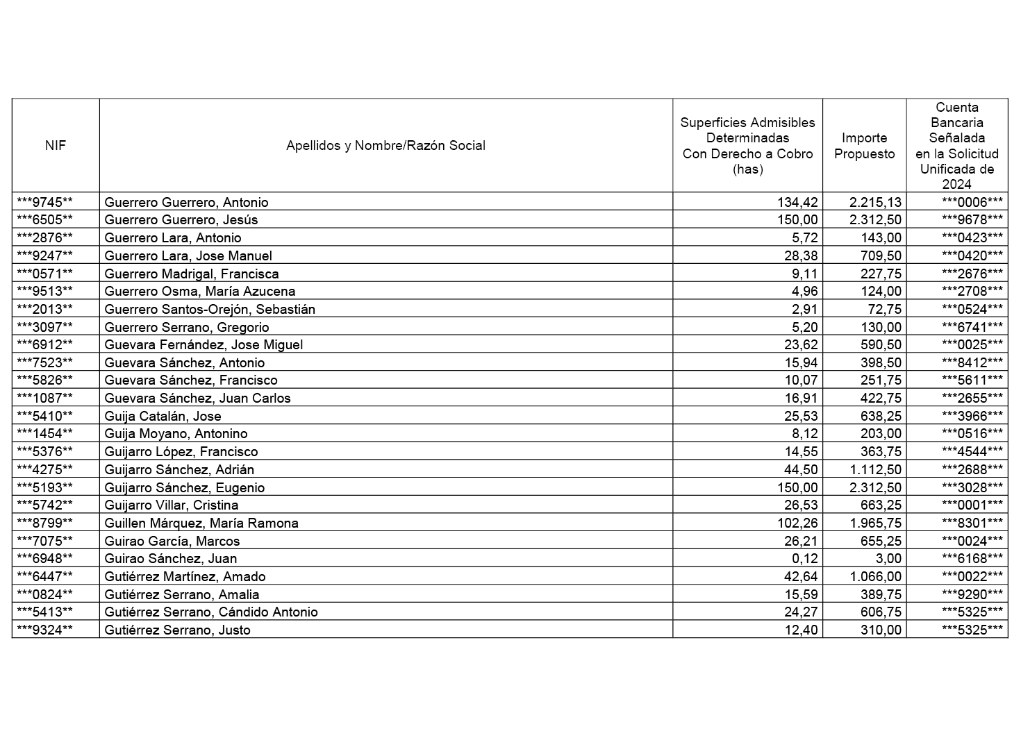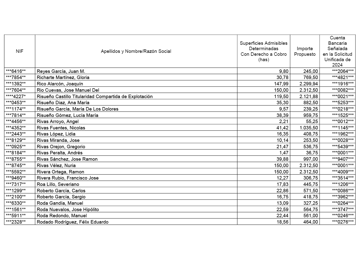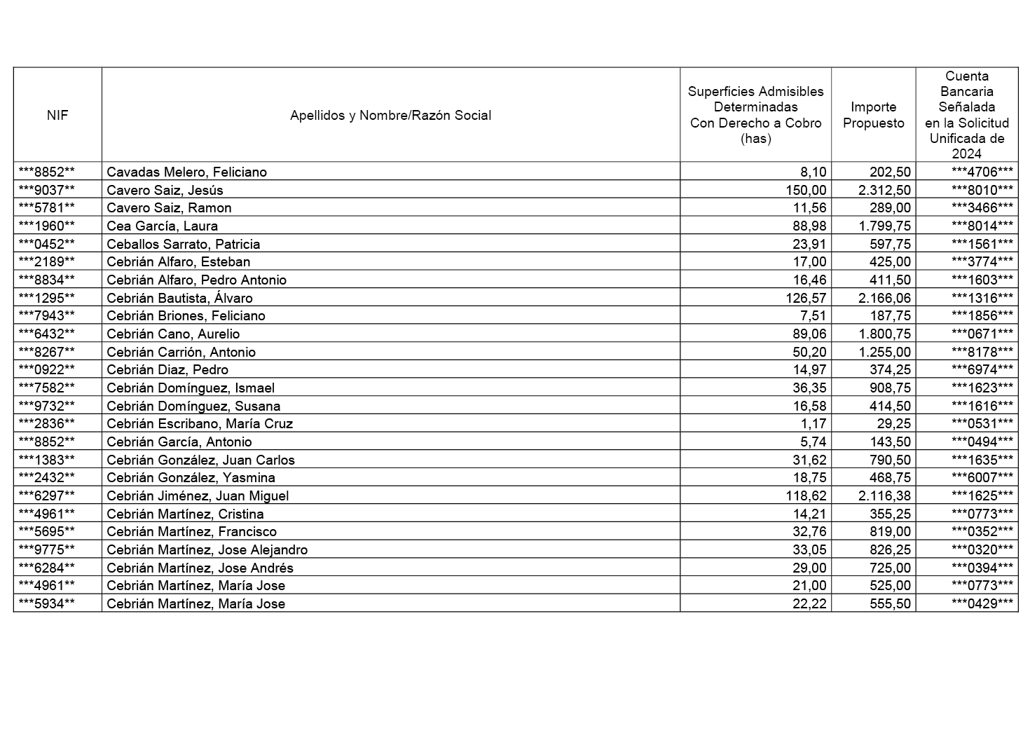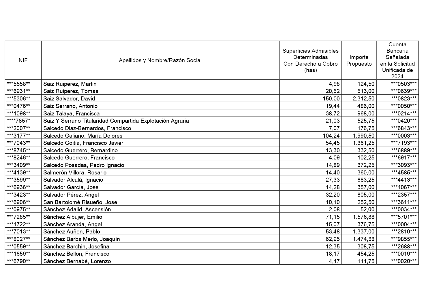 Vista la Propuesta de Resolución Definitiva de las ayudas previstas en el Decreto 59/2025, de 29 de julio, por el que se establecen las bases reguladoras, con carácter excepcional, en régimen de minimis, de ayudas dirigidas a personas titulares de explotaciones agrícolas de determinados sectores ubicadas en municipios de Castilla-La Mancha especialmente afectados por la sequía, durante el año hidrológico 2023-2024 y de conformidad con lo dispuesto en el artículo 6.3 del decreto referido que exige su publicación en el Diario Oficial de Castilla-La Mancha, con indicación, para cada una de las personas propuestas, de las superficies admisibles que motivan la concesión de la ayuda, los importes propuestos, así como los últimos dígitos de la cuenta bancaria señalada en la solicitud unificada de 2024, resuelvo: