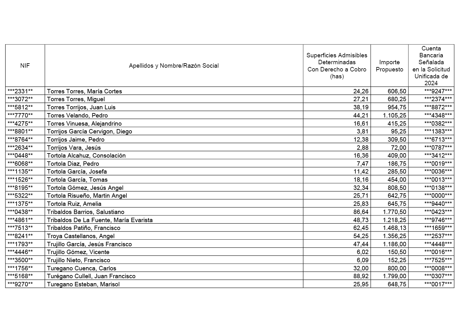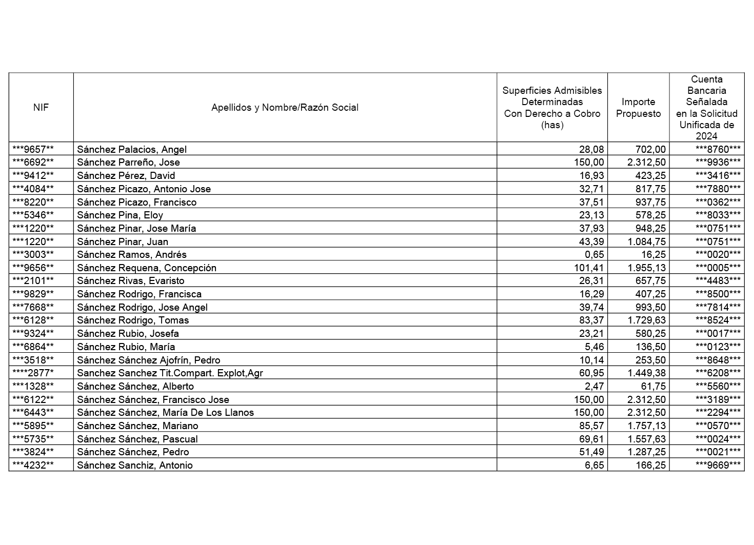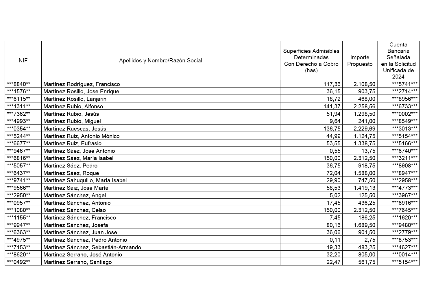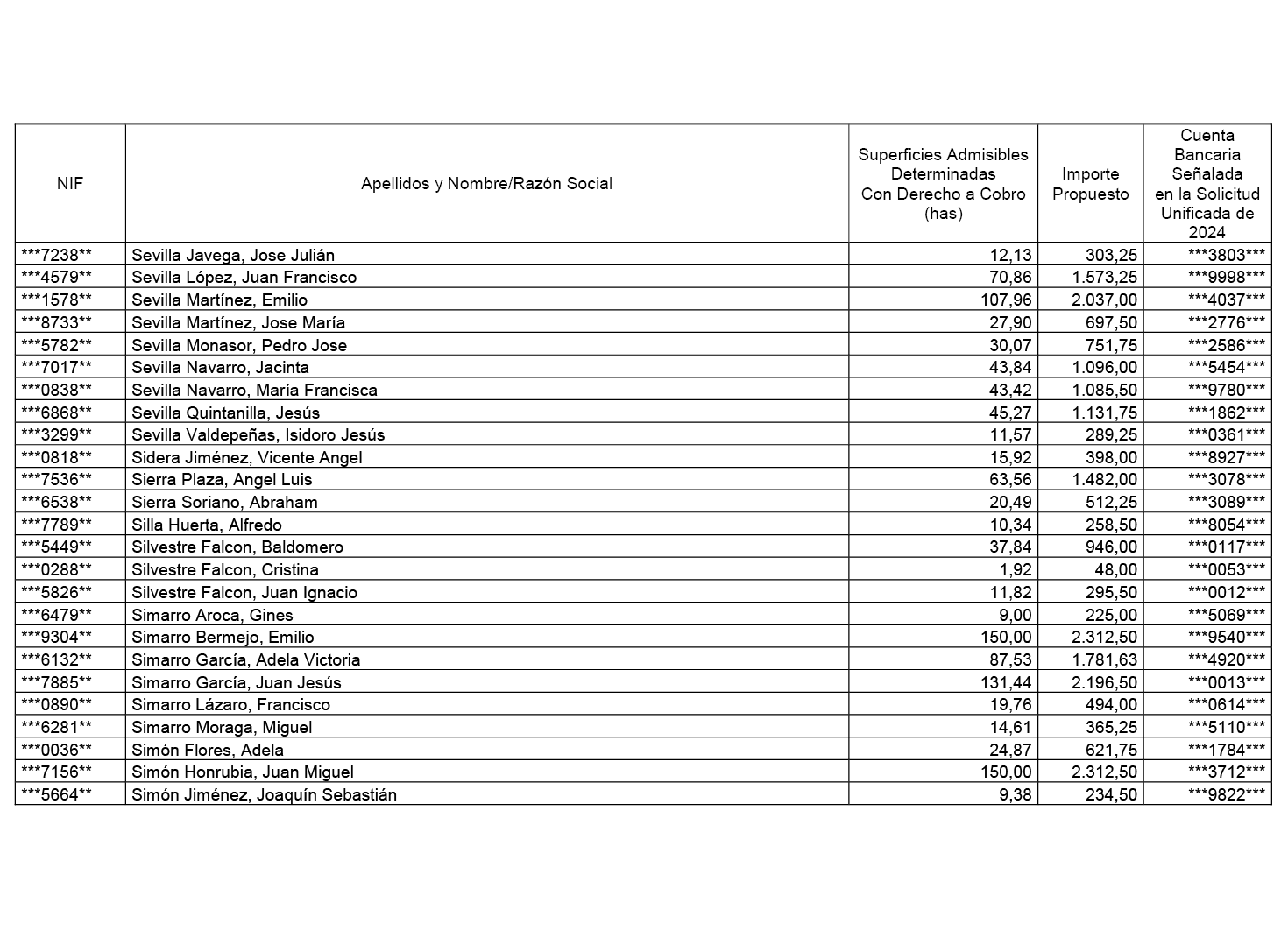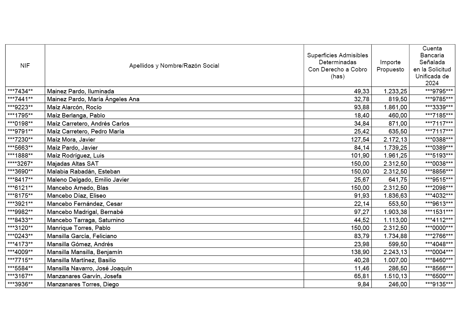 Vista la Propuesta de Resolución Definitiva de las ayudas previstas en el Decreto 59/2025, de 29 de julio, por el que se establecen las bases reguladoras, con carácter excepcional, en régimen de minimis, de ayudas dirigidas a personas titulares de explotaciones agrícolas de determinados sectores ubicadas en municipios de Castilla-La Mancha especialmente afectados por la sequía, durante el año hidrológico 2023-2024 y de conformidad con lo dispuesto en el artículo 6.3 del decreto referido que exige su publicación en el Diario Oficial de Castilla-La Mancha, con indicación, para cada una de las personas propuestas, de las superficies admisibles que motivan la concesión de la ayuda, los importes propuestos, así como los últimos dígitos de la cuenta bancaria señalada en la solicitud unificada de 2024, resuelvo: