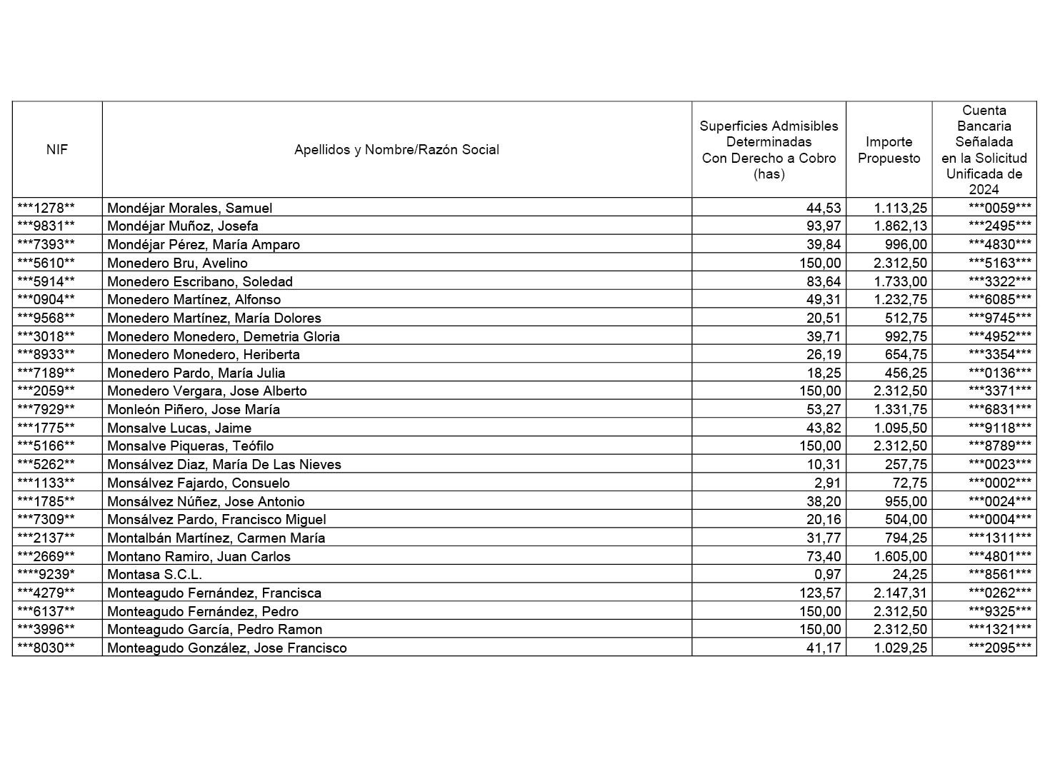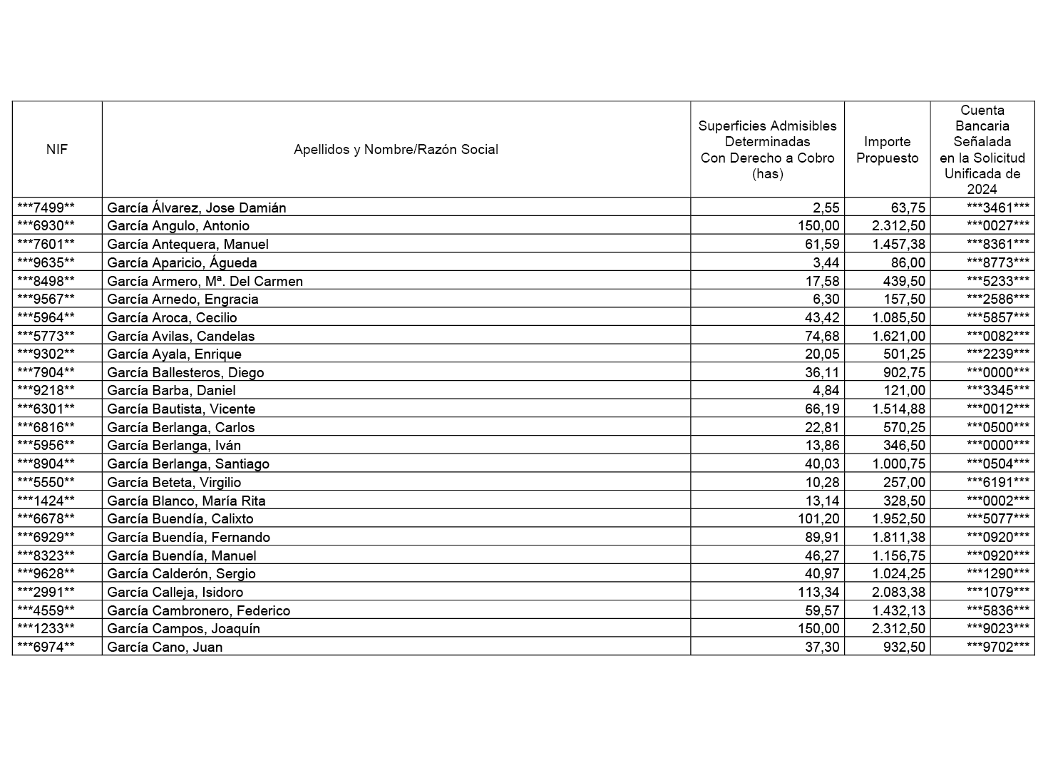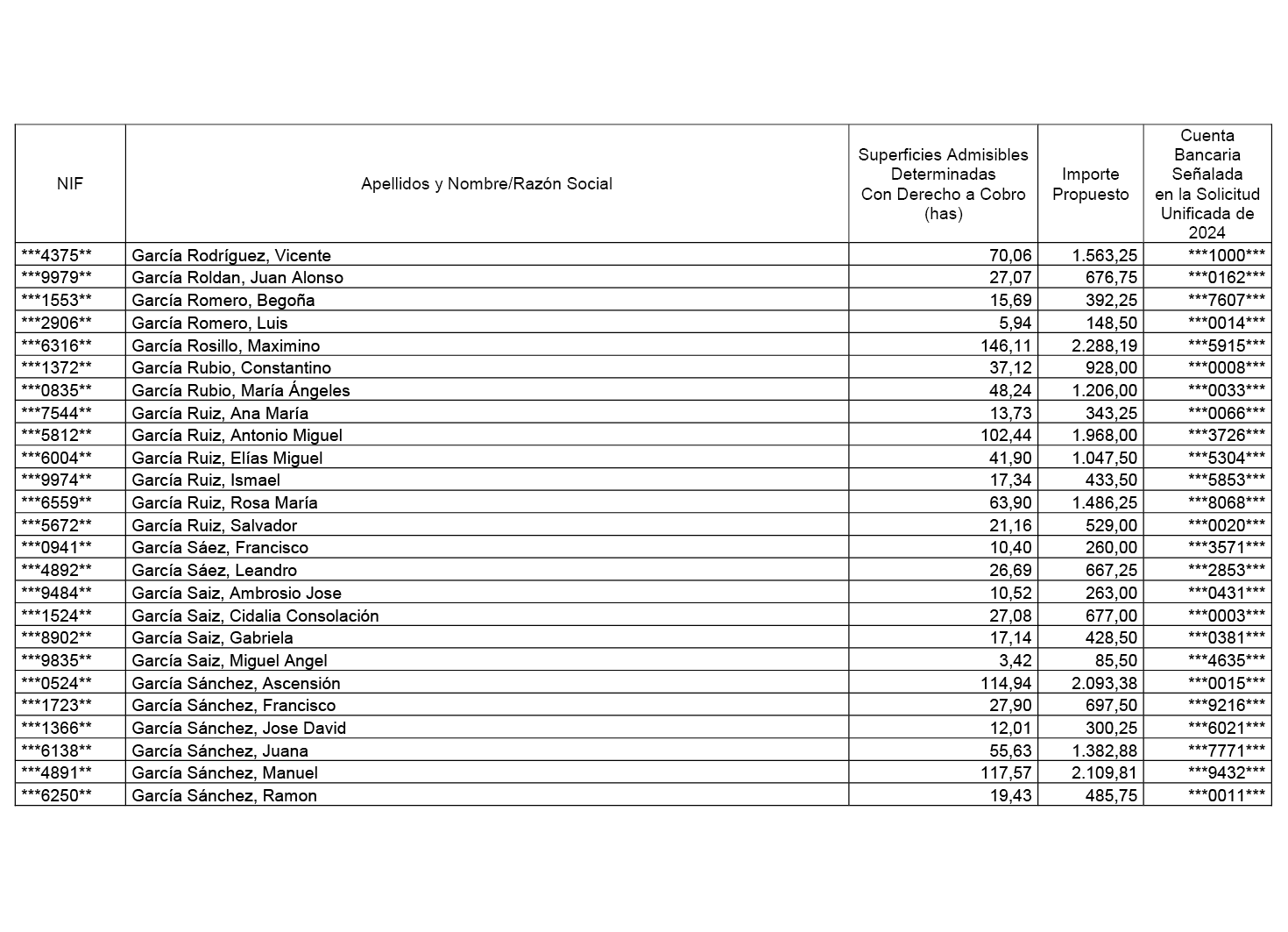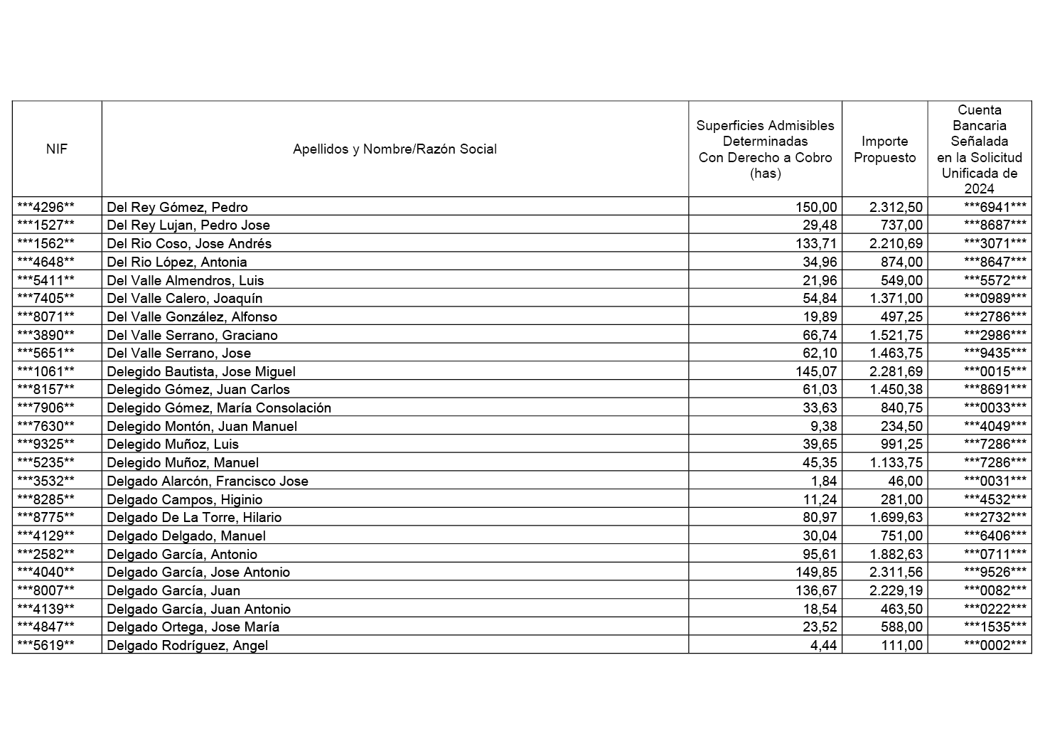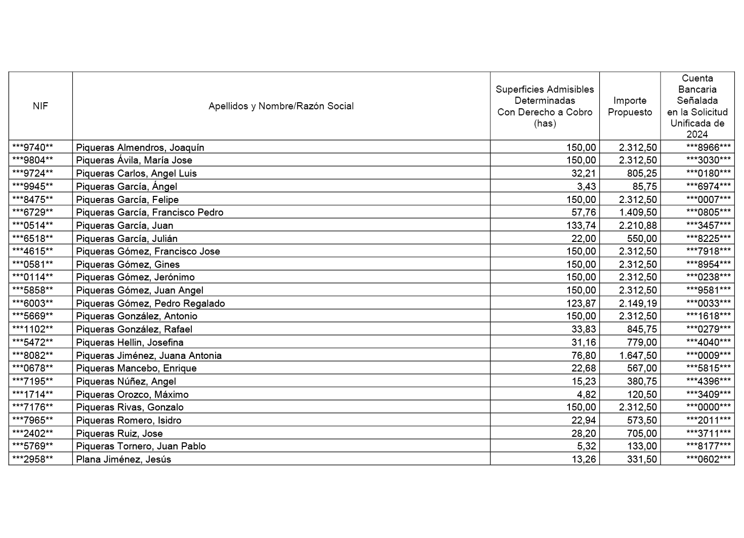 Vista la Propuesta de Resolución Definitiva de las ayudas previstas en el Decreto 59/2025, de 29 de julio, por el que se establecen las bases reguladoras, con carácter excepcional, en régimen de minimis, de ayudas dirigidas a personas titulares de explotaciones agrícolas de determinados sectores ubicadas en municipios de Castilla-La Mancha especialmente afectados por la sequía, durante el año hidrológico 2023-2024 y de conformidad con lo dispuesto en el artículo 6.3 del decreto referido que exige su publicación en el Diario Oficial de Castilla-La Mancha, con indicación, para cada una de las personas propuestas, de las superficies admisibles que motivan la concesión de la ayuda, los importes propuestos, así como los últimos dígitos de la cuenta bancaria señalada en la solicitud unificada de 2024, resuelvo: