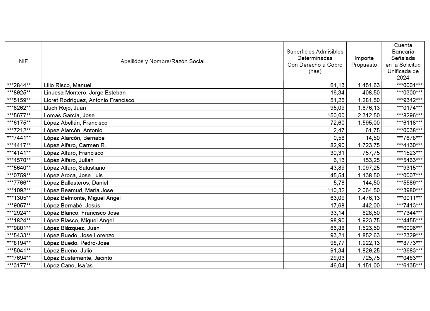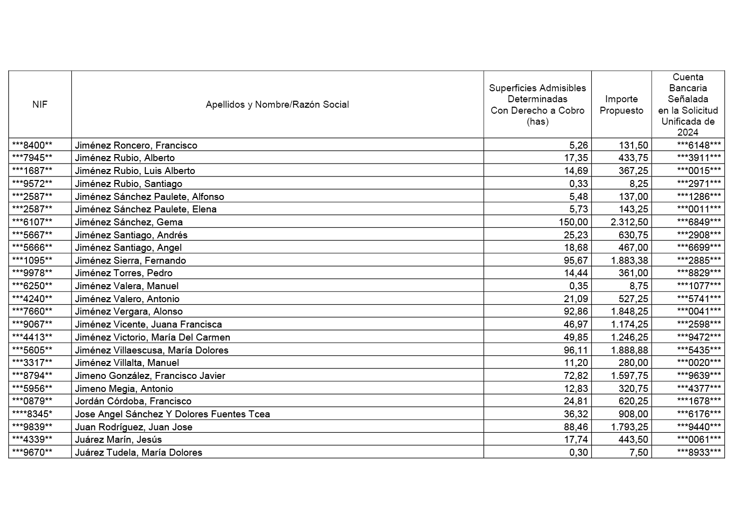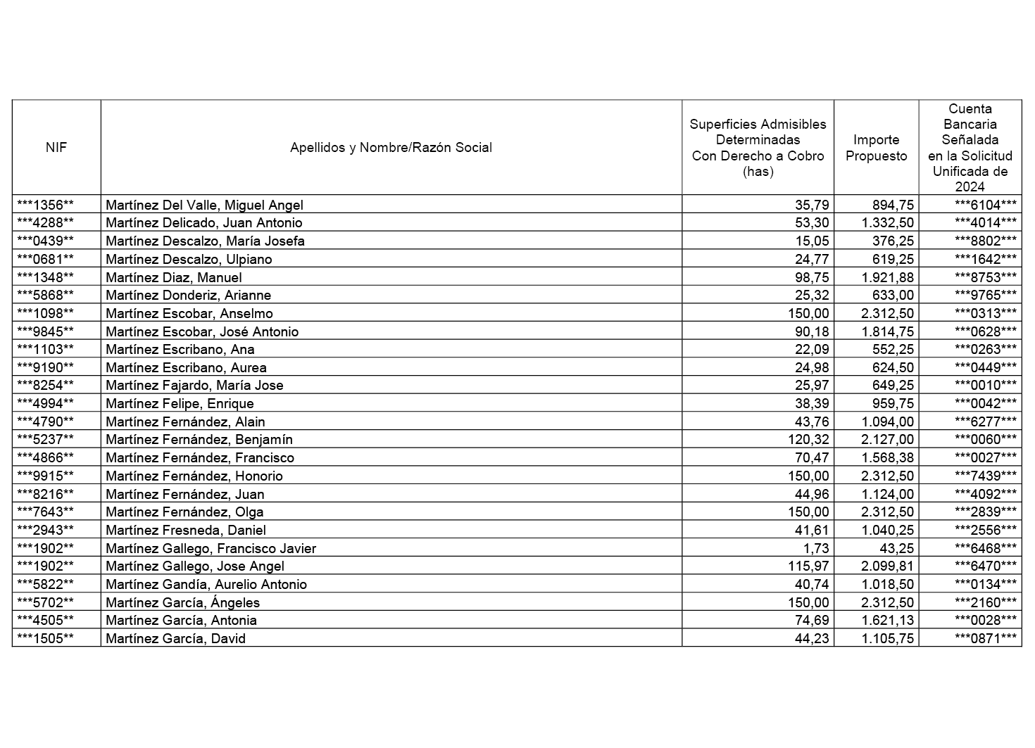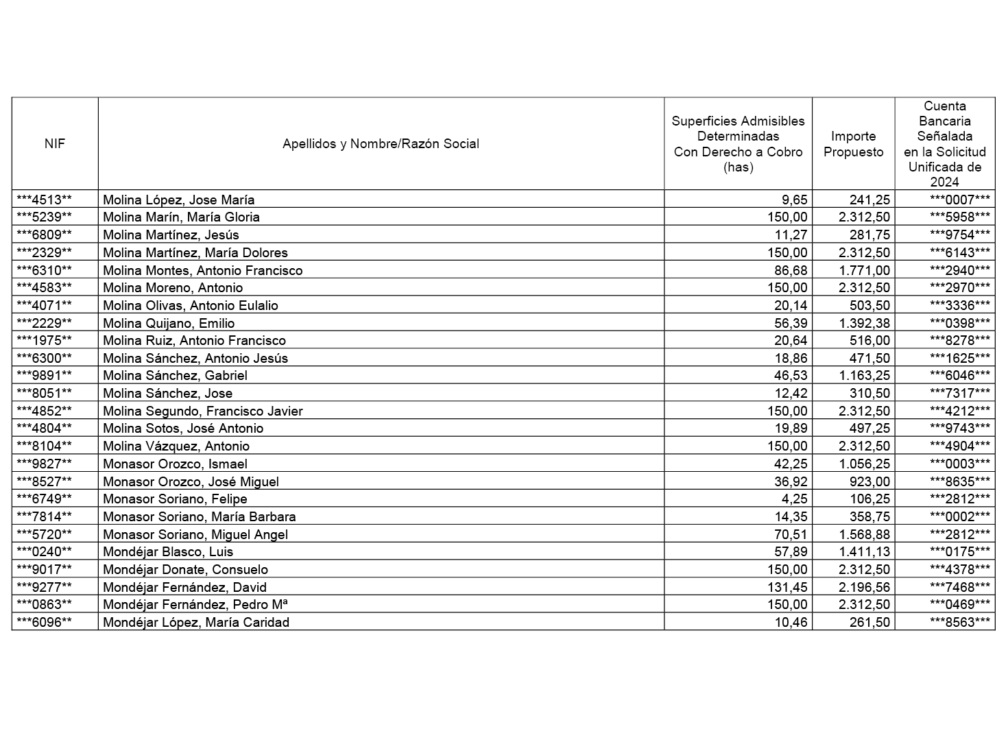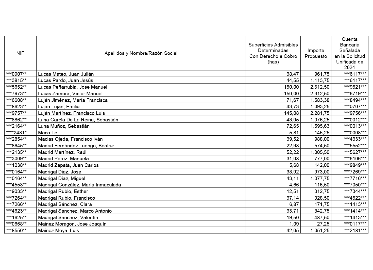 Vista la Propuesta de Resolución Definitiva de las ayudas previstas en el Decreto 59/2025, de 29 de julio, por el que se establecen las bases reguladoras, con carácter excepcional, en régimen de minimis, de ayudas dirigidas a personas titulares de explotaciones agrícolas de determinados sectores ubicadas en municipios de Castilla-La Mancha especialmente afectados por la sequía, durante el año hidrológico 2023-2024 y de conformidad con lo dispuesto en el artículo 6.3 del decreto referido que exige su publicación en el Diario Oficial de Castilla-La Mancha, con indicación, para cada una de las personas propuestas, de las superficies admisibles que motivan la concesión de la ayuda, los importes propuestos, así como los últimos dígitos de la cuenta bancaria señalada en la solicitud unificada de 2024, resuelvo: