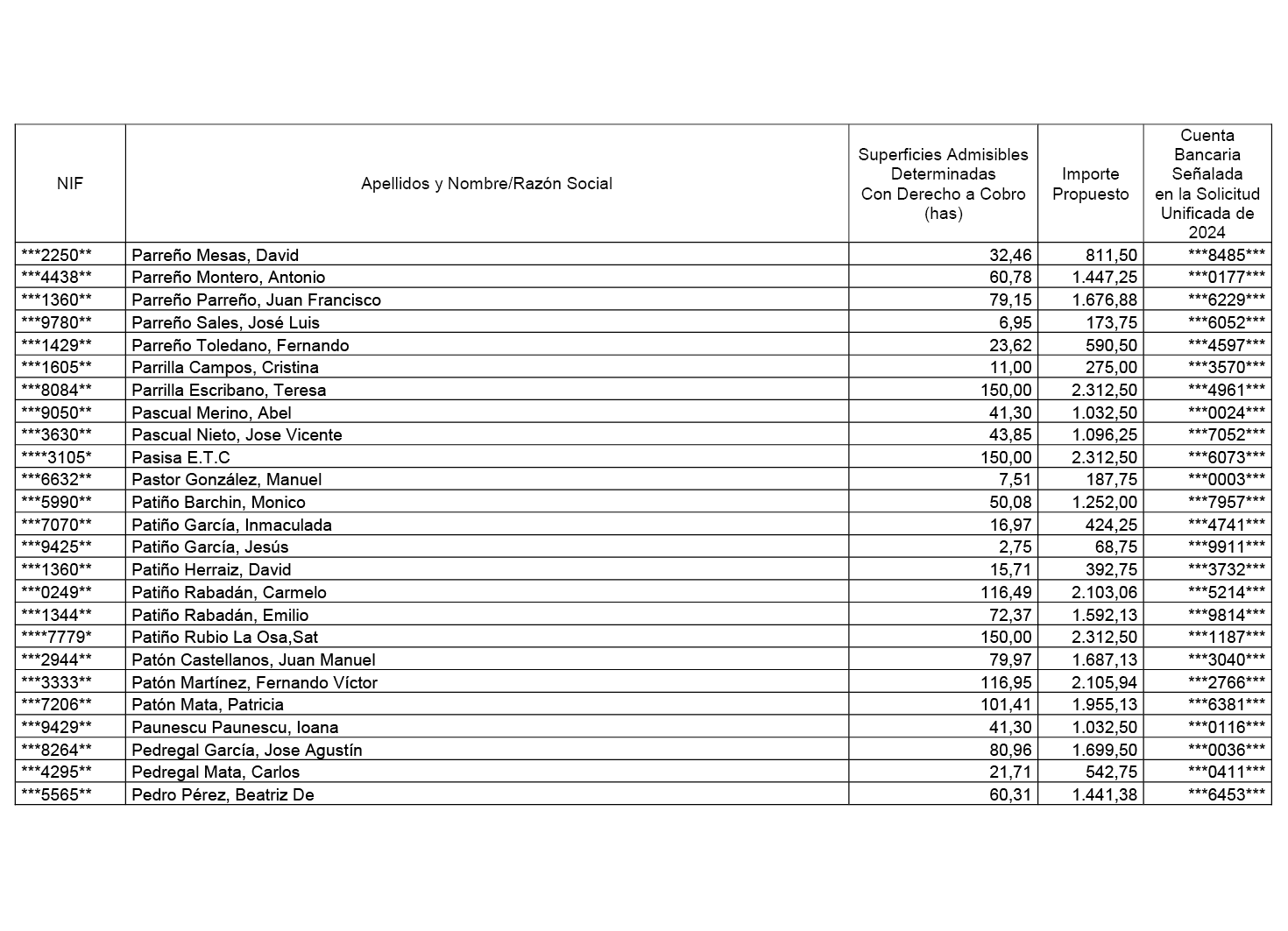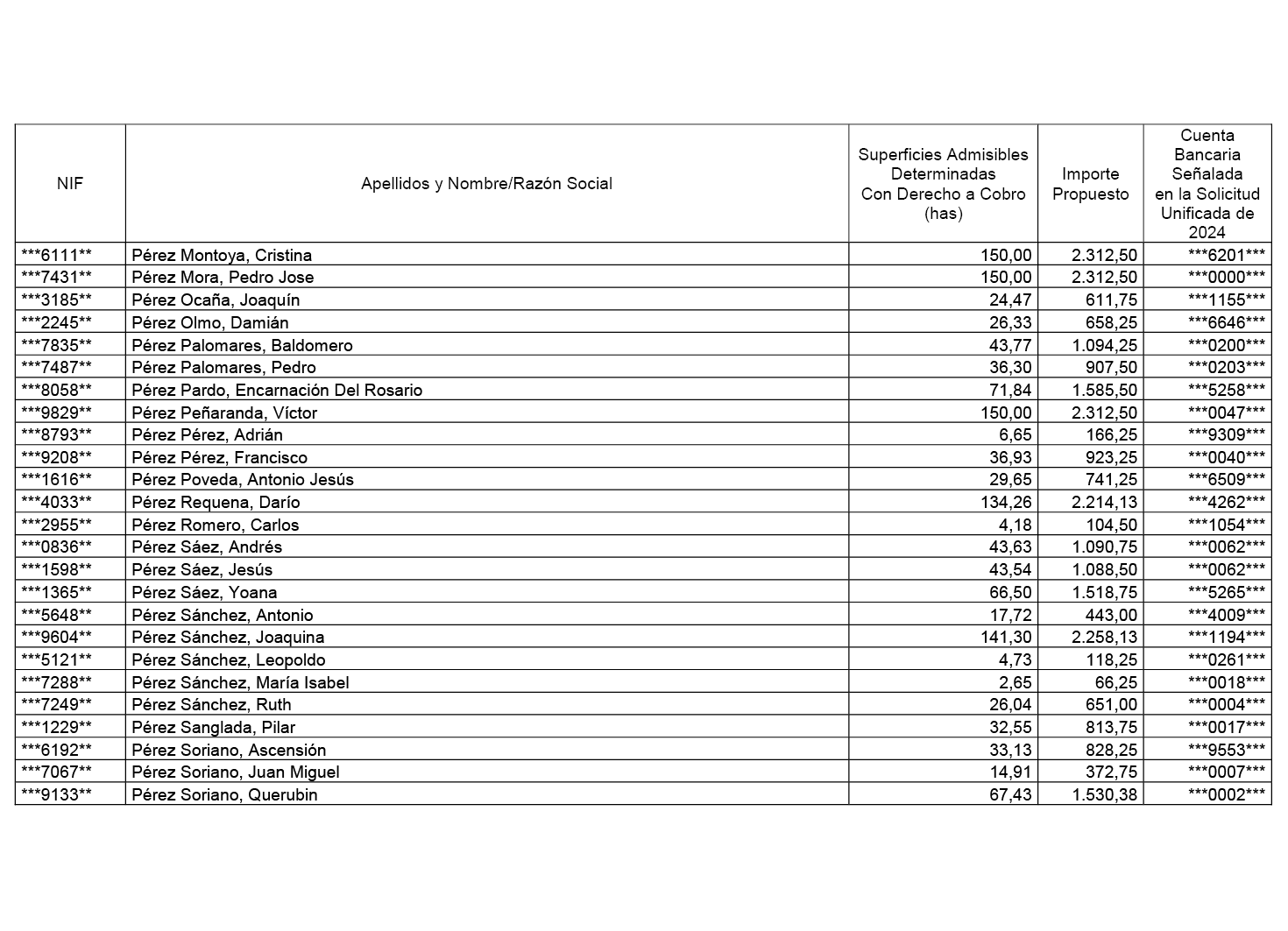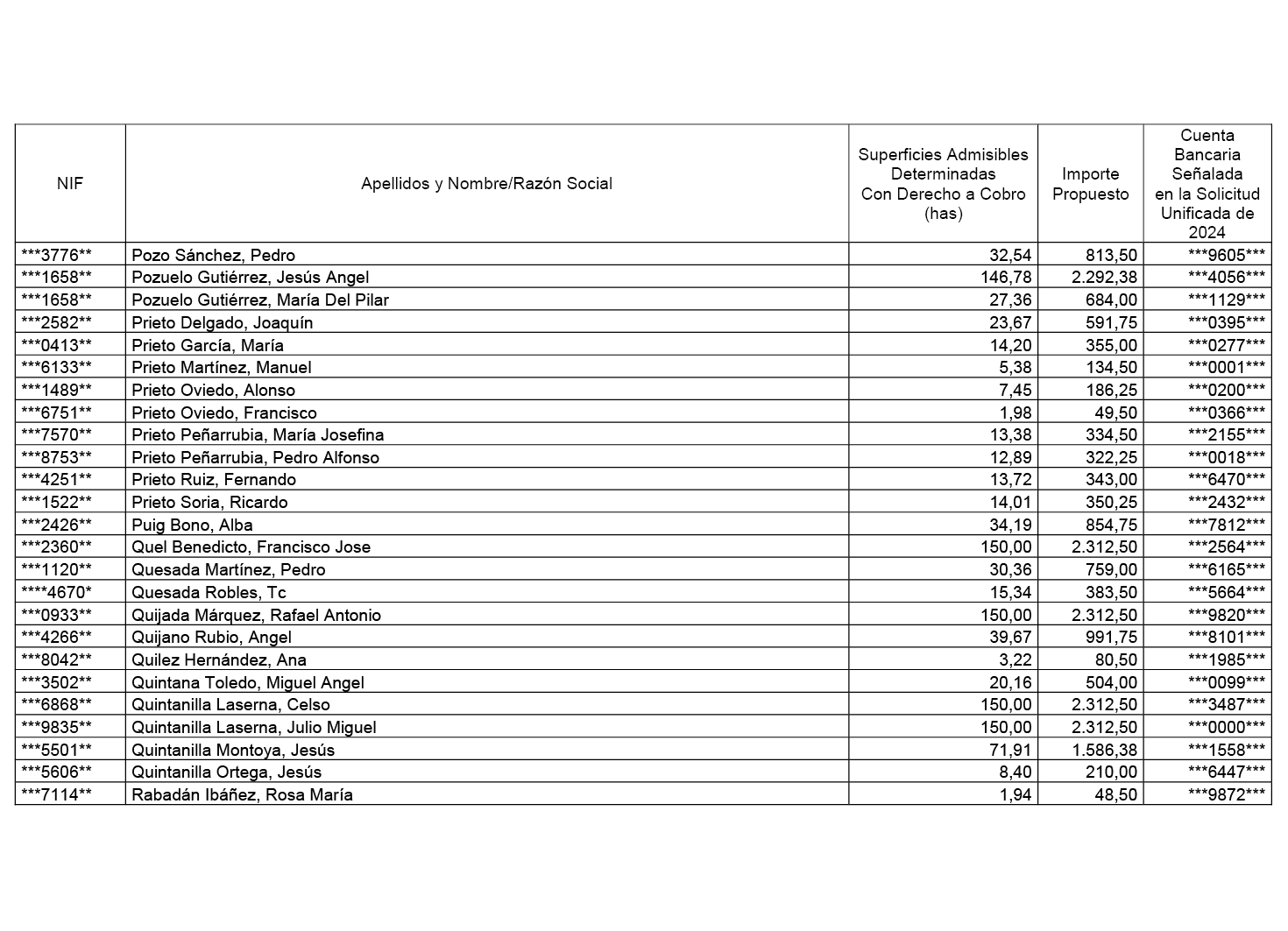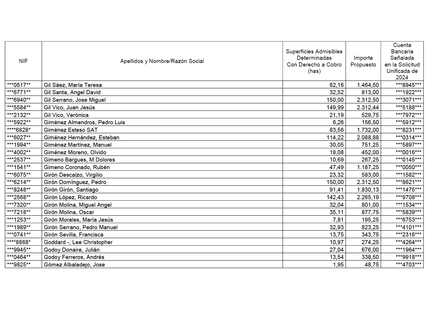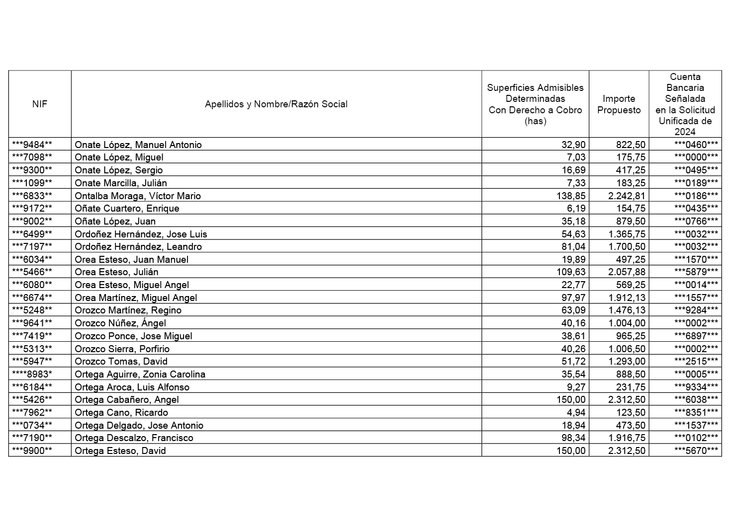 Vista la Propuesta de Resolución Definitiva de las ayudas previstas en el Decreto 59/2025, de 29 de julio, por el que se establecen las bases reguladoras, con carácter excepcional, en régimen de minimis, de ayudas dirigidas a personas titulares de explotaciones agrícolas de determinados sectores ubicadas en municipios de Castilla-La Mancha especialmente afectados por la sequía, durante el año hidrológico 2023-2024 y de conformidad con lo dispuesto en el artículo 6.3 del decreto referido que exige su publicación en el Diario Oficial de Castilla-La Mancha, con indicación, para cada una de las personas propuestas, de las superficies admisibles que motivan la concesión de la ayuda, los importes propuestos, así como los últimos dígitos de la cuenta bancaria señalada en la solicitud unificada de 2024, resuelvo: