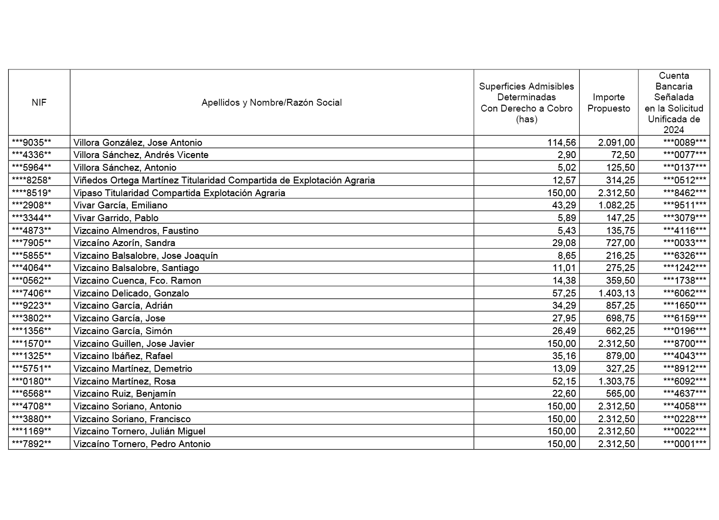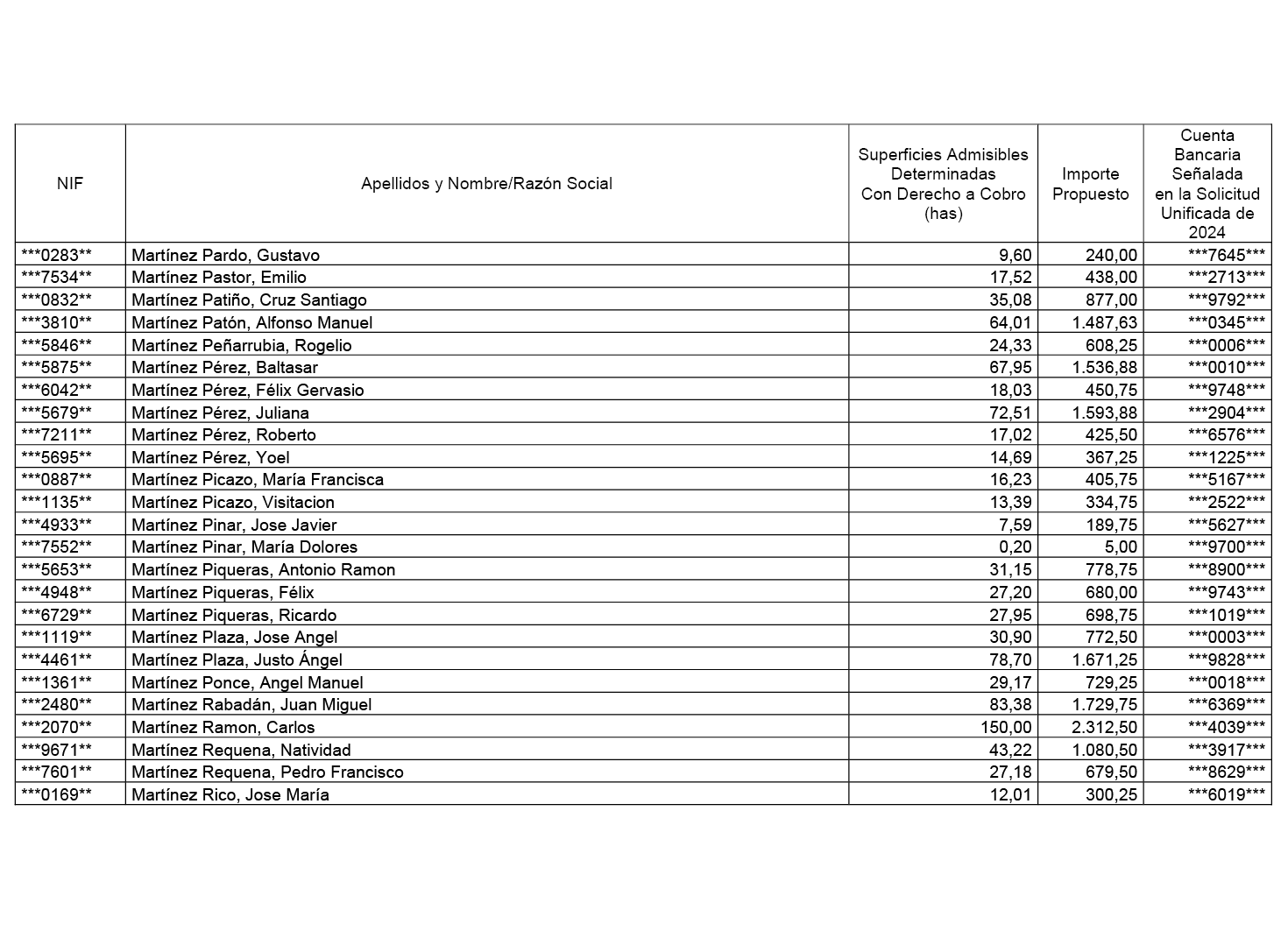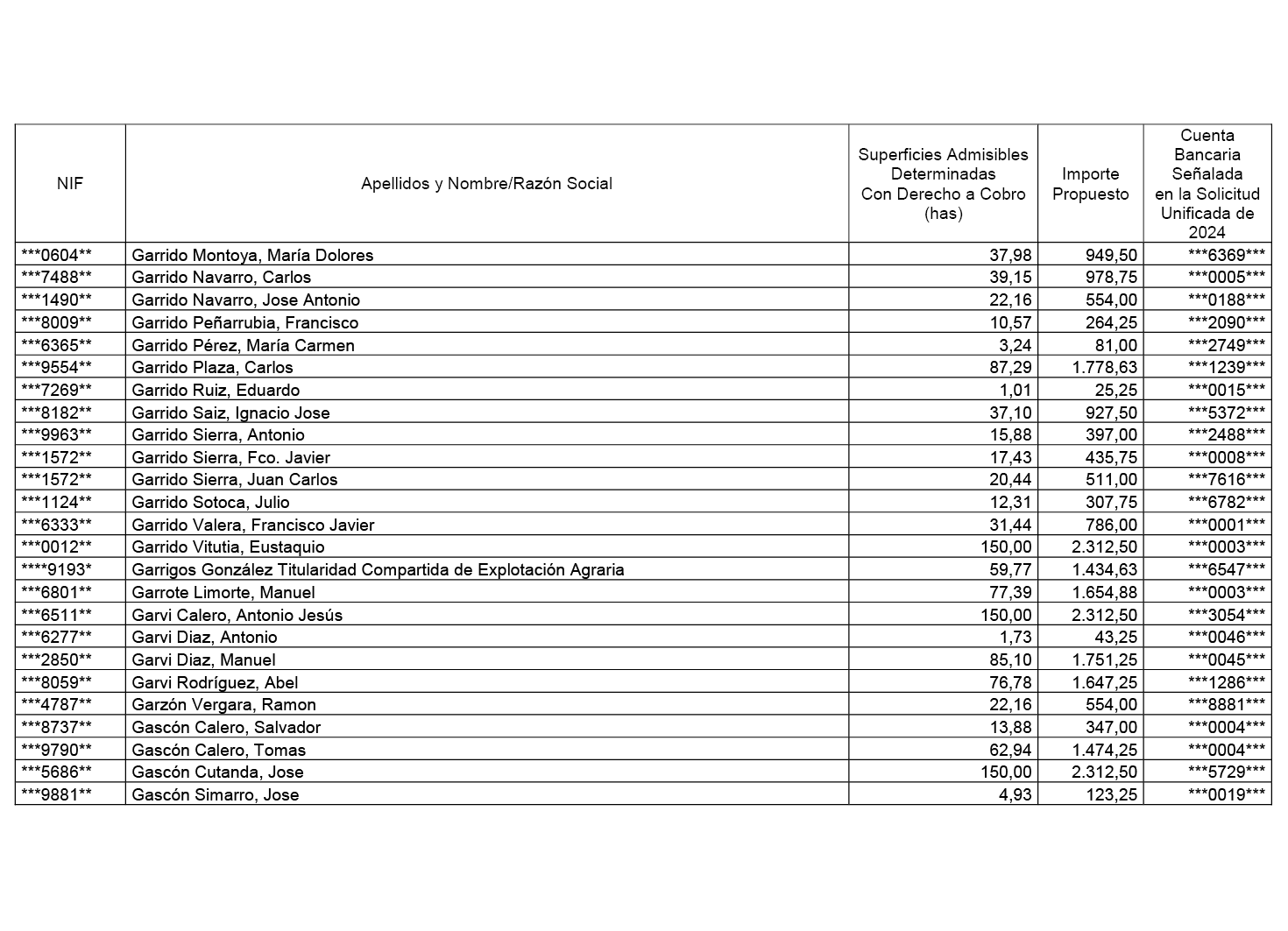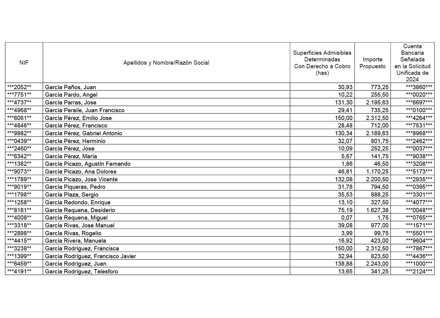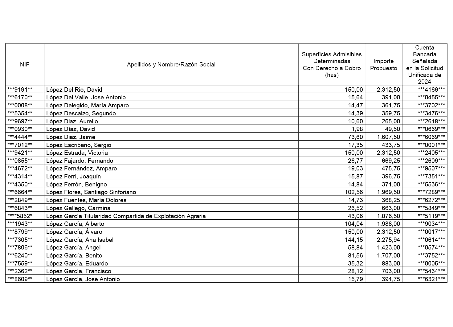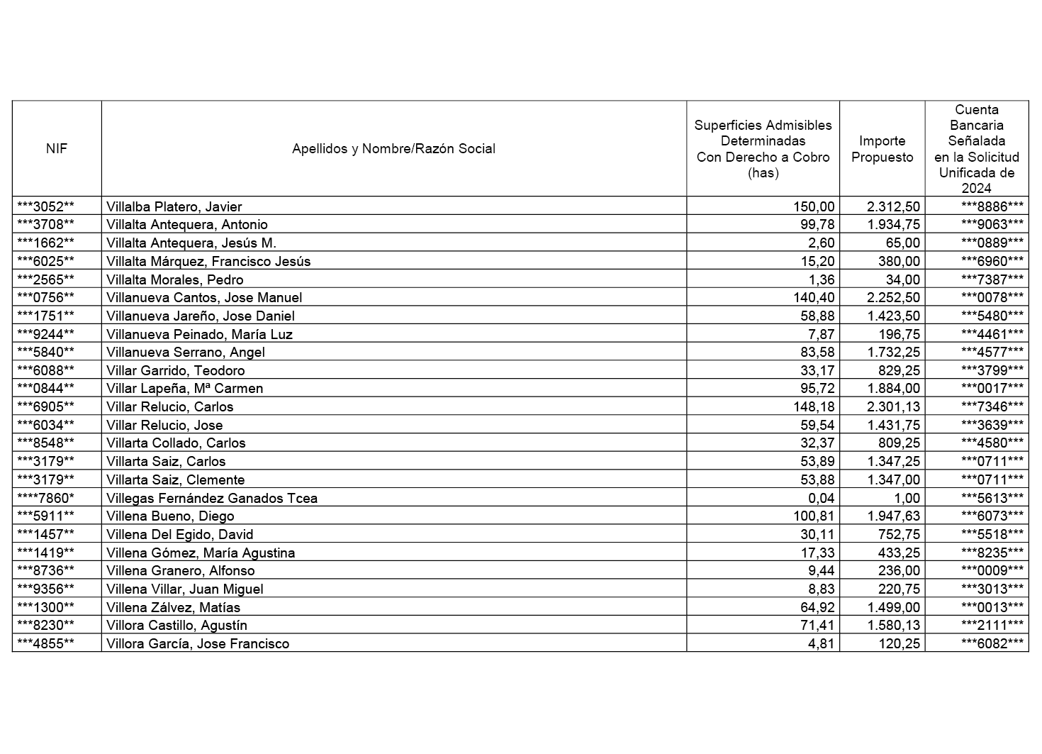 Vista la Propuesta de Resolución Definitiva de las ayudas previstas en el Decreto 59/2025, de 29 de julio, por el que se establecen las bases reguladoras, con carácter excepcional, en régimen de minimis, de ayudas dirigidas a personas titulares de explotaciones agrícolas de determinados sectores ubicadas en municipios de Castilla-La Mancha especialmente afectados por la sequía, durante el año hidrológico 2023-2024 y de conformidad con lo dispuesto en el artículo 6.3 del decreto referido que exige su publicación en el Diario Oficial de Castilla-La Mancha, con indicación, para cada una de las personas propuestas, de las superficies admisibles que motivan la concesión de la ayuda, los importes propuestos, así como los últimos dígitos de la cuenta bancaria señalada en la solicitud unificada de 2024, resuelvo: